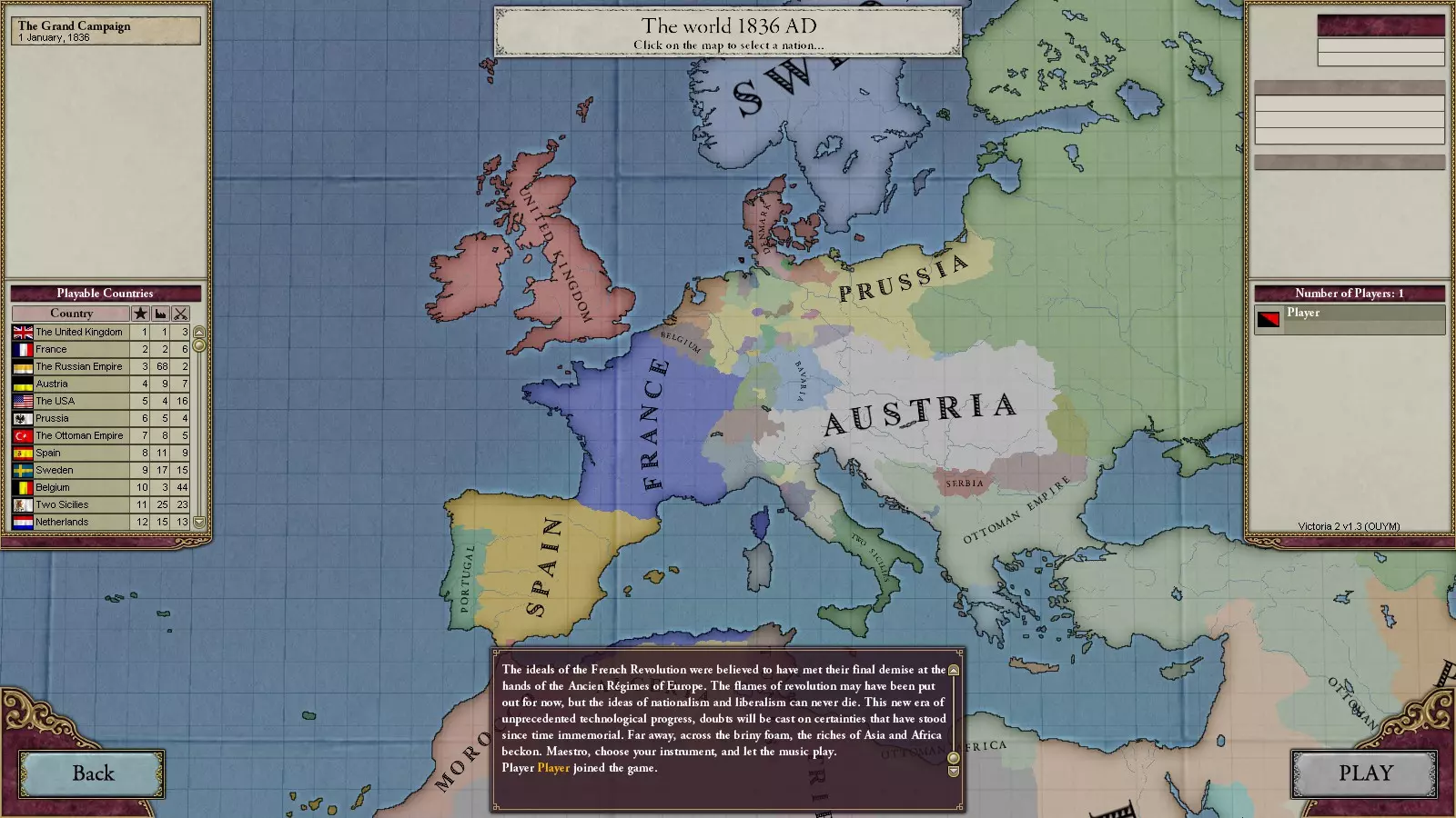 开始新游戏时,我们将看到世界地图、可用战役列表及其对应的存档(原版游戏只有一个战役,从DLC【A House Divided】开始则有两个)、战役或存档时间点存在的国家列表,以及您所选国家的简要介绍。如果是多人游戏,在国家介绍下方还会显示玩家列表及其选择的国家。当您选择国家并开始新游戏后,您将再次看到世界地图。地图将处于【物理地图】模式,并聚焦于您国家的边界。可以在右下角小地图上方切换地图模式。
