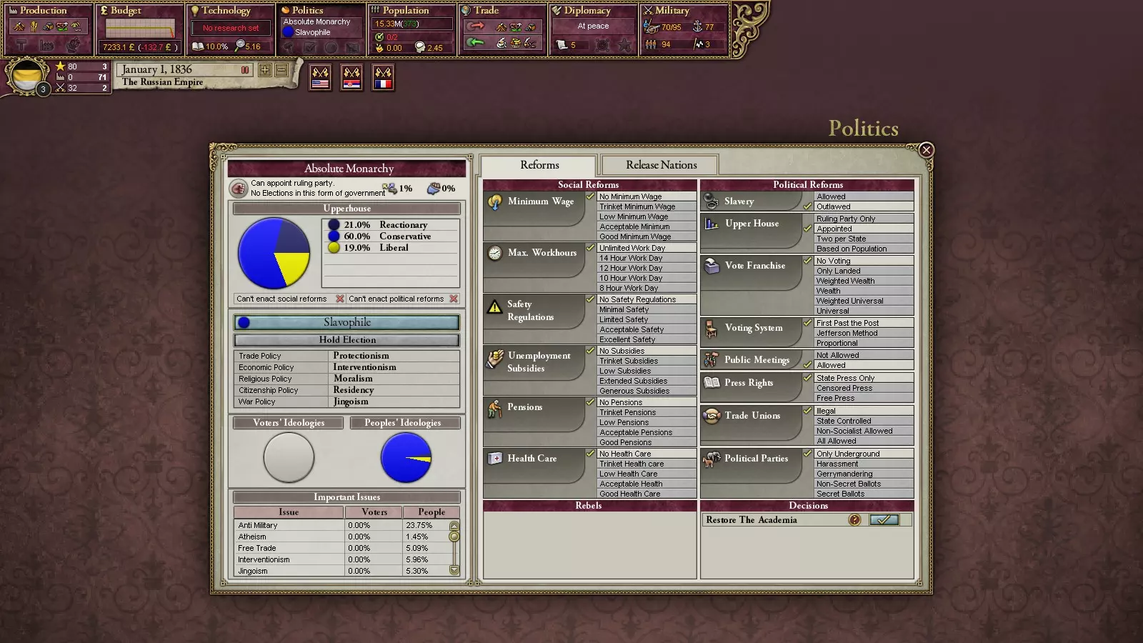 如果我们点击位于左上角、从主面板下方突出显示的本国国旗,就会看到所谓的【外交界面】。这里包含了当前世界及各大强国的武装冲突概况,DLC中还包含危机概况(游戏初期几乎不会出现危机,不过这一点稍后再详细说明)以及某国正在为对他国发动战争寻找借口的相关信息(如果已知的话)。右侧是您所选国家的属性:具体包括国家旗帜、名称、地位、政体形式、执政党及其意识形态(彩色圆圈)。点击后会打开国内政策界面。在此处,您可以在特定条件下进行社会政治改革,任命执政党(在某些政体下,如任何君主制和任何独裁制),查看当前国内所有现存政党及其意识形态,以及它们执政时将实施的法律(如经济体系、地缘政治学说、对少数民族的态度等)。这里还包含有关特定意识形态的人口(以及选民,如果正在进行选举的话)所占百分比,以及他们对特定议题(例如良好的医疗保健和新闻自由)的关注程度的信息,同时还会显示您的国家是否正在举行选举,以及如果计划举行下次选举的日期。在下一个标签页中,您可以接受可用的决议;在最后一个标签页中,您可以给予您组成内的现有国家独立。 下一个按钮显示您国家的男性人口数量(鼠标悬停时显示全国总人口)。点击后会打开一个部分,提供关于人口的详细摘要:民族、宗教、阶级及其他构成。左侧是可查看本国各省份/地区相关数据的按钮。下方显示某一省份、某一地区或全国的阶级代表人数、民族及宗教信徒人数,以及他们的财富状况。总体而言,这里的内容也都直观易懂。 下一个按钮显示贸易情况,点击后会打开贸易板块。这里可以查看贸易额并调整特定商品的流通。操作直观易懂。默认情况下,所有流程均为自动。 下一个按钮显示当前交战对象以及外交点数数量(拥有外交点数才能执行地缘政治行动。若外交点数为0,则无法执行此类行动)。点击该按钮会打开与点击本国国旗时相同的界面。下一个按钮显示您国家的军事和海军力量。点击后会打开武装力量管理界面。在这里可以用领导力点数招募将军/海军上将,组建新的旅/舰队。还可以在此处启动全面动员。 游戏基础,国内政治 游戏目标:获得最多的分数(简单来说:成为国家列表中的第一名)并存活到1936年。不过,玩家可以拥有任何自己想要的目标。你可以征服整个世界,创建或重建某个帝国(例如拜占庭帝国)。一切都只受限于你的想象力以及游戏的各种特性(例如,征服世界会受到时间限制,而且不能直接吞并大国,只能逐个地区夺取。此外,在DLC中,没有正当理由也不能宣战)。国家类型 国家分为四种类型: 1. 大国——顾名思义。可以拥有势力范围且不会被纳入其他国家的势力范围,会参与危机事件(仅DLC可用)。图标为带有大型花纹的金色圆环; 2. 殖民国家——尚未成为大国,但已非普通国家。可以对未被占领的地区进行殖民。图标为金色圆环; 3. 文明国家——普通国家图标为金属圆环; 未开化国家指拥有传统社会和农业经济的国家。无法研究技术,必须通过研究特殊技术发展为文明国家。与文明国家不同,未开化国家研究特殊技术是瞬时完成的。研究点数获取缓慢,无法一次性进行多项研究。再往下是:工业实力、军事与海军实力、殖民实力、文化信息,再往下是某一列强在所选国家的影响力,以及再往下是对所选国家的地缘政治行动。左下角是当前所有国家的列表,控制你在这些国家中影响力的按钮(如果你是列强的话),以及其他特征。分为三个子类型:落后国家(0%西化度)、未开化国家(西化度低于55%)和部分西化国家(西化度55%及以上)。这些子类型之间没有原则性区别。图标为木质圆环。 大多数类型会随着胜利点数的获取而变化。胜利点数取决于国家的工业数量(工业实力)、海军和殖民实力以及威望。随着某些要点的减少,国家类型可能会降低(例如,可能会从大国降级为殖民地,甚至文明国家)。通常情况下,国家无法降级为未开化国家(只有当未开化国家吞并文明国家后又将其解放时才会发生这种情况,目前尚不清楚这是漏洞还是特性)。 国内政治比外交政策要广泛得多。总的来说,国内政治在于建立一个伟大的国家。外交政策只是对这一进程的补充或促进。让我们按顺序来了解一切。 国家体制 这里我姑且将国家的统治形式、政治改革和政党都包含在内。从游戏玩法来看,最理想的是民主制(尽管它也并非没有一些缺点)。为什么呢?因为人民对它显然很满意。在这种体制下,革命和不满情绪是最少的。有两种政体可供选择——【君主立宪制】(DLC中的名称,原版为“王室统治”)和【共和制】(DLC中的名称,原版为“民主制”)。两者的区别仅在于一点:君主制下几乎可以任命任何执政党,而共和制则不行。 主要缺点是什么呢?那就是选举中可能会出现你不喜欢的政党获胜。不过在君主制下,很容易更换政党。而且在这种体制下,民众的觉悟很高。 还有很多其他体制,比如共产主义、法西斯主义、反动独裁、自由意志主义独裁、绝对君主制。这些体制在玩法上差异不大。所有独裁体制的区别仅在于执政意识形态。在绝对君主制下没有选举,可以任命几乎任何政党。 对玩法影响更大的是改革。它们分为政治改革和社会改革。政治改革决定国家的政治体制,包括国家将举行何种选举、新闻自由程度、奴隶制地位,以及选举和议会的产生原则等。