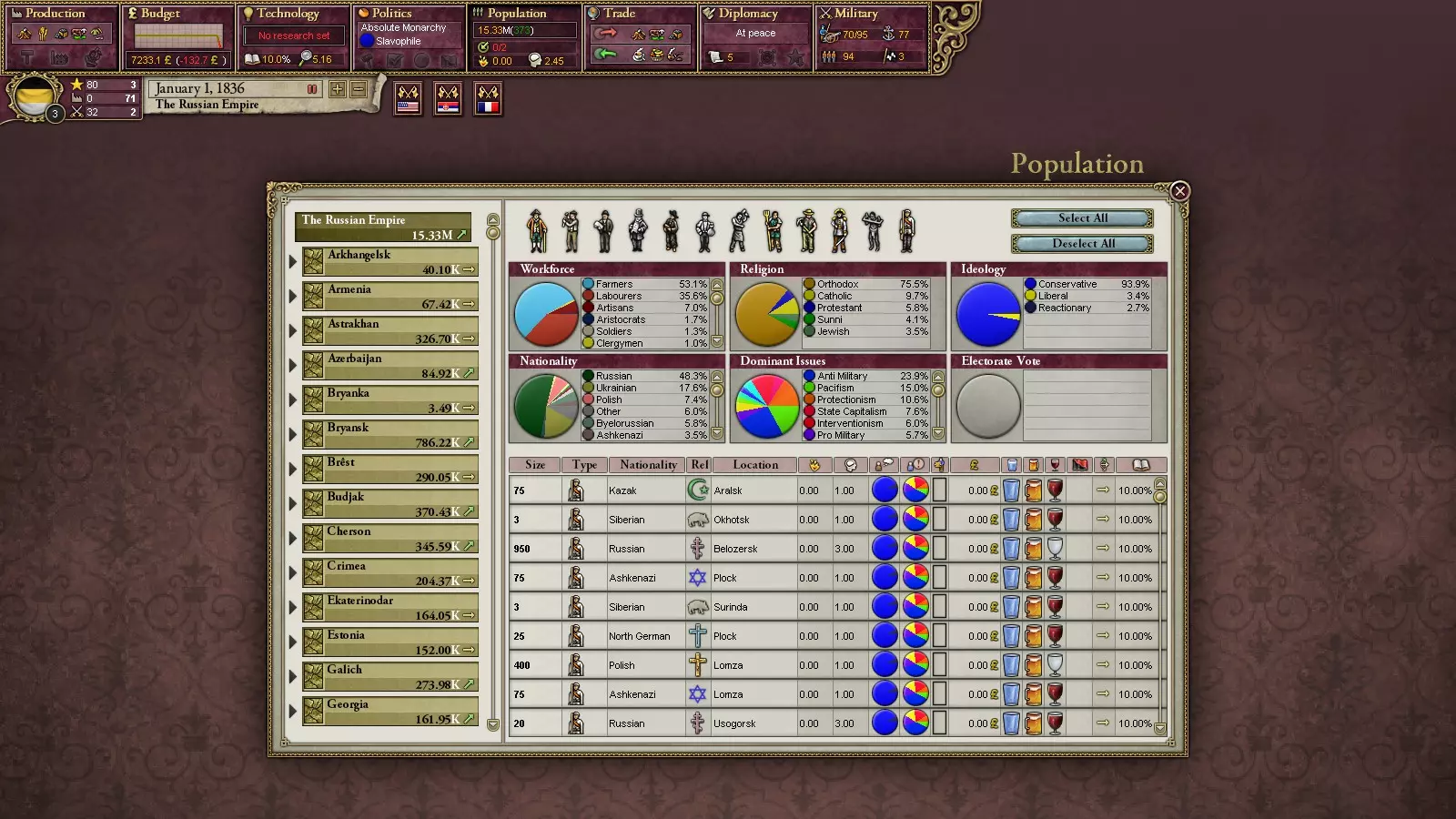 人口 游戏中同样重要的组成部分。他们的意愿有时需要你去满足。他们会加入你的军队,去征服一切。人口分为不同阶级,每个阶级包含不同职业的人群。说到军队:除了士兵,农民和工人也会在全面动员时成为军队的骨干,但他们的单位战斗力极弱,不过这一点后面再详细说明。各行各业的从业者都能在国家的不同领域发挥作用:农民、工人、手工业者将构成你的劳动力,他们的数量越少,工厂的状况就越糟。士兵是组建军队所必需的,其数量越少,你的旅级部队兵力就越少。官员数量越少,管理效率就越低;资本家数量越少,新项目的投资者就越少。提高特定人群的数量并不难:可以通过区域优先级(支持工人、工匠、官员等),或者为此创造条件(比如,没有工厂的国家自然不会有工人,对吧?)。 此外,人口还具有意识和攻击性等特征。两者的增长取决于不同因素,但往往取决于您在各类事件中的选择(因此,不要随意点击,也不要基于个人观点来回答,而是查看不同选择会导致的结果)。此外,随着民众识字率的提高以及国家拥有大量【BB】,意识也会增长。意识会影响民众对改革以及整体政治的关注程度,而攻击性则会影响叛乱者起义的几率和地区紧张局势的加剧。