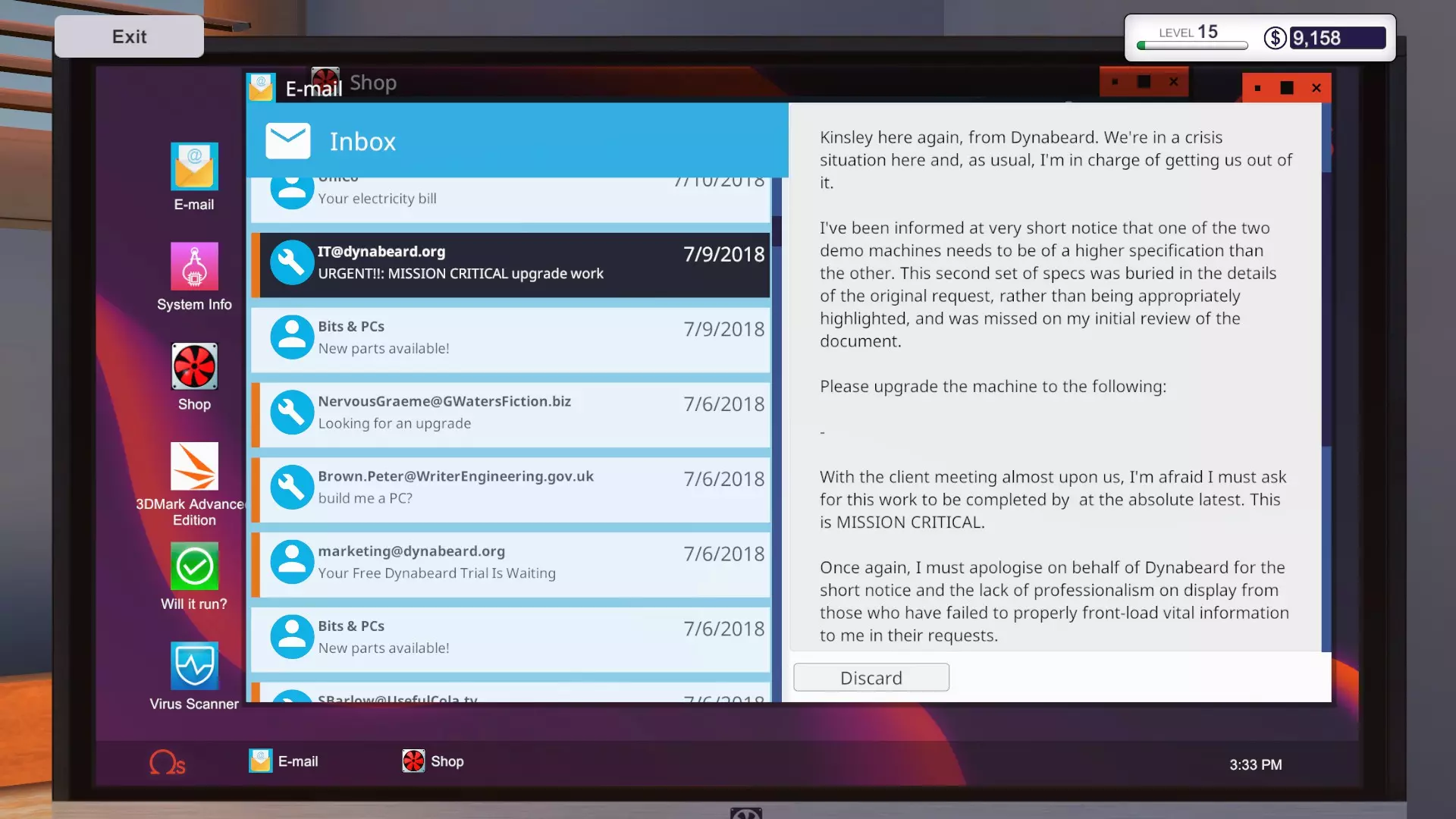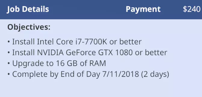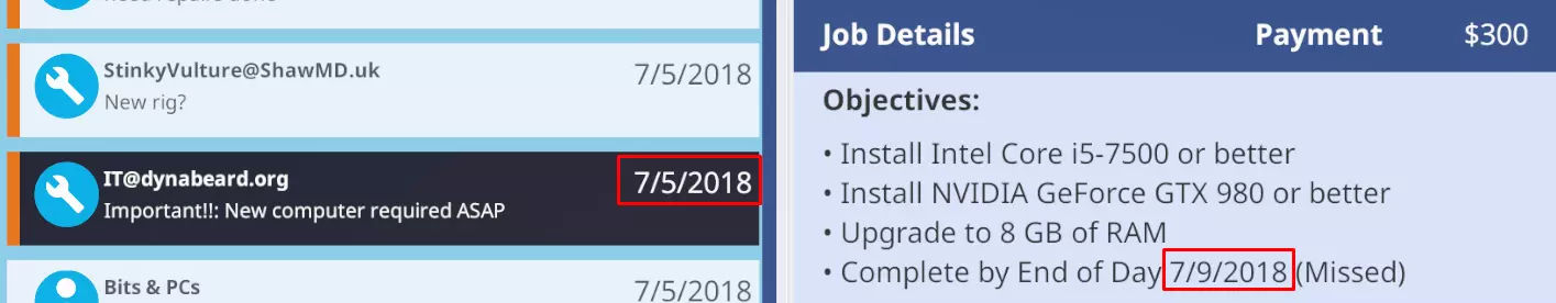 这份工作至少要花830美元(如果选择次日达则是850美元)。扣除300美元的报酬后,我们在这份工作上至少还要亏损530美元!我接下这个任务是希望之后能有大钱入账,就像某个剧情里你表面上被骗了,但实际上最后收到了很多现金那样。但这个剧情完全不是那样,这是你能在《装机模拟器》中遇到的最纯粹的“坑”! 第二份工作 收到了以下邮件: