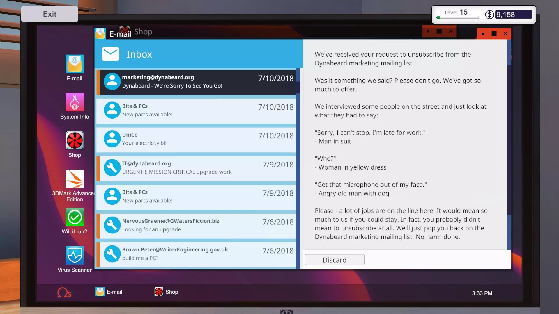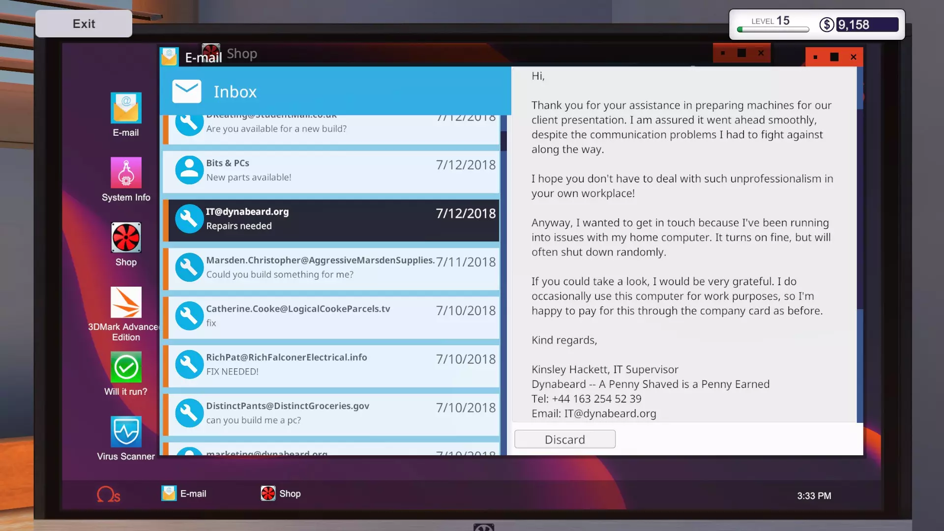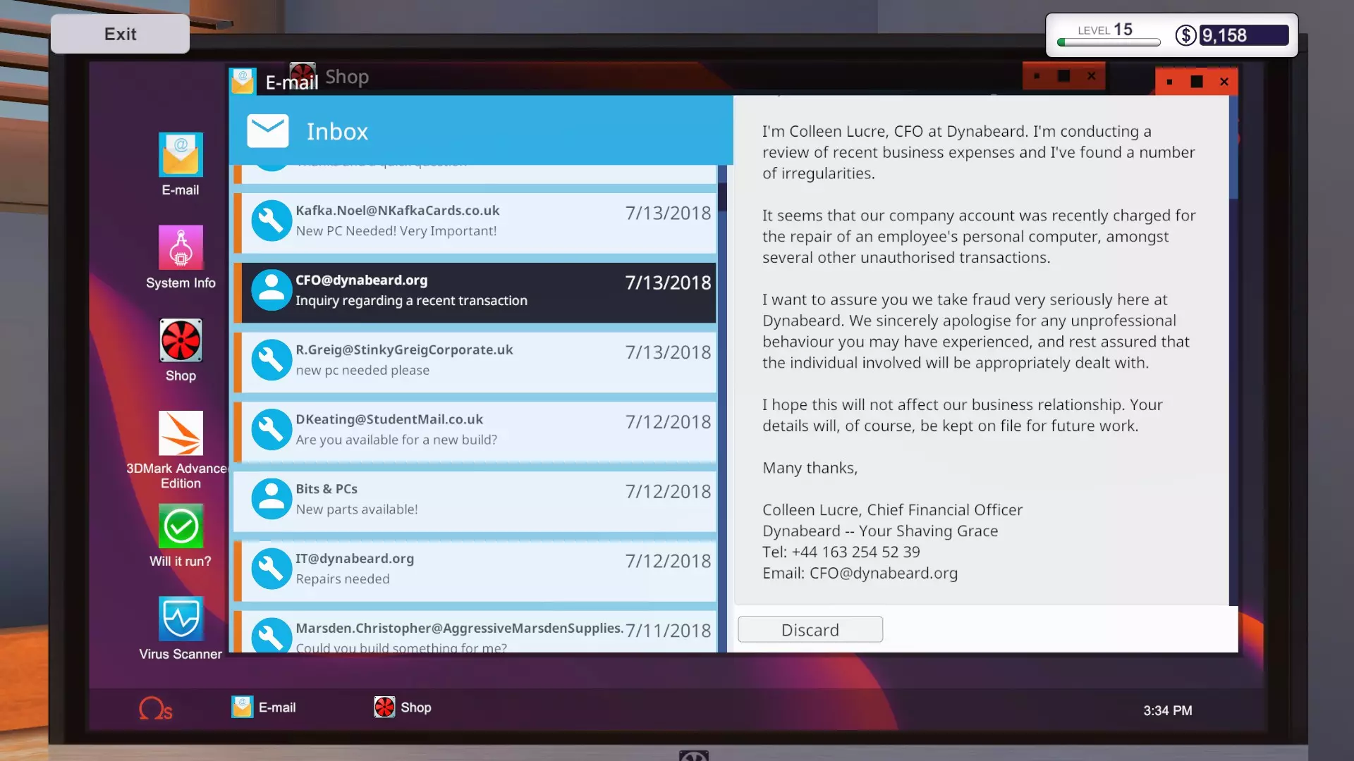 惊喜,惊喜:这是你为公司组装的升级版1080电脑! 这个任务没有截止日期,而且和其他工作不同,它确实能让你盈利。唯一损坏的部件是机箱自带的120毫米Mortoni风扇。你将获得250美元的报酬,但这与本阶段早些时候造成的约2000美元损失相比微不足道(如果你购买了和我完全相同的部件,损失则为2455美元)。 另外,如果你手边没有风扇,至少需要支付20美元(风扇10美元+选择3-5天配送的运费10美元),因此总利润最多为230美元。 总体而言,本阶段至少造成了2225美元的损失! 尾声 这场“噩梦”一旦结束。你将收到另外三封邮件: 第一封来自Dynabeard的首席财务官,他表示公司通过在你的店铺购买和升级电脑进行了未授权交易。因此,所有这些工作不仅造成了巨大的金钱损失,而且属于欺诈行为。