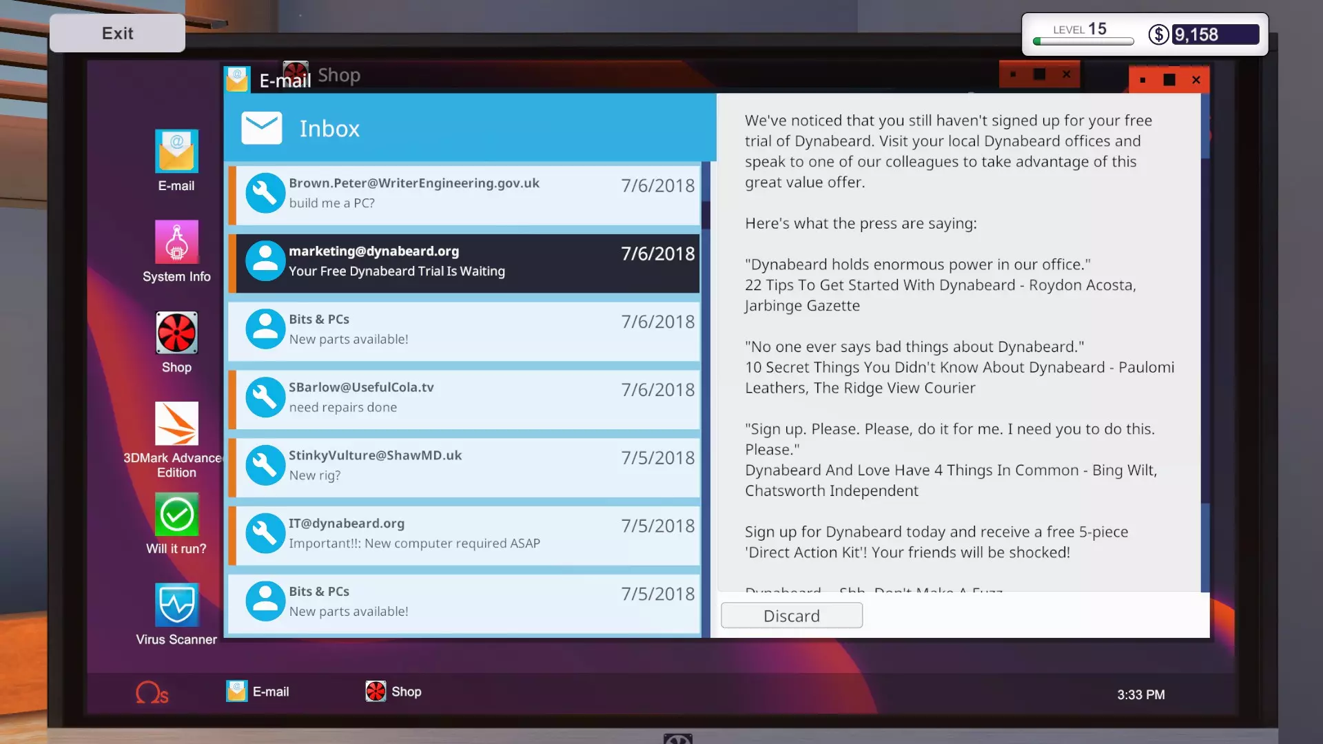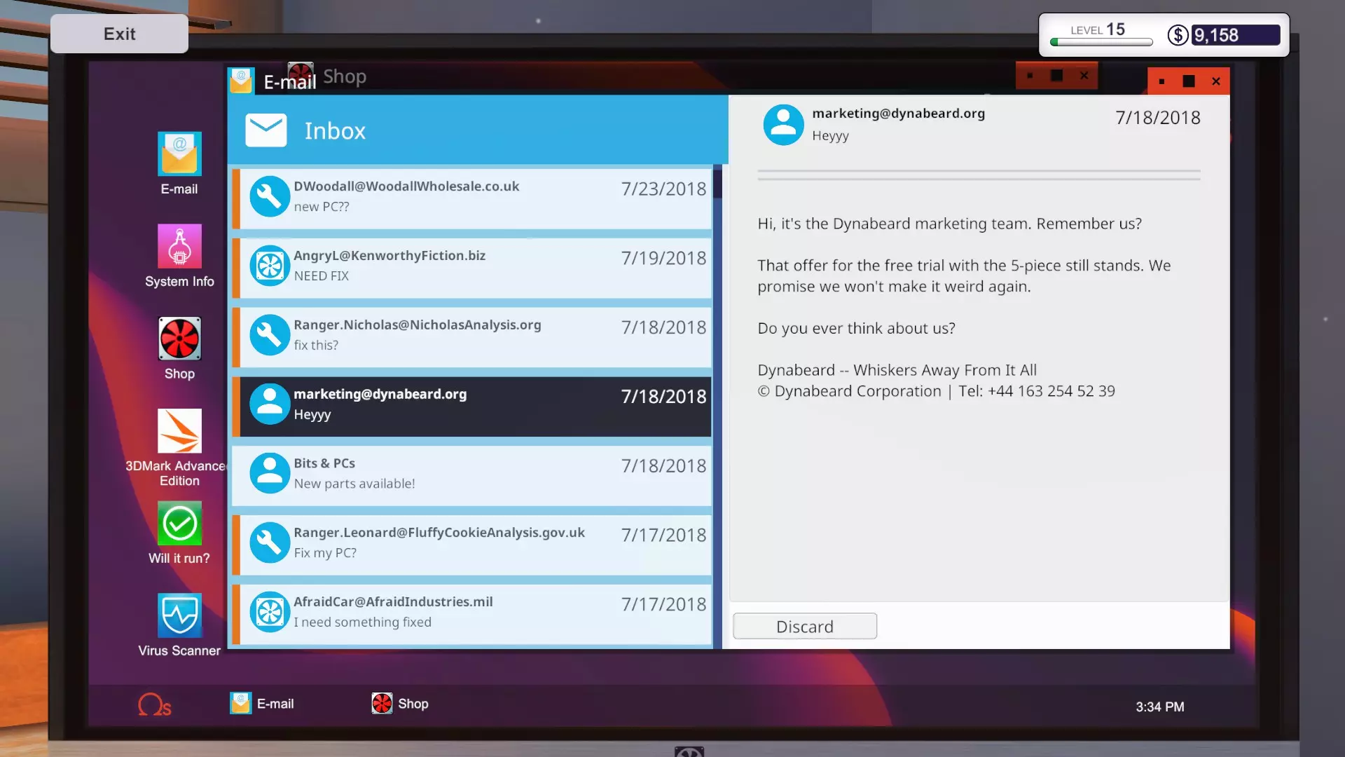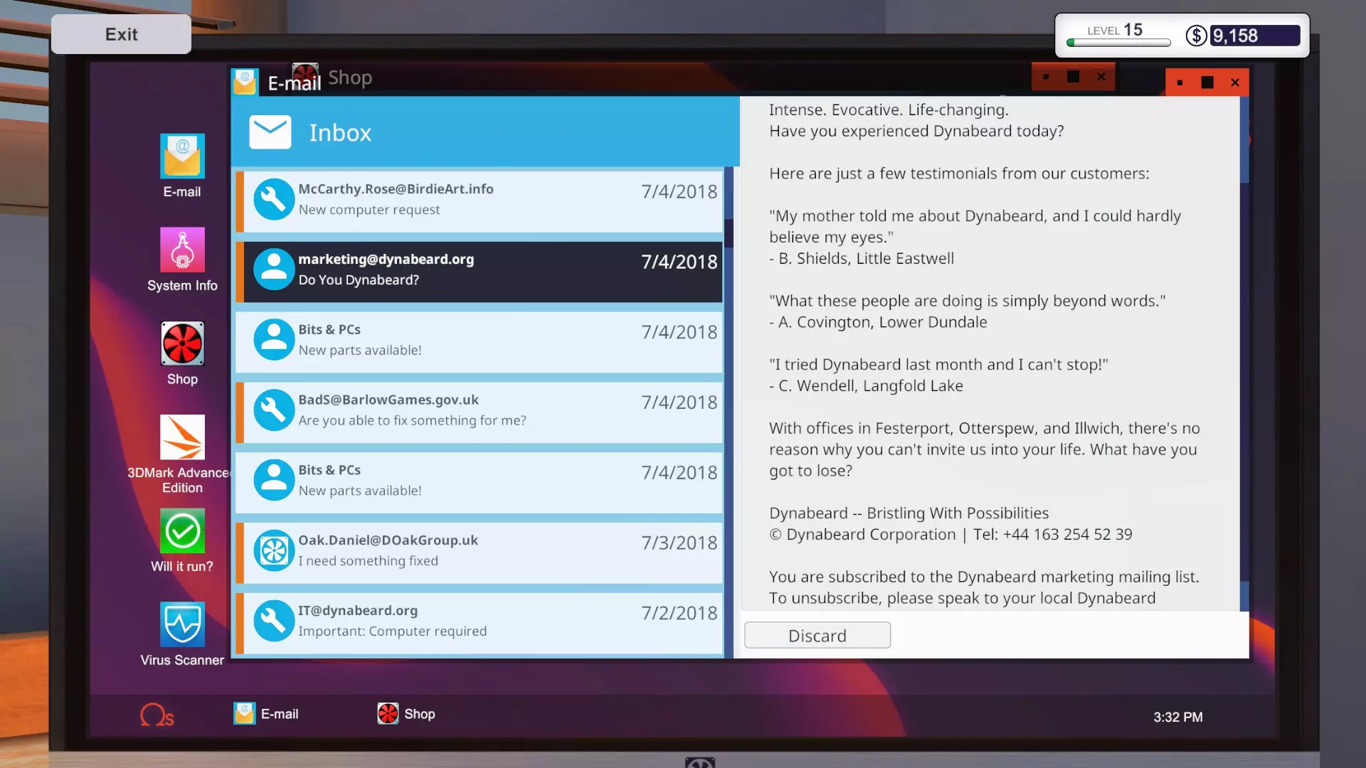其中包含一些无关的随机内容,并告知你在未经同意的情况下被订阅了Dynabeard的新闻通讯(这是非法的)。Dynabeard向你发送了另一个装机请求,称他们实际上需要两台电脑。目标和报酬完全相同,但这次你只有4天时间来完成装机。