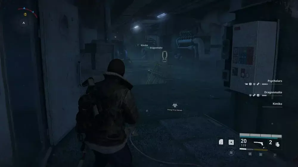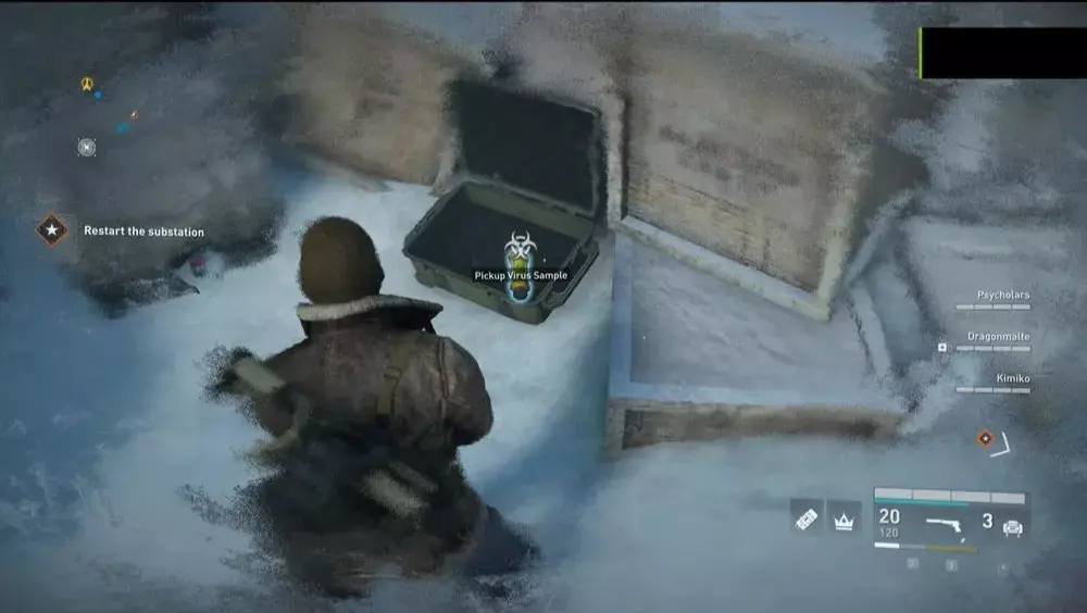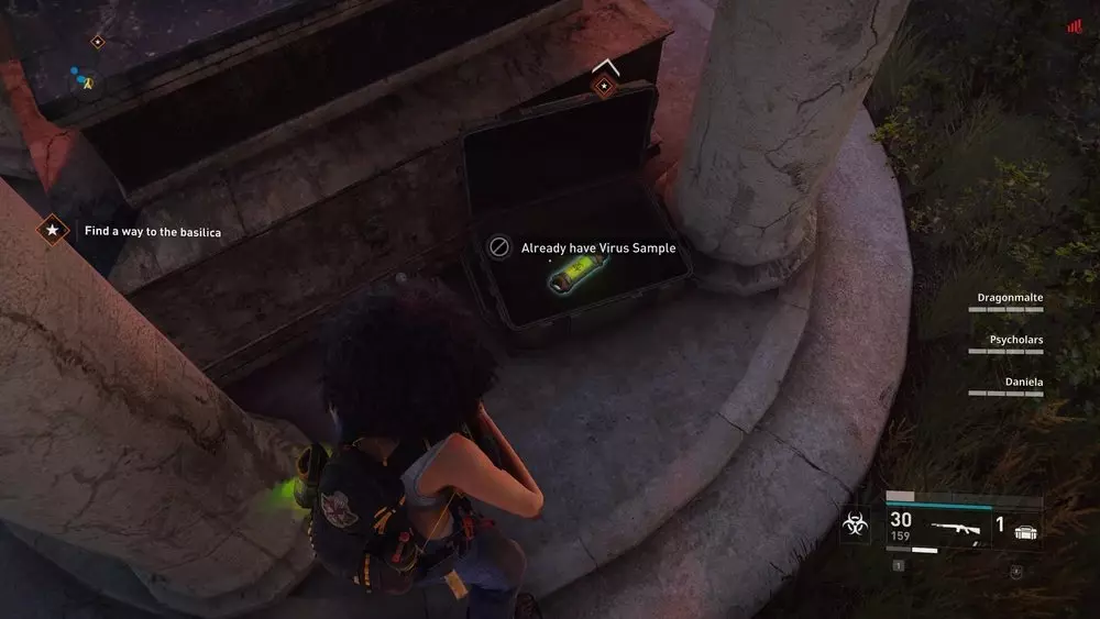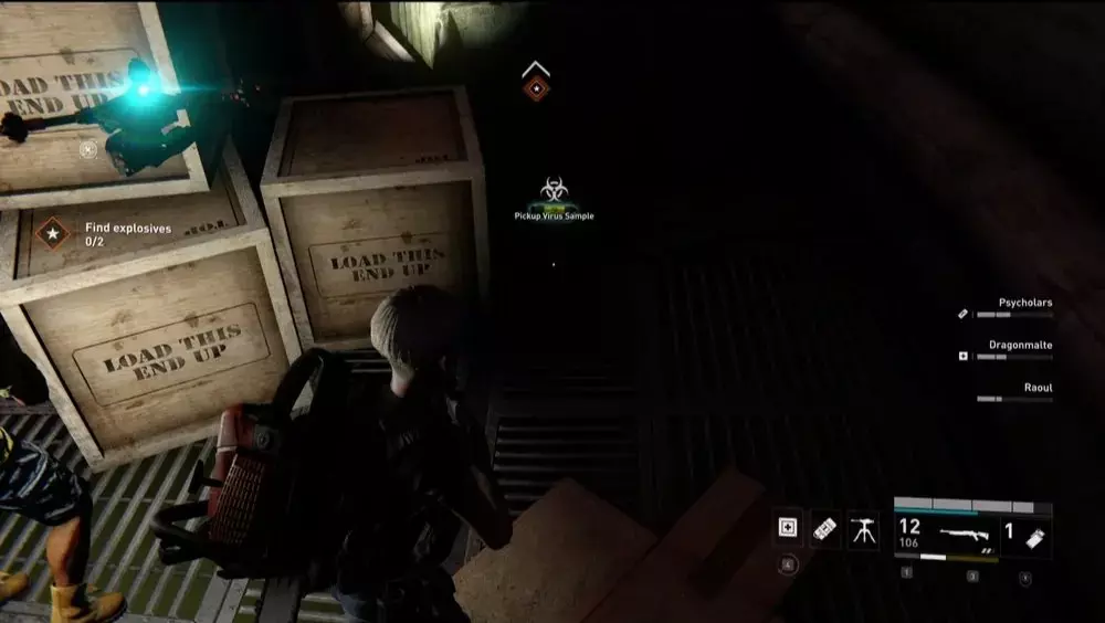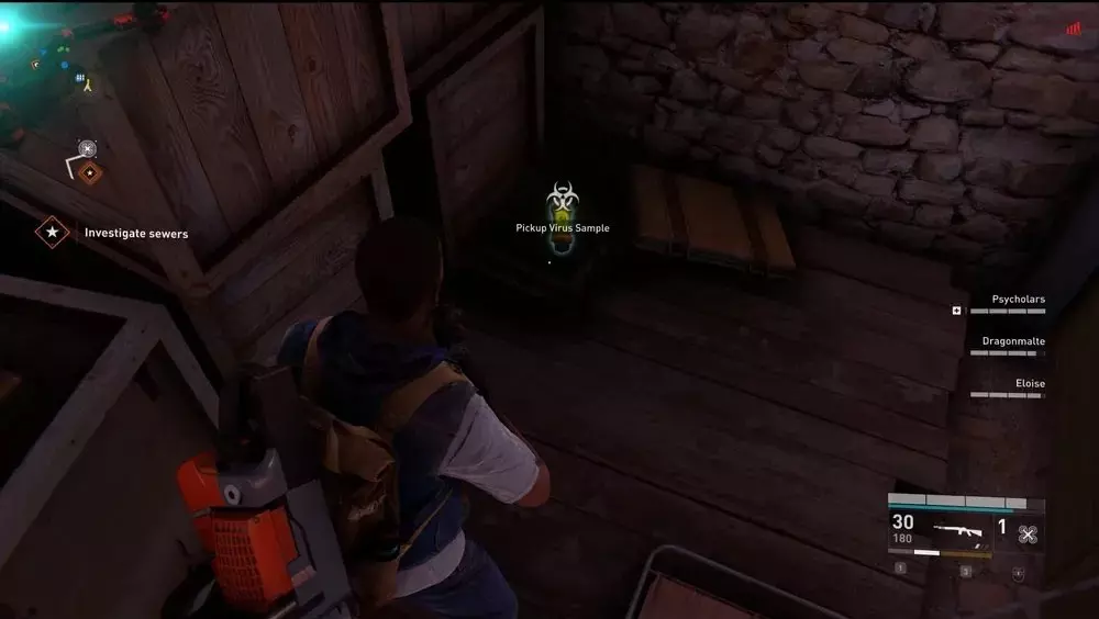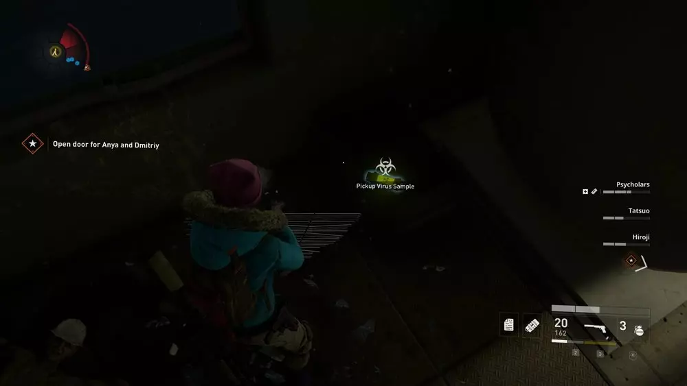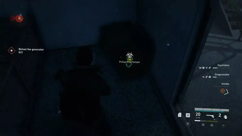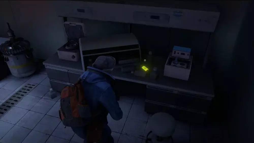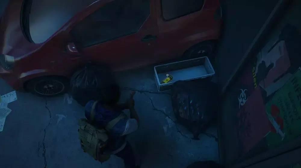 地点1:当到达岔路口时选择左侧路径。沿着斜坡路向下走,经过白色面包车后不久,向左转就能找到一个敞开的车库。进入车库,病毒样本应该藏在一个箱子后面。