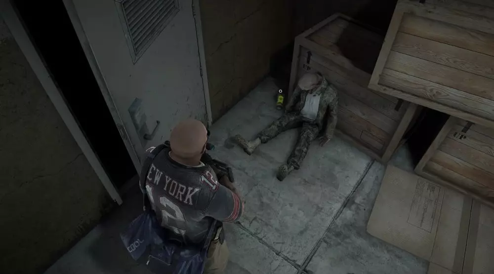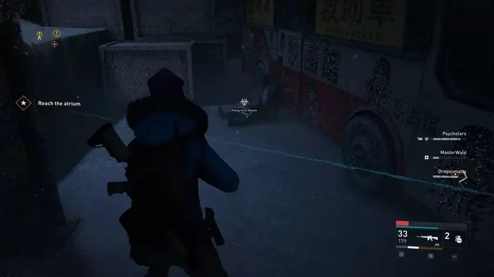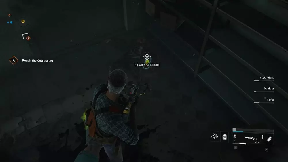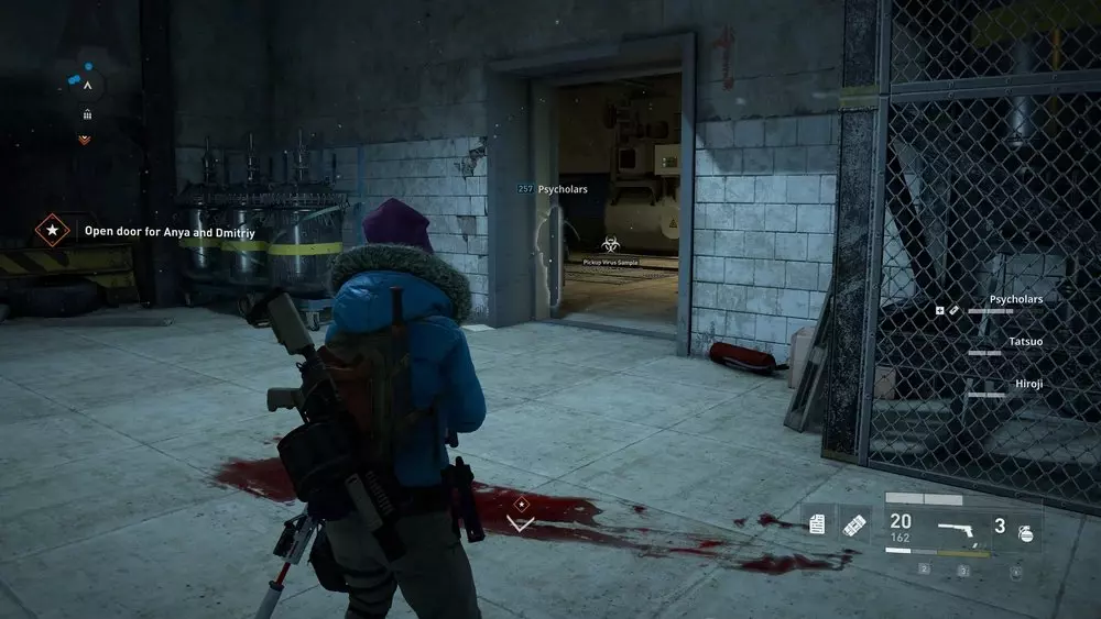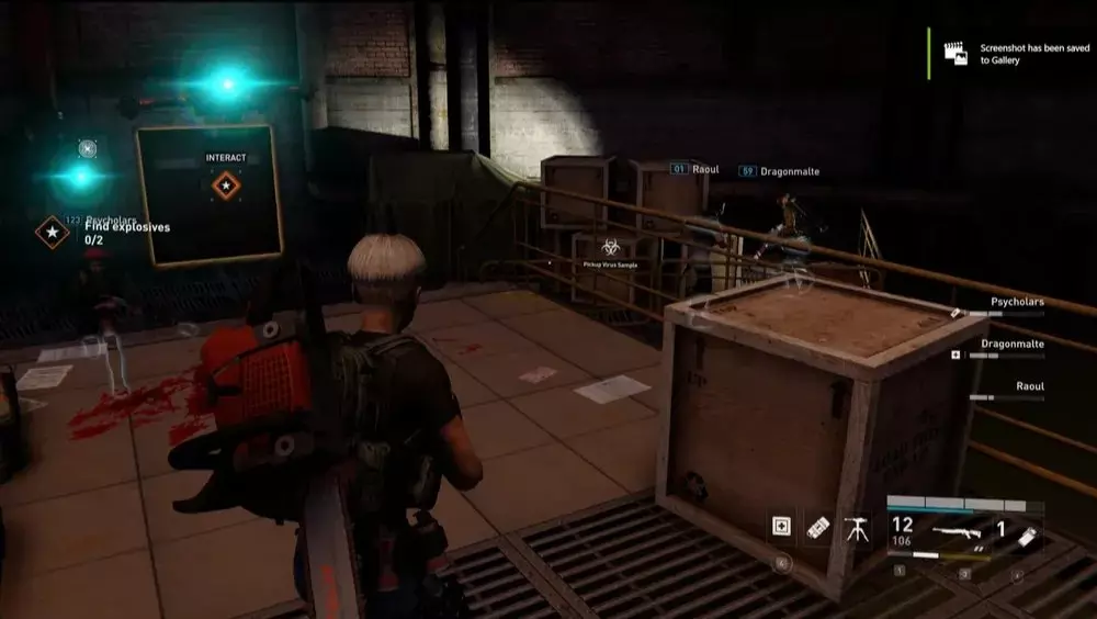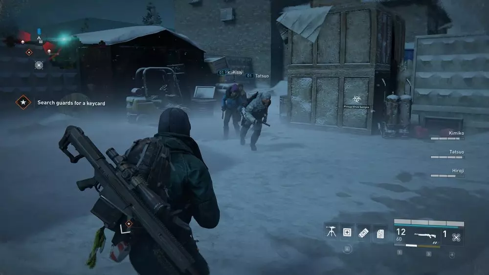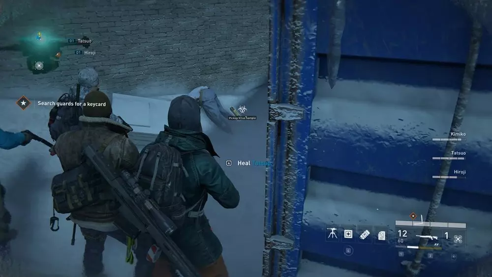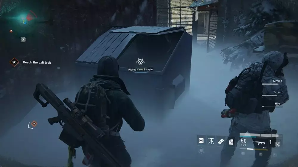 地点1:当到达岔路口时选择左侧路径。沿着斜坡路向下走,经过白色面包车后不久,向左转就能找到一个敞开的车库。进入车库,病毒样本应该藏在一个箱子后面。