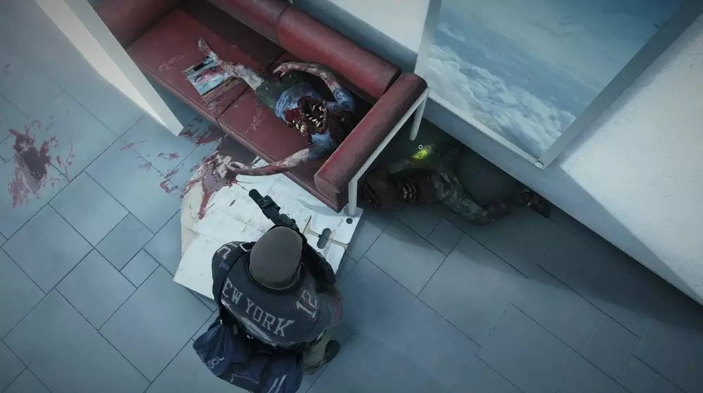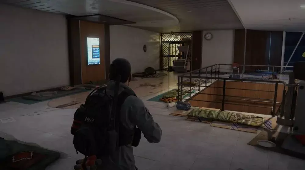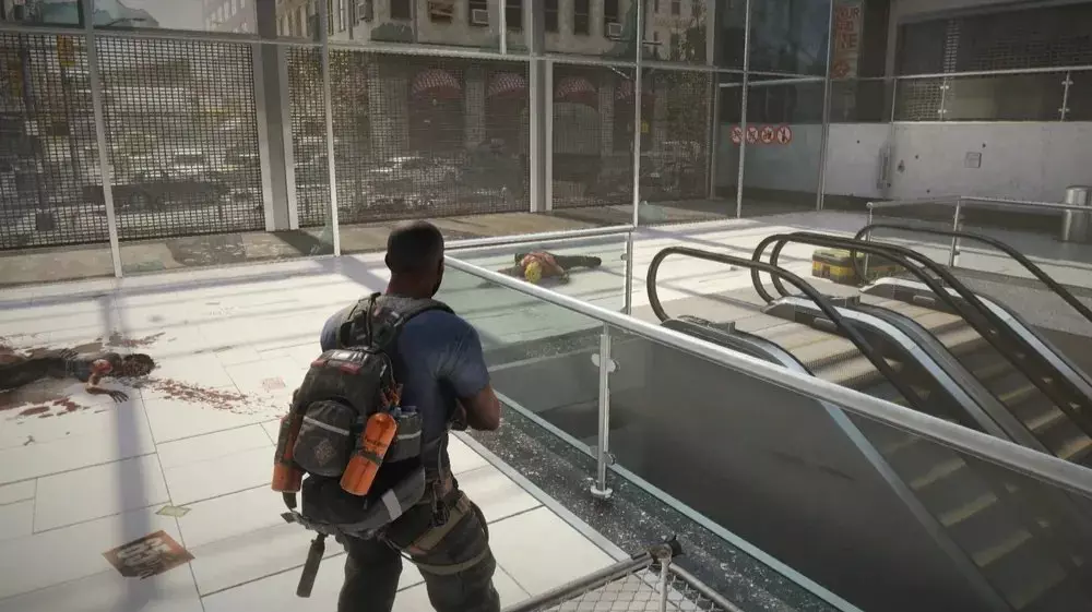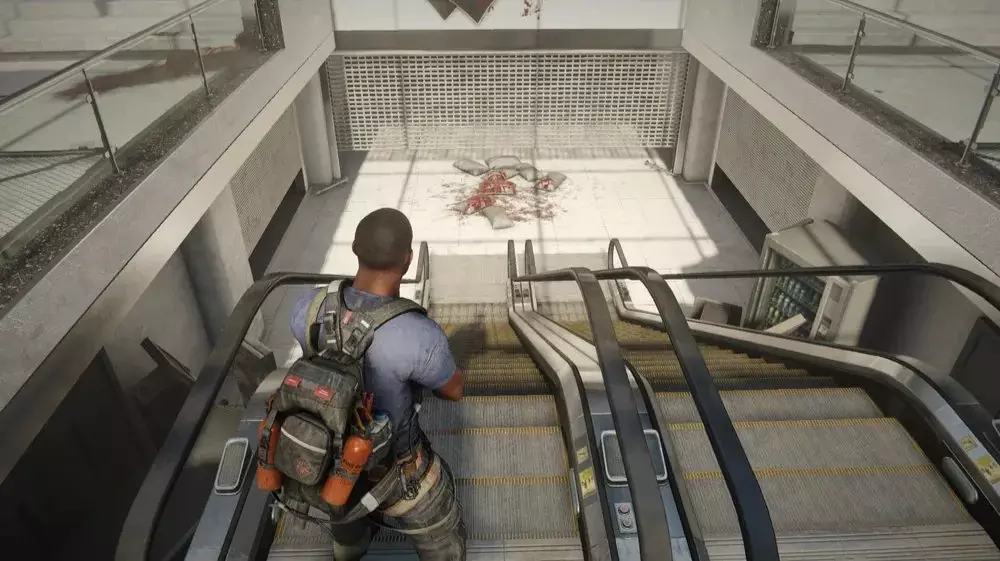 位置2:前往商场大门正前方的下层区域。走下自动扶梯的台阶。向左转,在一名倚靠在扶梯旁的士兵尸体旁边可以找到一个病毒样本。 提示:只有在击败商场的尸潮后才能收集此样本。提前拾取意味着在尸潮事件中受到的任何伤害都会损坏样本,并使你在战斗中面临更高的感染风险。