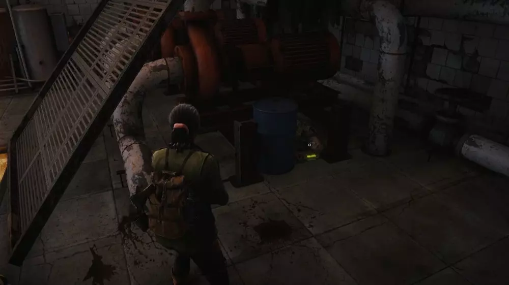 位置2:将火车撞穿红色大门后,朝着出口方向前进,进入一个房间,房间内有一个通往下水道的大型开放式格栅。先不要跳下去,而是走向开口的右侧。一台机器内有一具士兵尸体,在蓝色桶旁边可以找到病毒样本。