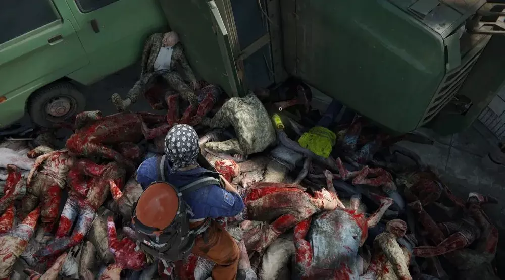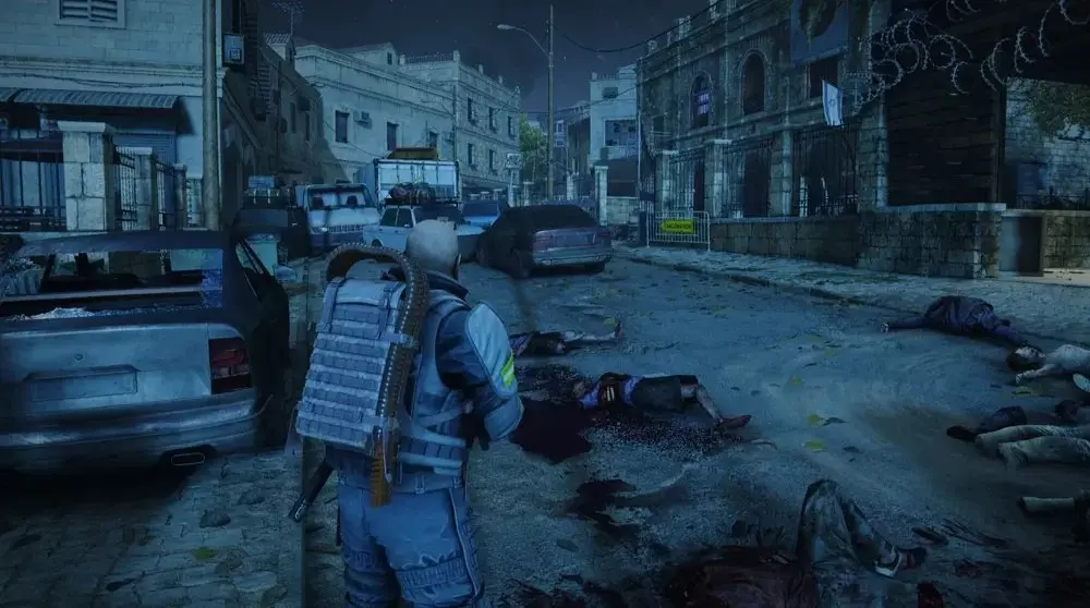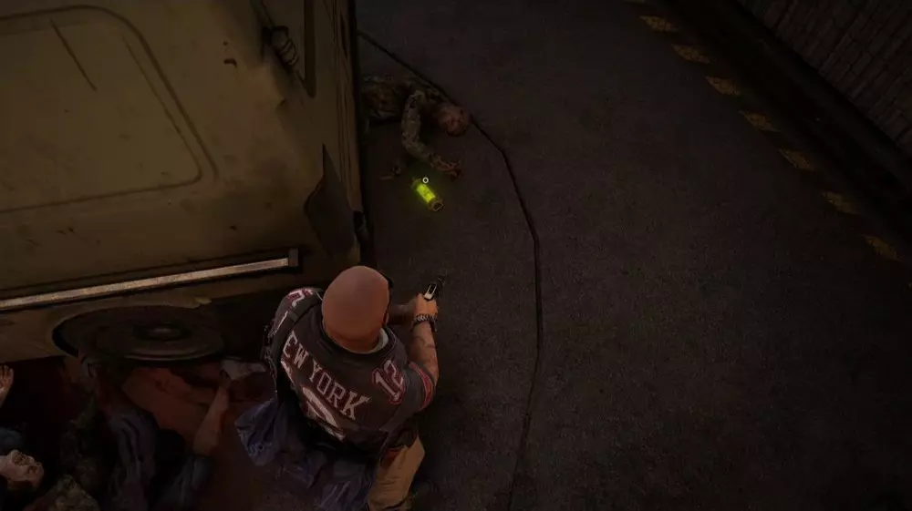 位置2:打开两扇车库门,通往车辆路障另一侧的道路。在另一侧,一些绿色车辆旁应该有一大堆尸体,非常显眼。走过尸堆,靠近绿色卡车的地方会有一个病毒样本,还有一具士兵的尸体混在其他尸体中。