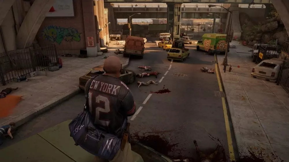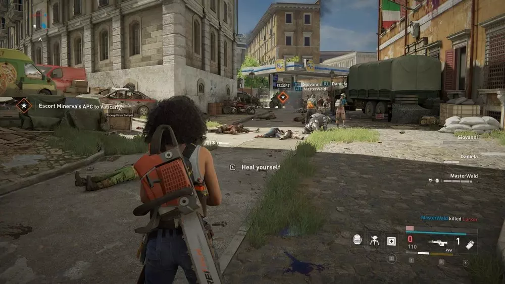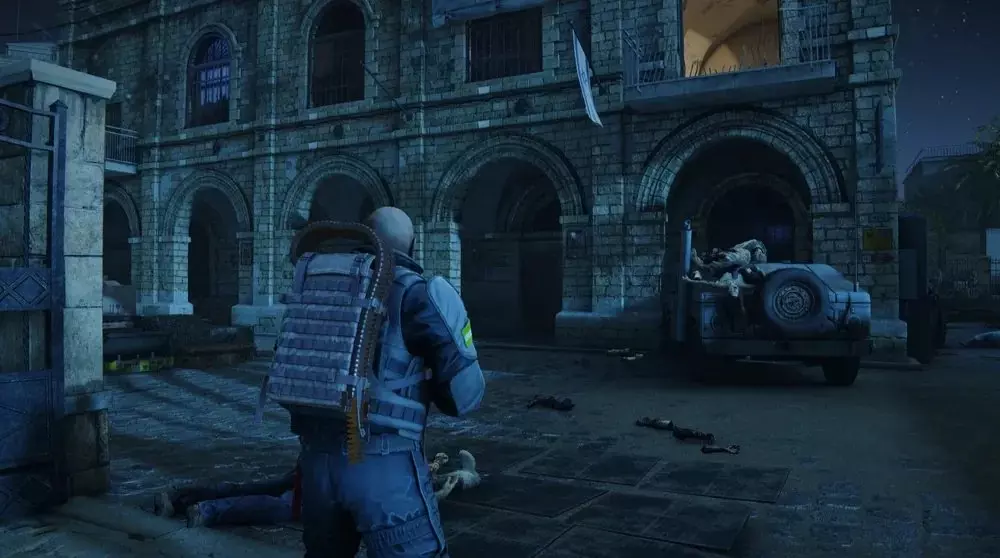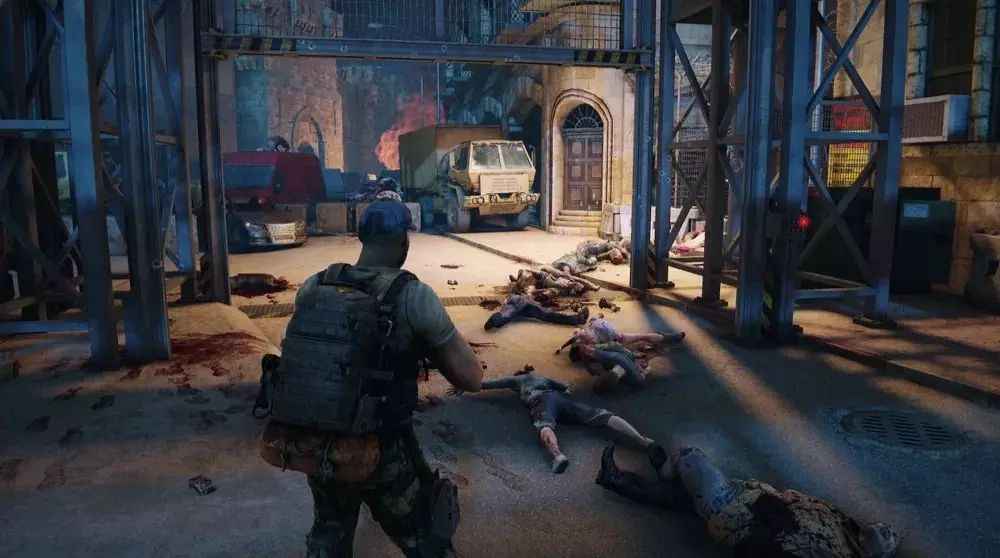 位置3:离开修道院博物馆后,朝着撤离区前的街道前进。你会从平台上跳到一辆绿色货车上。走到货车后面,能发现一具半藏在车尾下方的士兵尸体,旁边有一个病毒样本。 提示:只有在街道安全后才能收集这个样本。不要着急,等一切处理妥当:消灭所有出现的僵尸,处理掉任何敌对的炮塔或地雷。