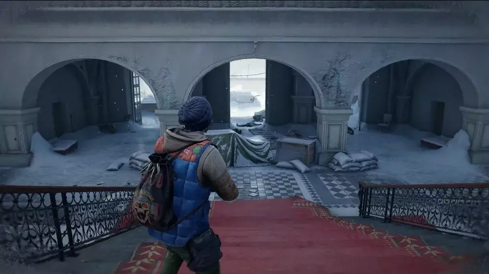 位置2:前往博物馆的另一侧,那里有第二个控制面板,它位于关闭的中央大门旁边。在那扇门的右侧应该有一扇开着的门,通向一条走廊,走廊里有一个陈列着破损画作的画廊。进入走廊尽头的区域,查看门后,一个病毒样本就放在一个小型军用 crate 上。 提示:只有在博物馆的尸潮被击败后才能收集这个样本。过早拿取样本会使其在尸潮事件的后半段面临更大的损坏风险,并让你在战斗中更容易被感染。