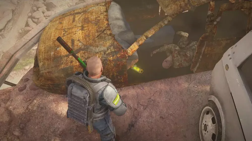 地点1:突破大门后向右走。跳过离悬崖边最近的围栏,到达故障车辆处。左侧那辆严重生锈的车里有一具士兵尸体和一个【病毒样本】。 提示:在基地入口尸潮抵达前收集此样本。尽管有风险,但这是唯一能安全获取它的时机,因为当队伍必须进入基地时,外部区域很快会被大量敌人淹没,导致队伍难以应对。