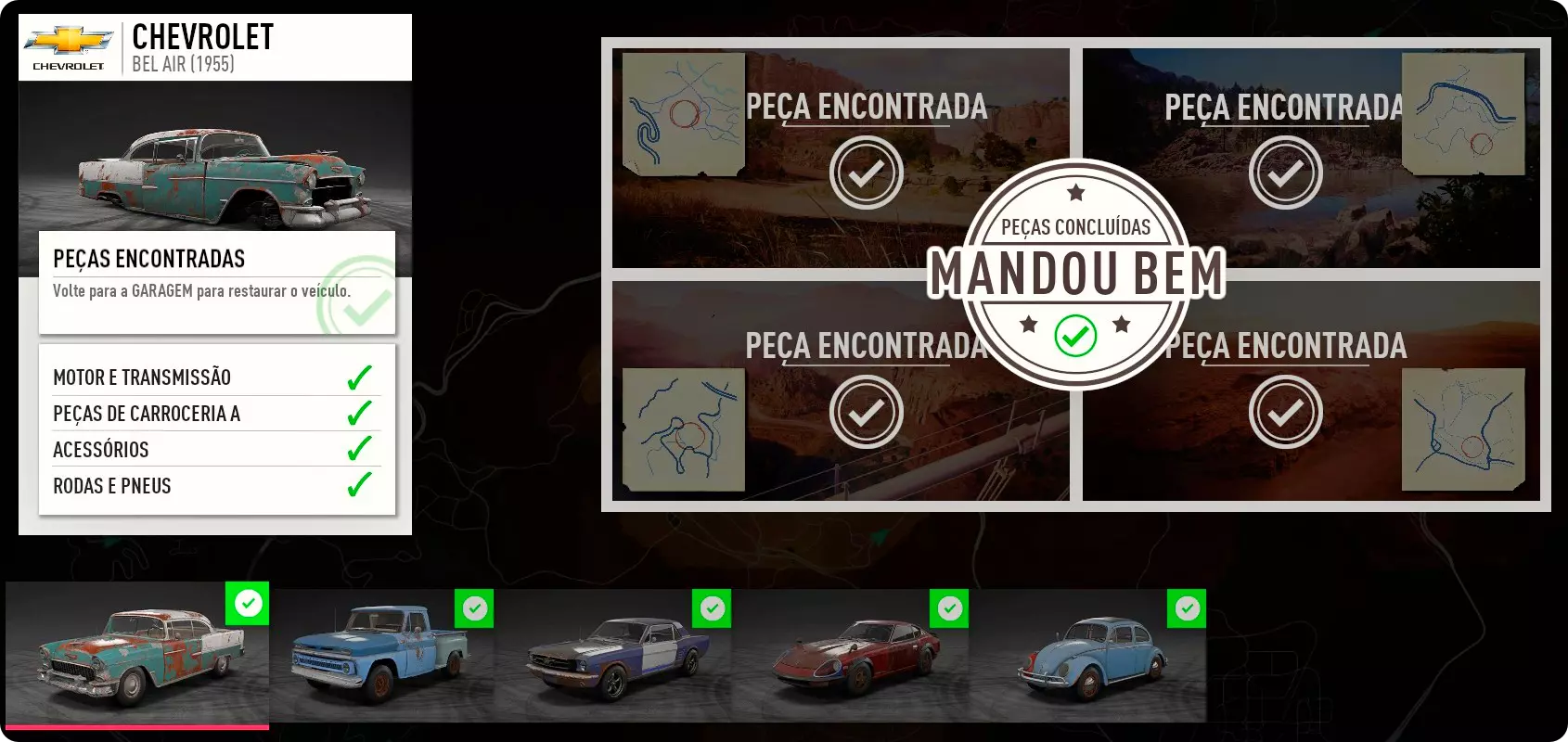雪佛兰贝尔艾尔1955 完成杰西:车手任务线后可找到雪佛兰贝尔艾尔的底盘。 地图上会标记底盘位置,在银岩地区收集到底盘后,将解锁重建贝尔艾尔所需的所有后续零件位置线索。