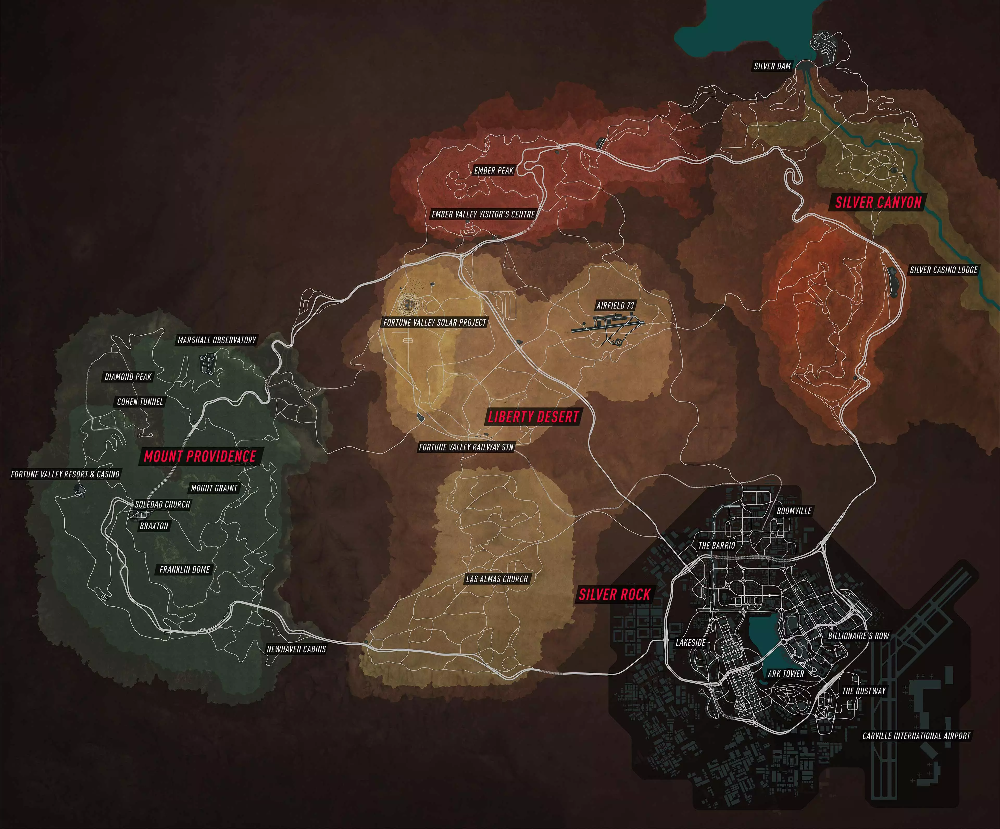 叛逆者 摧毁所有广告牌。 整个幸运谷共有30个广告牌;其中普罗维登斯山10个、自由沙漠6个、银岩3个、余烬谷3个、银峡谷8个。 它们会以广告牌图标突出显示。附近的广告牌会提示玩家,并在玩家地图上记录其位置。 每收集一个广告牌,玩家将获得6000美元和30000声望值的奖励。拥有【High Roller Pack】(DLC)将使每个被摧毁的广告牌的金钱和声望奖励额外增加5%。