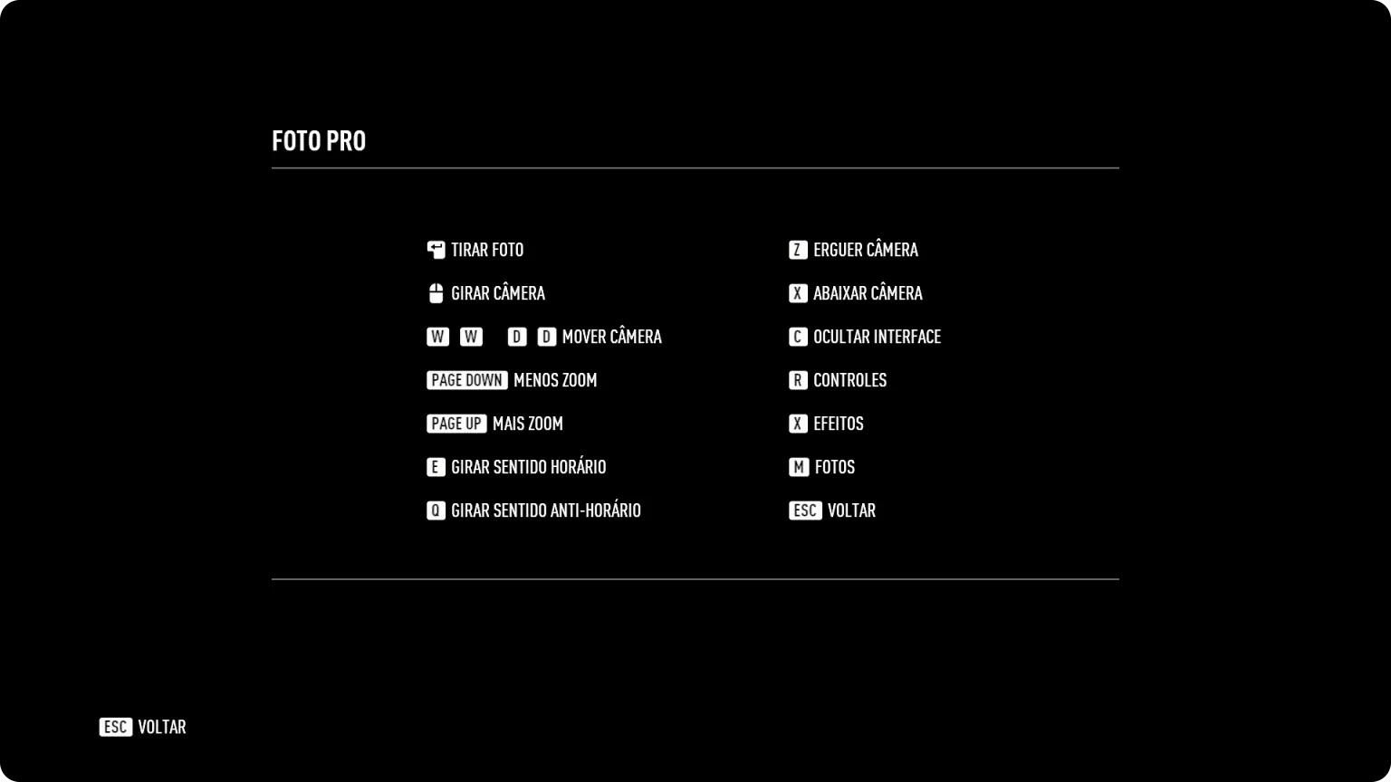 按“R”键显示所有指令。命令 描述 回车键 拍照 鼠标 旋转相机 W、S、A、D 移动相机 Page Down 缩小焦距 Page Up 放大焦距 E 顺时针旋转 Q 逆时针旋转 Z 抬高相机 X 降低相机 C 隐藏界面 R 控制选项 V 效果设置 M 照片库 ESC 返回 ╔═══════════════ ∘◦ 照片模式 ◦∘ ═══════════════╗