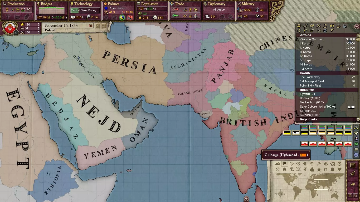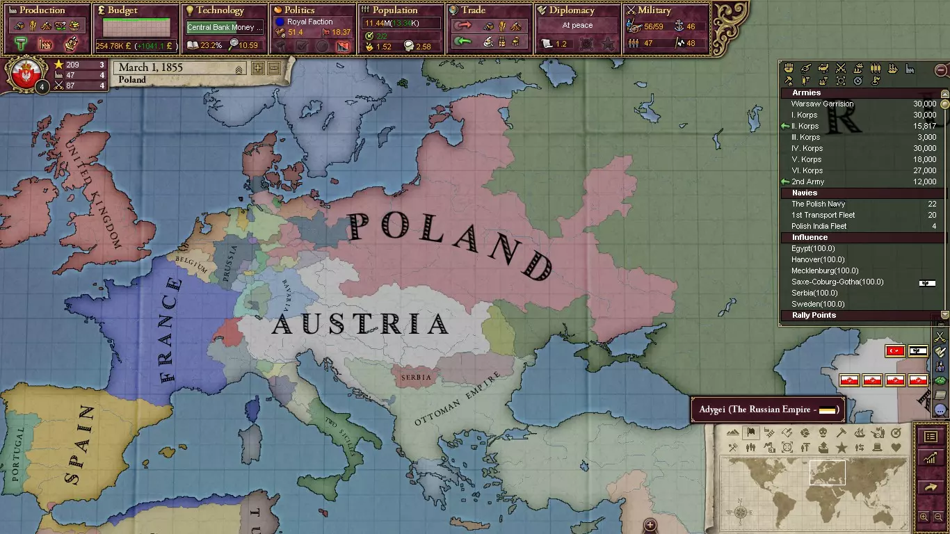 古老的波兰立陶宛联邦早已不复存在,但它可以重获新生!只有一个国家——自由、独立且严守中立的克拉科夫城,或简称克拉科夫——能够重建这个曾经伟大的联邦。要想用这个小小的城邦重建庞大的帝国,需要真正有魄力的人。或者,如果你不喜欢冒险,或者还没准备好采取强硬手段,你也可以从俄罗斯帝国手中释放波兰。如果你想要初始海岸线,从普鲁士释放波兰是另一个选择。 就像成立南斯拉夫一样,成立这个大国也有两种途径。如果你选择扮演波兰,可以通过国家焦点在普鲁士控制的波兰核心地区制造紧张局势,引发危机,争取收回核心省份(适用于【 Hearts of Darkness 】资料片);或者选择艰难的战争方式,联合像俄罗斯这样的列强盟友共同作战。 首要任务是收回普鲁士境内的核心领土。考虑到普鲁士拥有欧洲大陆最先进的军队之一,这对你来说将是一场硬仗。作战时一定要争取俄罗斯等强大盟友的支持,否则你可能会被打得惨败。要尽可能与普鲁士持续作战。你会发现,夺回这些核心地区还能阻止普鲁士成立北德意志邦联。呵呵。别忘了你在奥地利也拥有核心领土,所以也要争取它们。