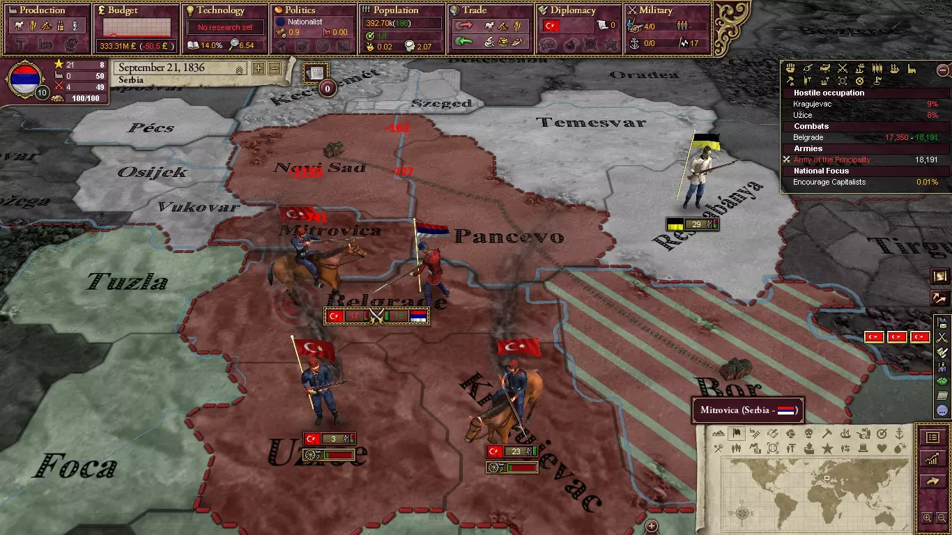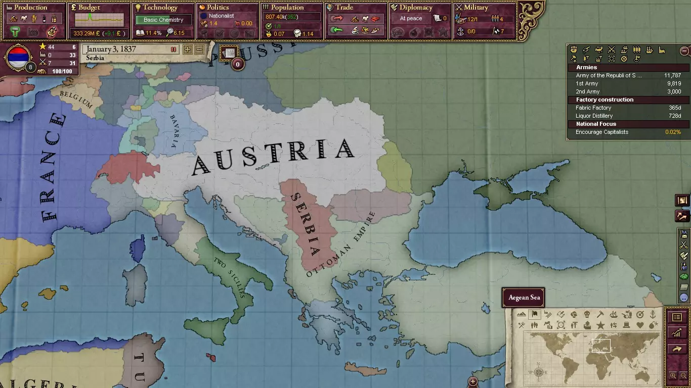 首先,我们来介绍南斯拉夫这个国家。目前,巴尔干地区仅有3个独立国家,分别是塞尔维亚、希腊和黑山,而塞尔维亚是你应该选择的国家。塞尔维亚在奥地利北部拥有核心领土,其受压迫的兄弟民族仍被衰落的奥斯曼帝国所束缚,因此塞尔维亚有着广泛的选择。 与俄罗斯结盟。他们将是你的关键保护者,并会协助你收回在巴尔干地区的核心领土。由于停战协定等因素,这个过程需要一段时间。但迟早,你应该会拥有整个南塞尔维亚地区。此时的塞尔维亚版图虽有所扩大,但仍缺少一样东西:出海口。如果你能够从奥斯曼帝国手中夺取黑山地区,那么接下来就应该直接攻取黑山本身。要记住吞并一个虽小但文明的国家会带来恶名。最后建议的行动是占领波斯尼亚地区。这可能会让你的塞尔维亚形象受损,但别担心,你距离打造我们所熟知的那个强大国家已经不远了。