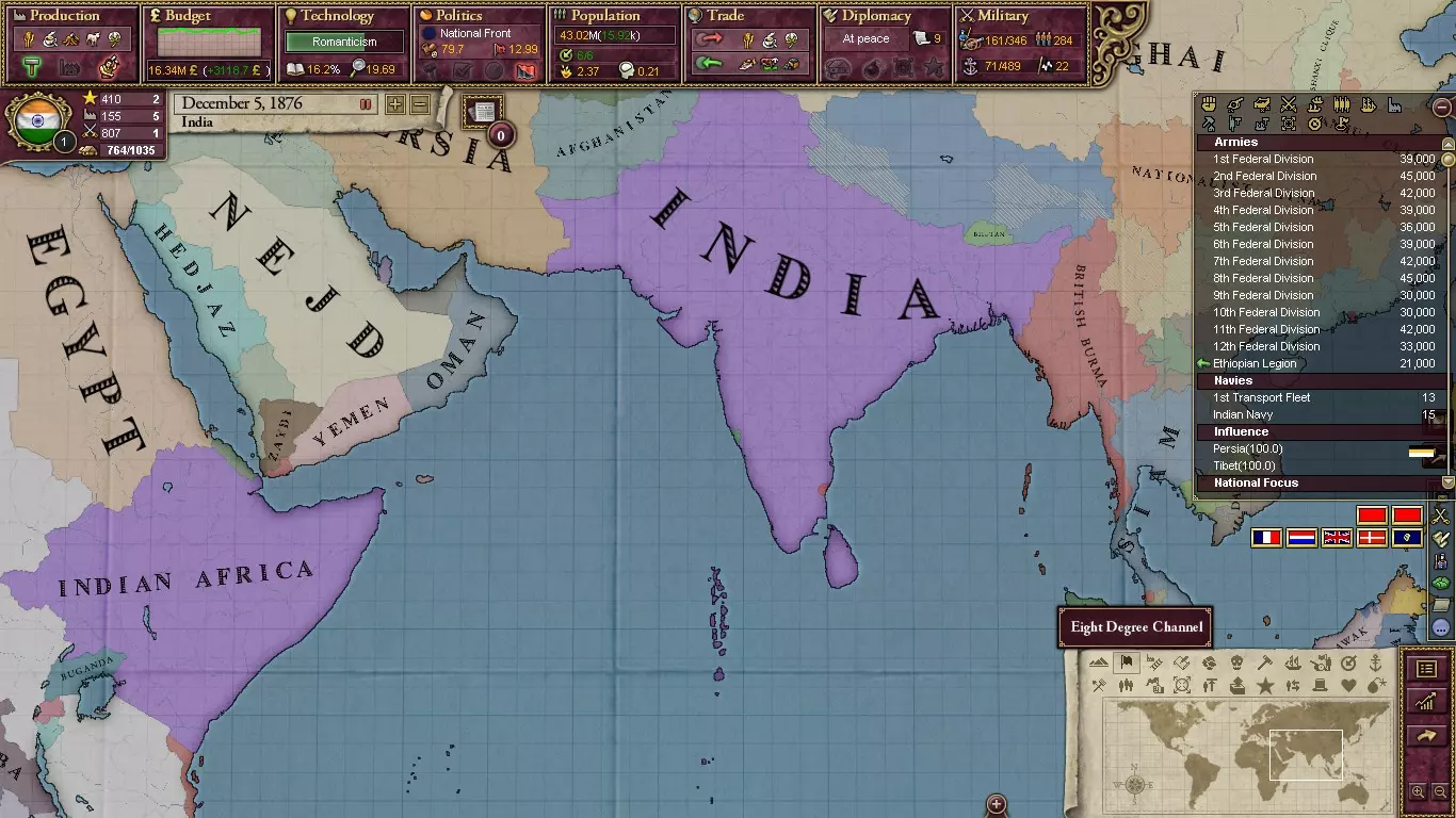 在《维多利亚2》中,印度是最难成立的国家之一(仅次于罗马尼亚)。开局时,印度大部分地区都是大英帝国的傀儡国,因此我们需要将目光投向东方。未开化国家旁遮普是印度次大陆上唯一一个既非英国傀儡,又拥有足以挑战英国在印度霸权的军事实力的国家。 建议首先对付巴基斯坦的小王国。它们大多实力薄弱,在你的优势下,你可以在短时间内将它们全部吞并,使旁遮普的版图接近现代巴基斯坦。但不要止步于此!继续进攻阿富汗和中亚国家,让旁遮普的版图接近波斯的大小!然后从那里开始,你可以着手建立武装力量并为西化做准备。一旦完成西化,你就终于可以开始从英属印度夺取领土了。你的目标是将英国完全赶出印度,至少是他们直接控制的部分。完成这一步后,向英国宣战,以解放他们在印度的所有傀儡国。最后,如果你此时已是列强,就将印度各小邦纳入势力范围。这样一来,当你成立印度时,它们就都会加入你。