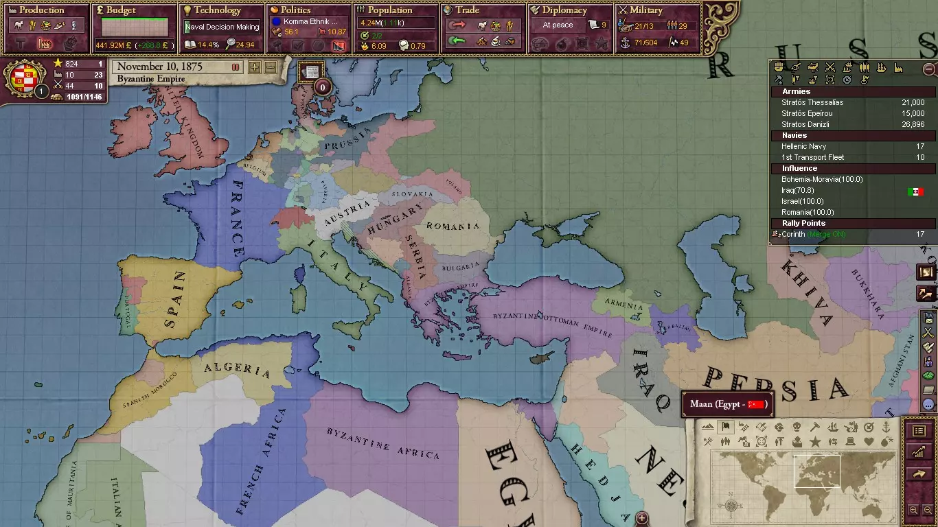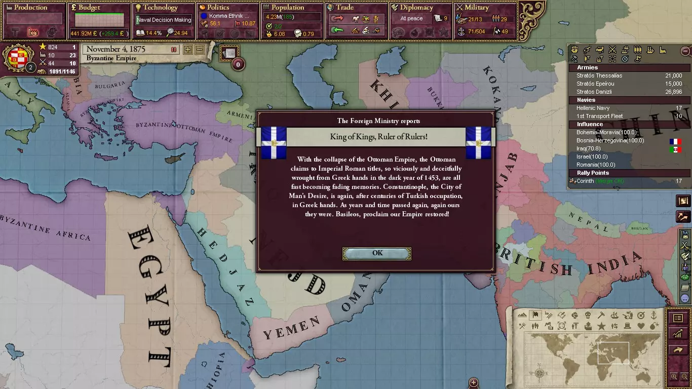 另一种策略是解放所有巴尔干北部国家,只保留奥斯曼希腊和小亚细亚地区,并释放伊拉克和埃及的核心领土。当然,要做到这一点,你需要成为一个列强。