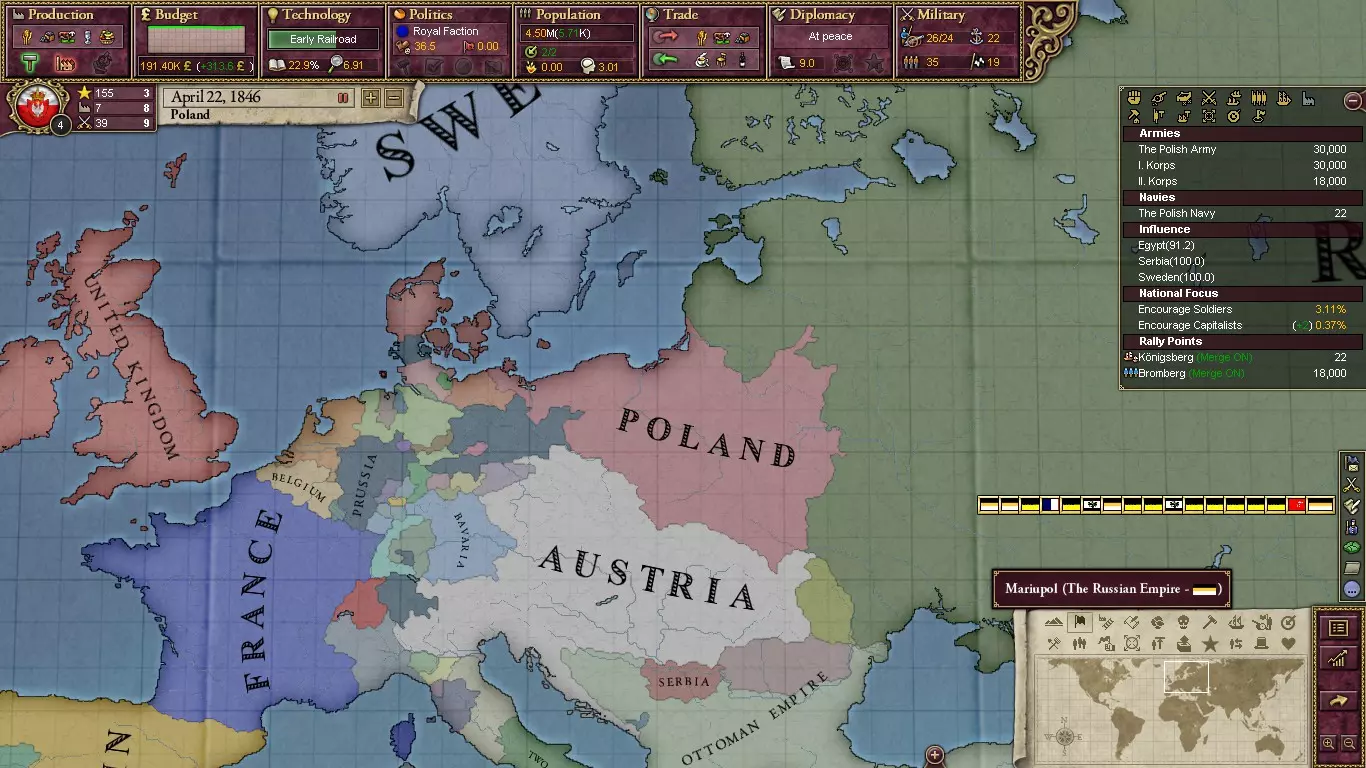 现在你已经掌握了所有核心领土,距离成立南斯拉夫几乎只剩一步之遥!现在你只需从奥地利手中夺取科尔提亚和斯洛文尼亚。此时,如果你的游戏中意大利已经成立,要注意他们也会对斯洛文尼亚和科尔提亚南部获得核心领土,所以如果意大利先占领了这些地区,你就要准备好与意大利开战。 一旦你获得了所有最后需要的领土,希望你届时已成为列强,或者至少处于次强阶段。开始建立你的海军力量(假设你还没这么做)。如果你已经建立了海军,那就大量研发提升威望的科技。你需要成为列强才能成立南斯拉夫。一旦达到列强地位,你就可以成立南斯拉夫了。恭喜! 如何成立波兰-立陶宛