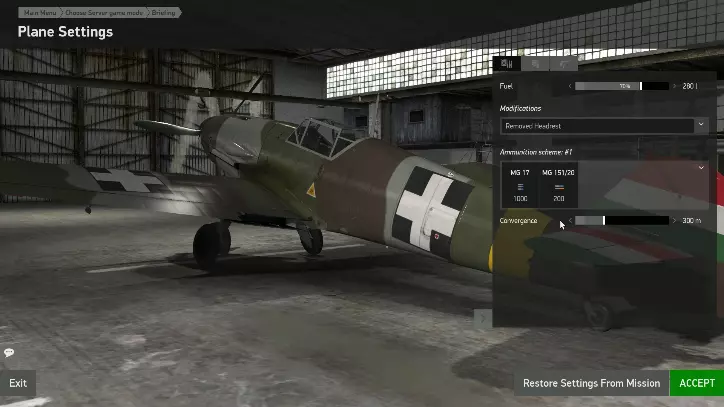 具体来说,从画面左侧的【混战模式】中选择想要出击的国家,然后选择机体。【西方阵营】是新型机体,【东方阵营】是旧式机体,【飞行马戏团】则是第一次世界大战的机型。 空域的人数会显示在出击图标上,蓝色人形代表友军,红色飞机代表敌机,建议确认后选择人数较多的区域。 推荐的机体方面,德军的话可以选择BF109 F4。 如果想参加实战,建议选择【自由之翼】或【芬兰虚拟飞行员 - 动态战争】(参考上述画面)。 实战前应该练习的技能是起降和发动机启动。学会调整飞机配置或许能为你带来更多乐趣。 从菜单画面选择出击的基地和机体后,可通过绿色部署按钮旁边的设置选项来更改机体配置。 不同的出击基地,可搭载的武器和改造方案也有所不同。 以BF109F4为例,推荐设置为:启用移除头枕功能,燃油量调整至70%左右。这样做能让后方视野更开阔,同时减轻机体重量,使其更容易操控。 接下来,可以设置机身涂装。当然使用默认涂装也没问题,但你也可以选择喜欢的涂装,根据个人喜好进行更换。该图像是《自由之翼》设定的一个示例。