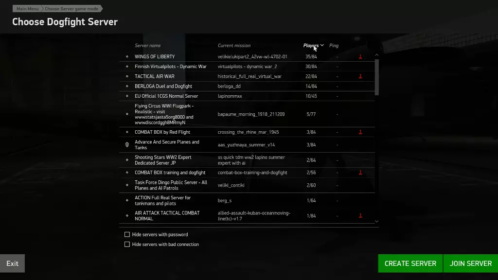 选择【Dogfight】后会出现服务器栏。由于不同时间段活跃的服务器有所不同,建议按人数排序,进入人数较多的服务器或后文推荐的服务器。 例:2022/02/05 20时左右的服务器状况