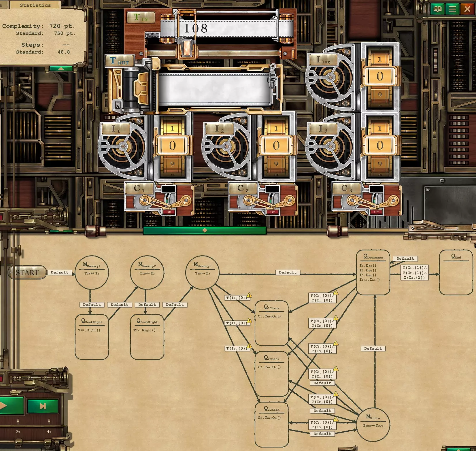复杂度:320/320 速度:9.25/20.08 思路是将不同节点本身用作当前总值状态,从而实现较快速度。 同时,遵循所有给定情况,部分状态转换箭头可忽略。 因此,此解决方案仅针对给定测试用例的特定巧妙解法。 3.1