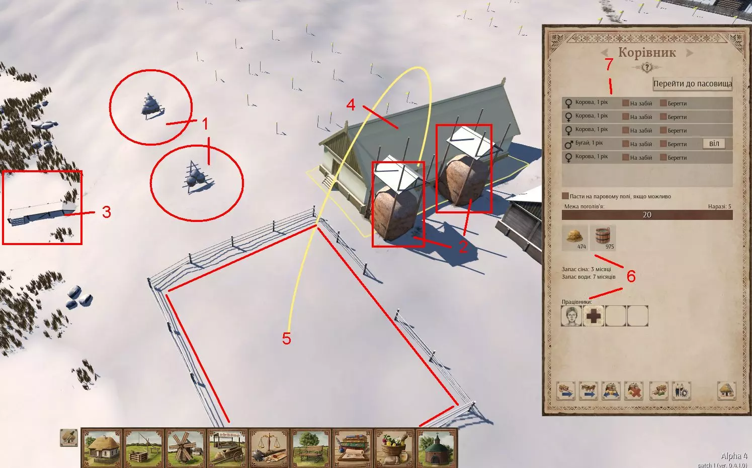 河边的牛棚还有其他优势。不平坦的地面不允许建造大型建筑,但可以设置田地、牧场和干草晒场。这样可以节省:未来城市房屋和生产设施所需的平坦地面;工人前往干草晒场和牧场的时间。河边选址的缺点只有一个,且并不严重。如果农场位于村庄的另一侧,不要让牲畜在沼泽地上放牧。因为工人们会花费大量时间在往返路途上,生产效率将会降低。 另一点:在任何生产设施旁,距离不超过一个街区的范围内,需要建造房屋。随着时间推移,那些住在附近的人将会来工作。 干草和水的供应 干草和水可以由工人和杂工来供应。后者(杂工)需要在雇佣选项中勾选【杂工手动】和【杂工自动】的标记。前2-3年最好只雇佣女性。这段时期男性数量不足以满足其他生产需求。不应将工资降低到70%以下。 一头奶牛、公牛或羊每月各需要25单位的干草和水。这是在圈养且没有牧场的情况下。冬季不进行放牧——因此从11月初到3月初,你所有的牲畜都将待在冬季棚舍里。