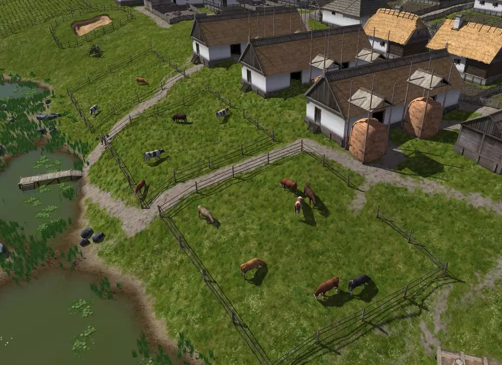 牛棚及其相关生产链的布局。购买牲畜。工人和饲料供应。如何通过养殖获得最大利润。 购买牛类牲畜 在《Ostriv》游戏中,德卡奇和巴拉克利亚这两个城市出售奶牛、公牛和小牛。 巴拉克利亚距离最近,信使需要8天才能到达那里。货物和牲畜的运输也需要相同的时间。 一头牛的价格为40游戏格里夫纳。单次购买限制为20头牲畜。这是一个牛棚能容纳的最大数量。 购买牲畜前需要做好准备: 1. 建造贸易仓库 2. 为其雇佣一名主管和一名工人 3. 储备干草 4. 建造牛棚 5. 为牛棚供应饲料和水 首先要组织干草的采购。在第一年夏天,女性就不会没有工作了。在村庄周围建造晒谷场。它们会立即建造完成,不需要建筑工人。杂工们会立刻开始割干草。当你建造了9间小屋和铁匠铺后,让建筑工人建造【干草棚】——这是冬季储存干草的地方。 当你建造好贸易仓库后,应该立即开始建造牛棚。这需要花费近一个游戏月的时间,而牲畜是非常重要的。牛奶能丰富本地市场的商品种类,牛还能用来耕种农场的土地。根据观察,您的第一个牛棚最早可能在1722年1月至2月期间建造。 购买多少牲畜?游戏初期资金有限,因此最理想的是购买3-5头奶牛和1头公牛。如果需要耕地且资金充足,可以在订单中再添加2头公牛。随着时间推移,您可以再购买更多,或者等待自己的小牛出生。奶牛棚的建造位置 有两种合理的奶牛棚选址方案: 1) 靠近农场 2) 靠近河边 选择第一种方案是为了让牲畜在休耕地上放牧。这样可以将耗尽肥力的土地恢复到100%。但这种情况下,需要在旁边建造带有“仅用于生产”选项的水井。 在河边建造奶牛棚时,需要在旁边修建码头。