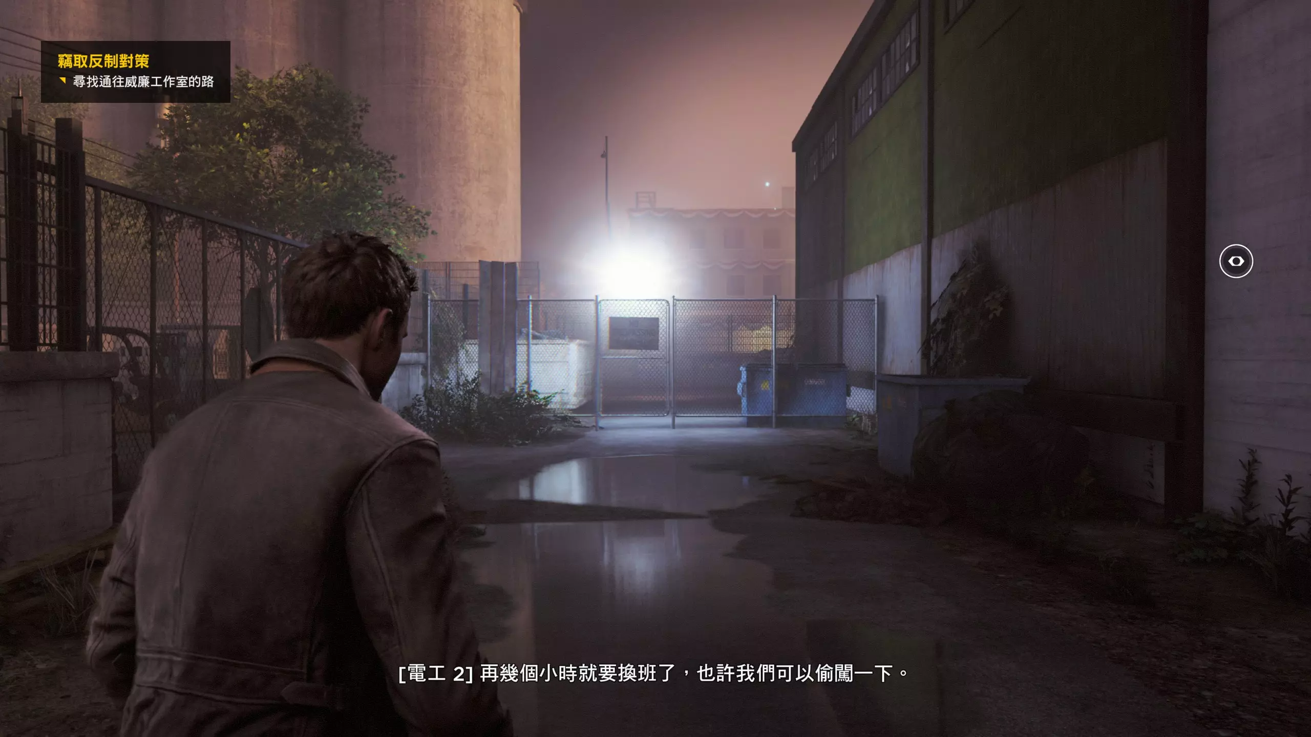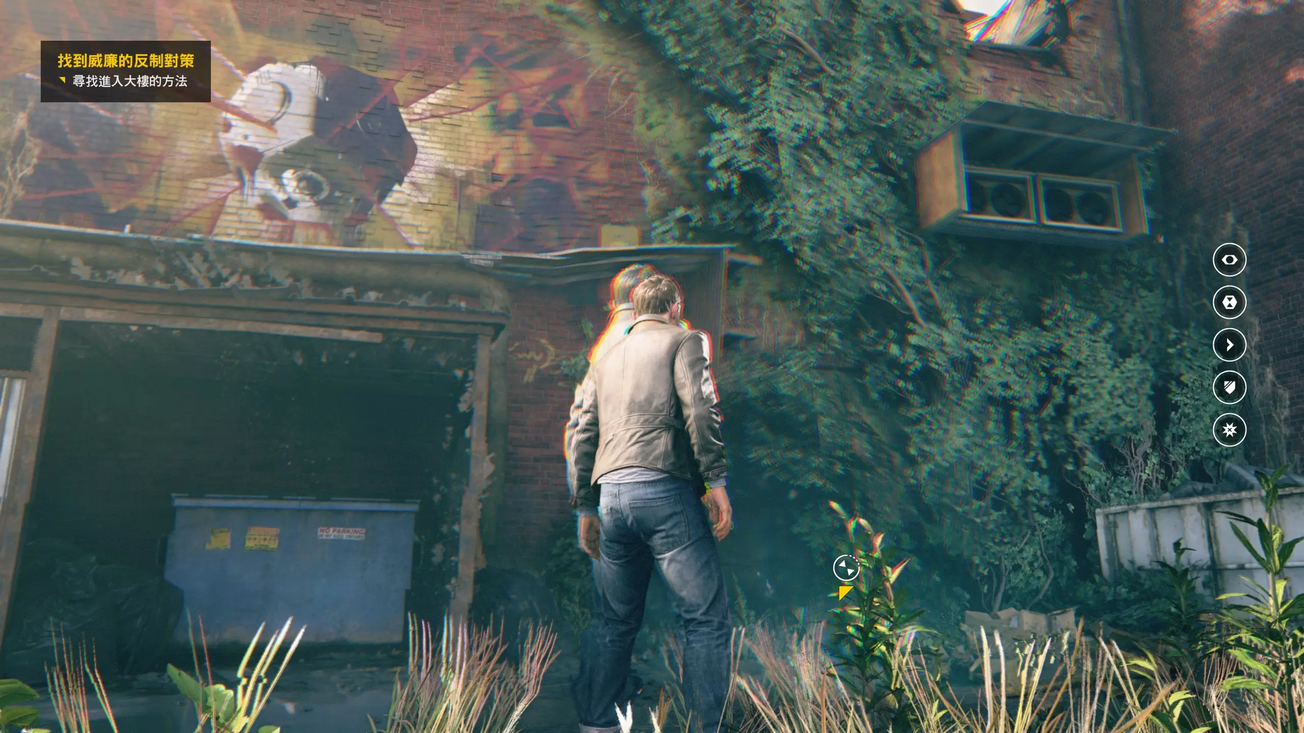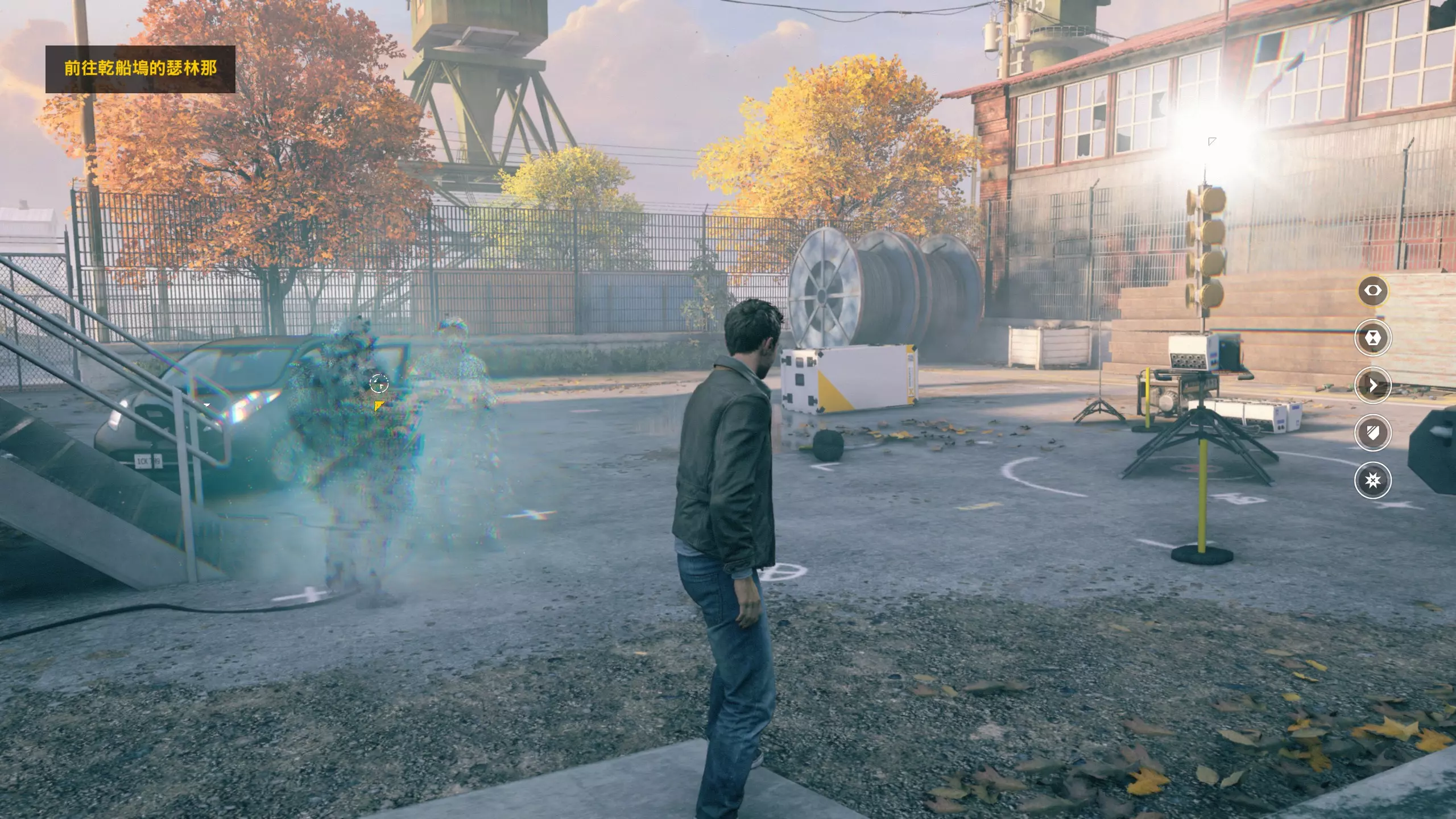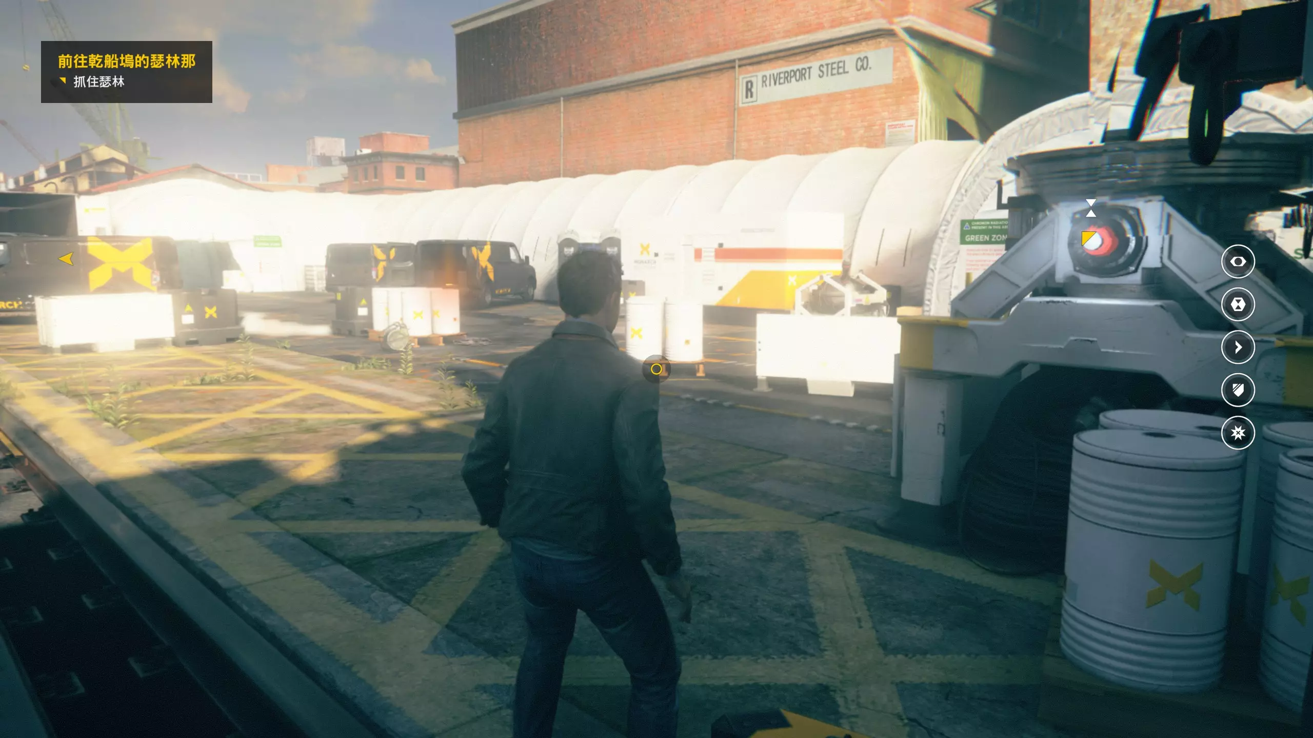 2.分歧点其实就是个二选一的选择题,实际上对后续流程没什么影响。每一个分歧点的两个选择都各有一个成就,完成选择时会立即跳出成就。 建议选择完一个后立即暂停以读取最近检查点,再去选另一个,可以节约时间,更重要的是可以避免收集进度丢失的情况——因为分歧点不同会导致后续流程中部分收集品内容不完全相同,但收集品所在的点位基本是没什么变化的,而且是等值的(换种说法,从头到尾只走单线达成全收集即可)。如果对此不放心的话,就先和本指南选一样的吧!这里我选的是不杀人质而是让她作假证,即右侧选择,我更喜欢这个选择。后续的收藏品中,有的物品名称后会带有括号,表明该收藏品是因你在某个分歧点的特定选择而出现的。 当达成完整一幕剧情的全收集后,该幕结束时会播放一段较长的剧情影片——分歧点的选择所造成的影响也会在其中体现。若不想观看,可选择跳过,但这可能会影响玩家对游戏剧情走向的准确把握(我就没看,感觉也还好)。由于该剧情影片需要实时在线缓冲,因此对玩家的网络和节点有一定要求。初次不快进、不跳过且完整看完一段剧情影片,可获得相关成就。第2幕-第1章:工业区 本节一共有9个故事物品,分别是2个文件、4个电脑、3个媒体;还有7个时元之源、1个情报物品、1个量子涟漪。 1.本小节一开始前方就是第1/7个时元之源。游戏中按下T键后可以进入技能升级页面,在该页面消耗时元之源可以升级你的各种时空技能。如果周围有时元之源,右侧表示时空视野技能的图标会闪烁(距离越近闪烁越频繁),在时空视野下会在画面中央显示它的方位。 时元之源全收集刚好够把每个技能都升满,对应于一个技能全升满的成就。