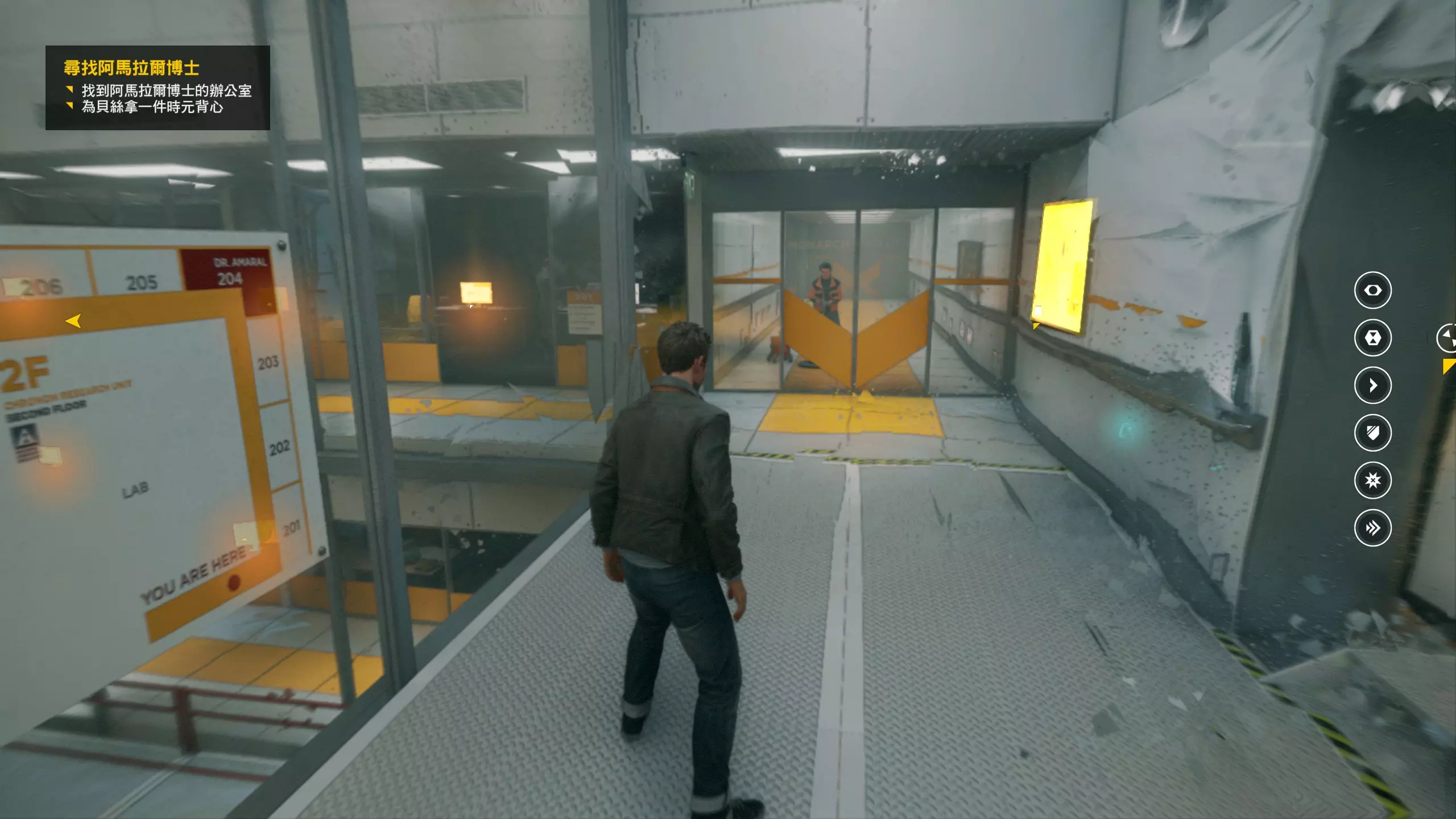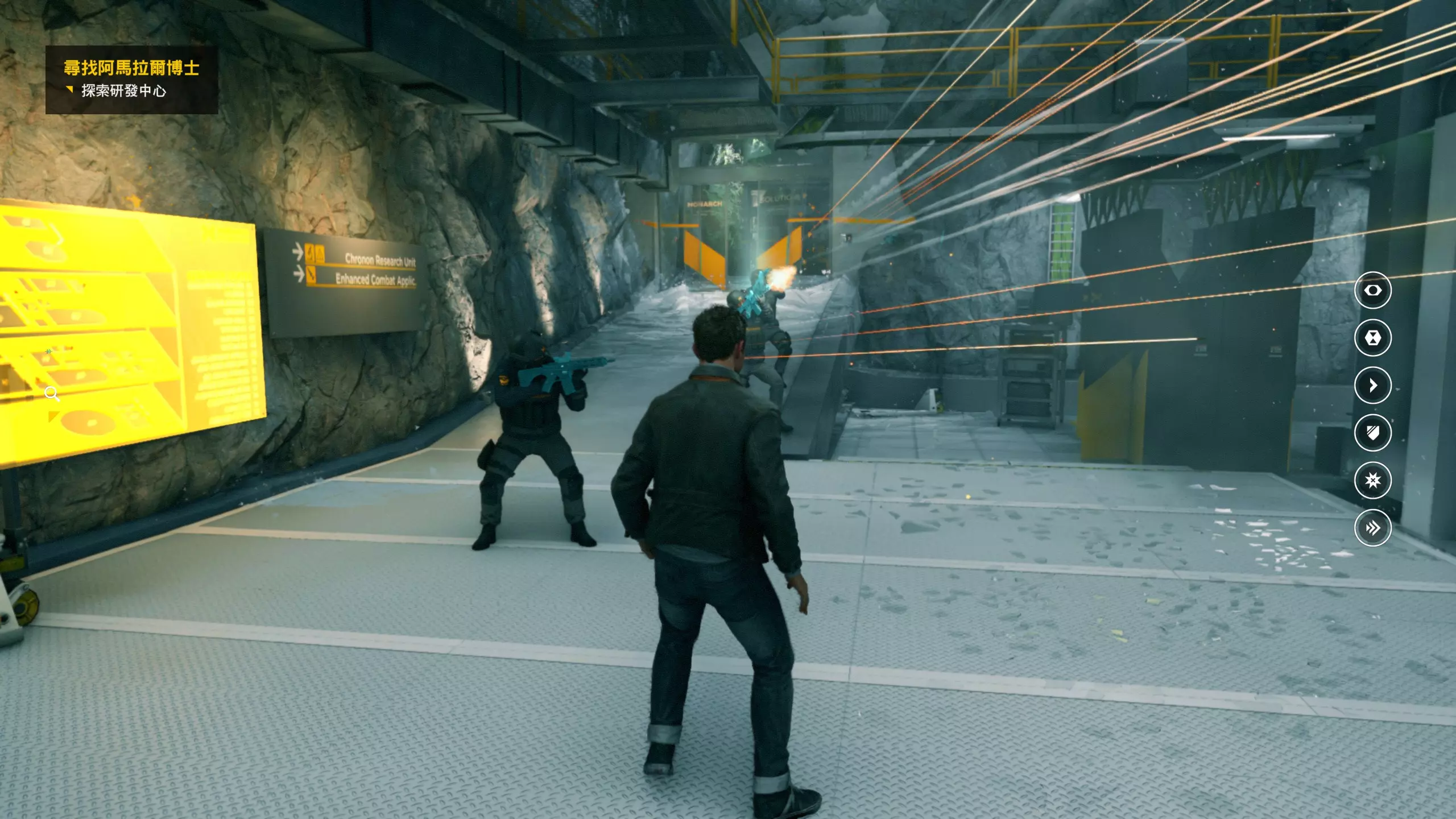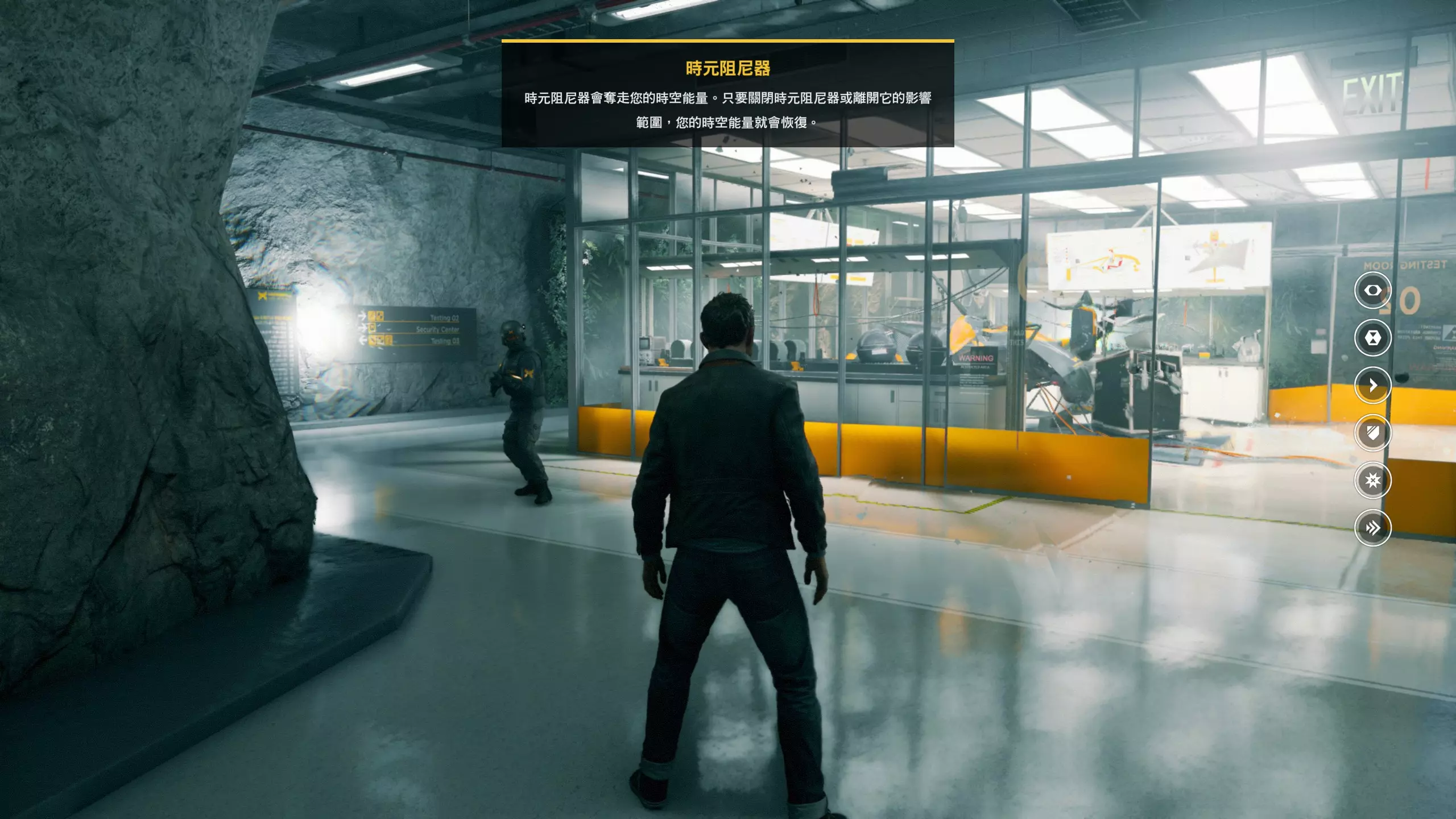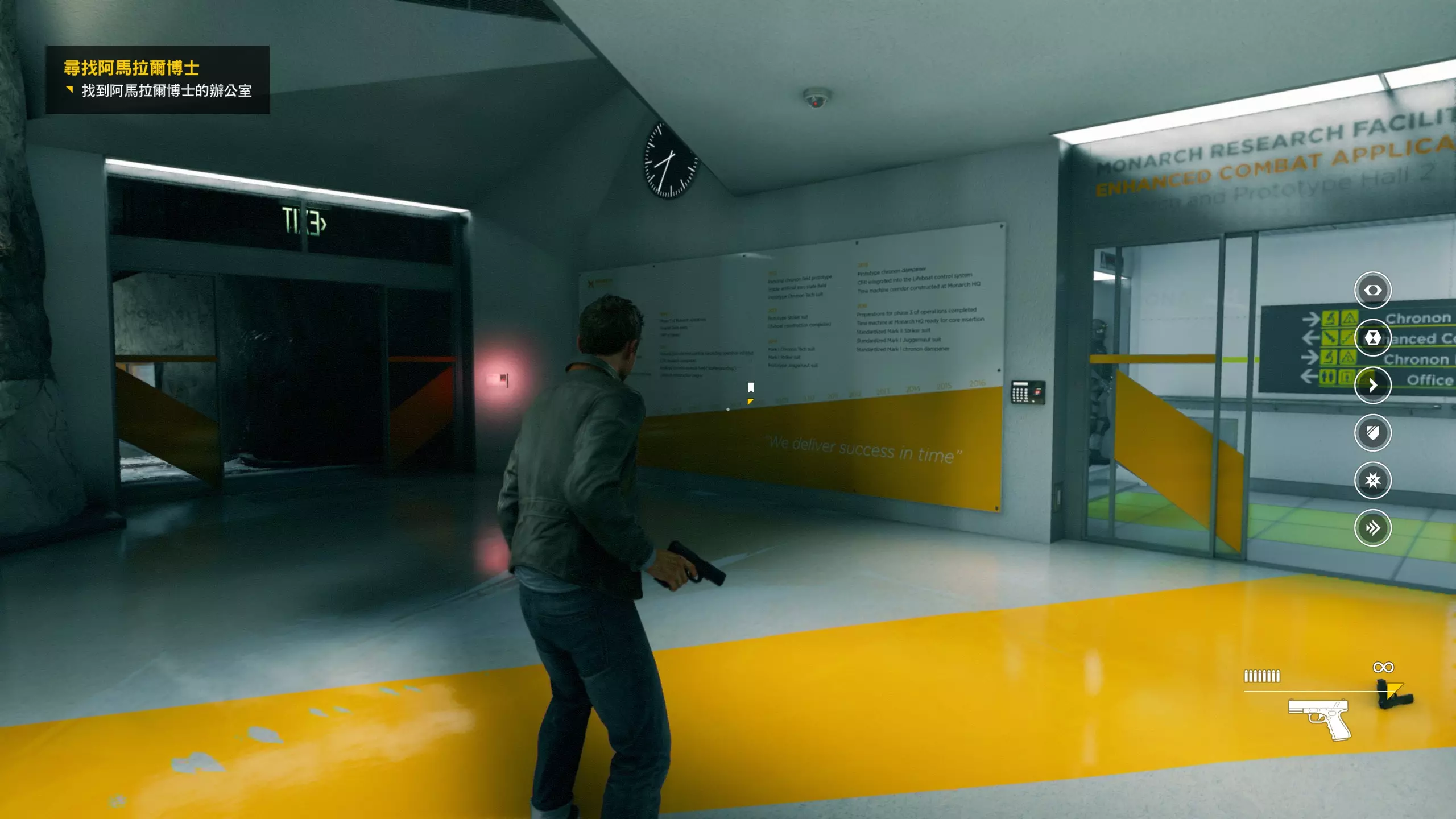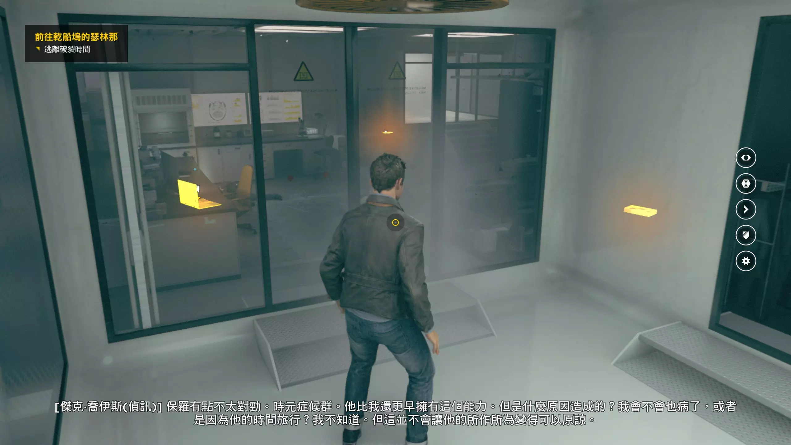 2.分歧点的选择,本指南选了左侧选项,即与杰克谈心(因为我更喜欢这个走向)。 第3幕-第1章:研究设施 本节一共有17个故事物品,分别是7个文件、8个电脑、2个媒体;还有8个时元之源、2个情报物品、1个量子涟漪。 1.本节最开始就会学习时空冲刺(长按时空闪避键以发动,也可以在技能效果结束时按下瞄准以触发焦点时间)。时空冲刺期间基本是无敌的,且靠近敌人时可以按下攻击键以实施近战击倒,平时还可以赶路用,是非常实用的技能。有一个成就是累计使用时空冲刺移动100米来获得,非常容易达成。 接着会遇到机枪台,可以利用时空冲刺抵达其后方以关闭它。然后,就在这个机枪台所在的位置,右边的楼梯高处是第1/8个【时元之源】。