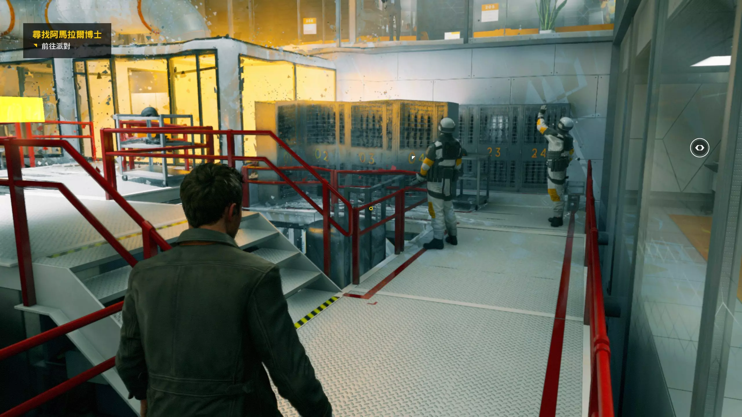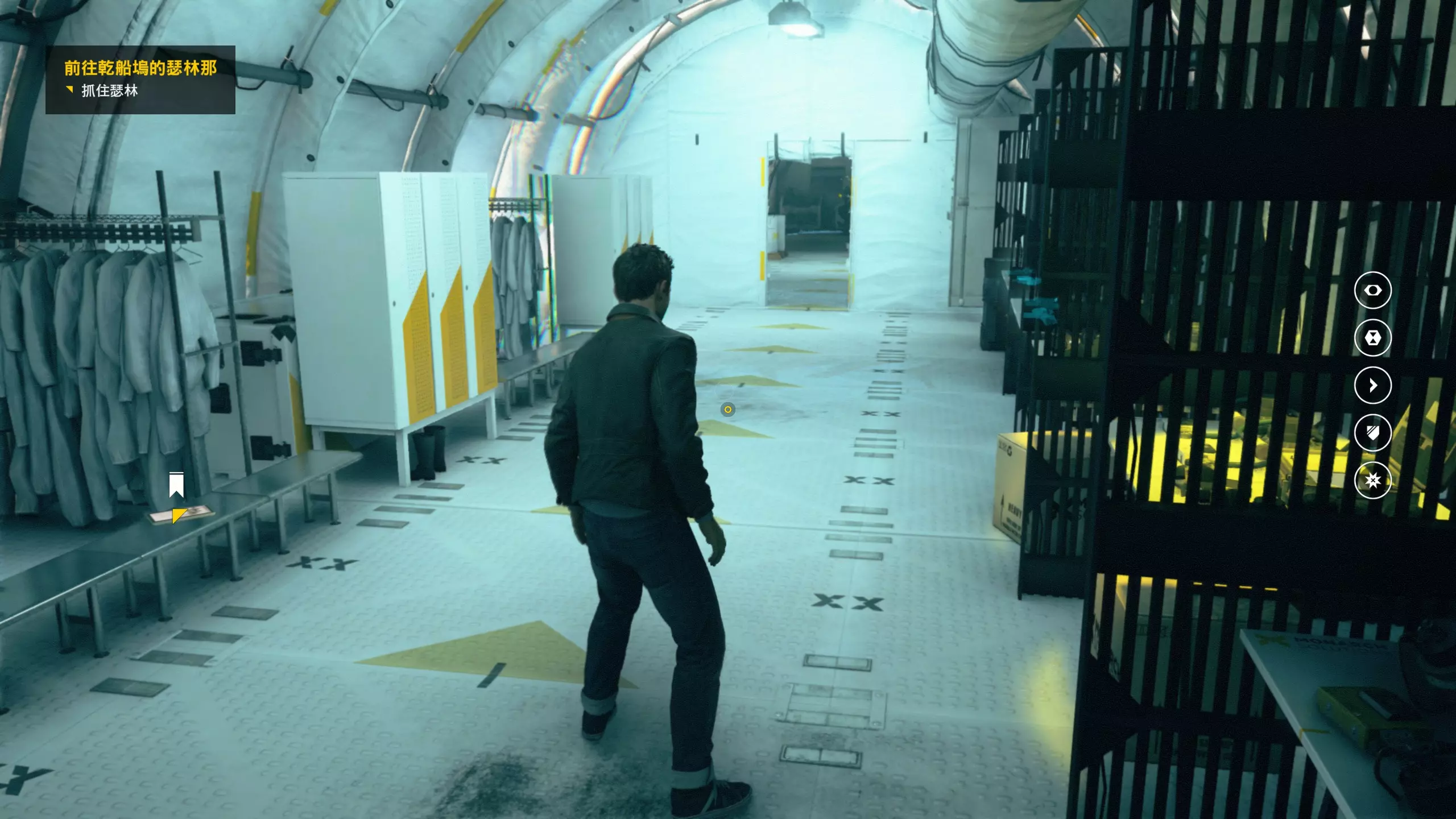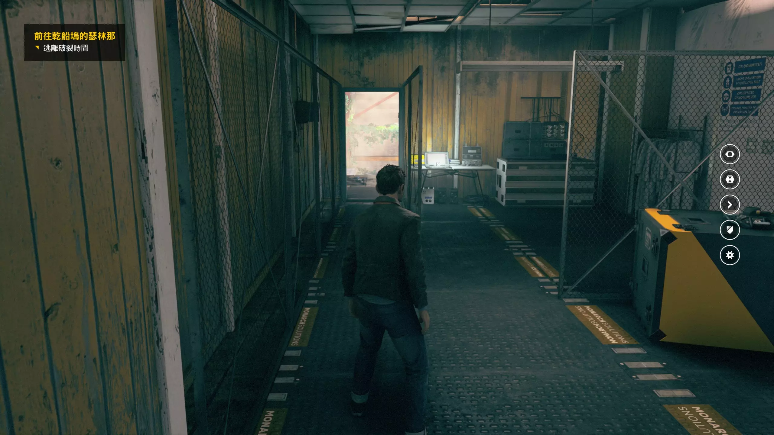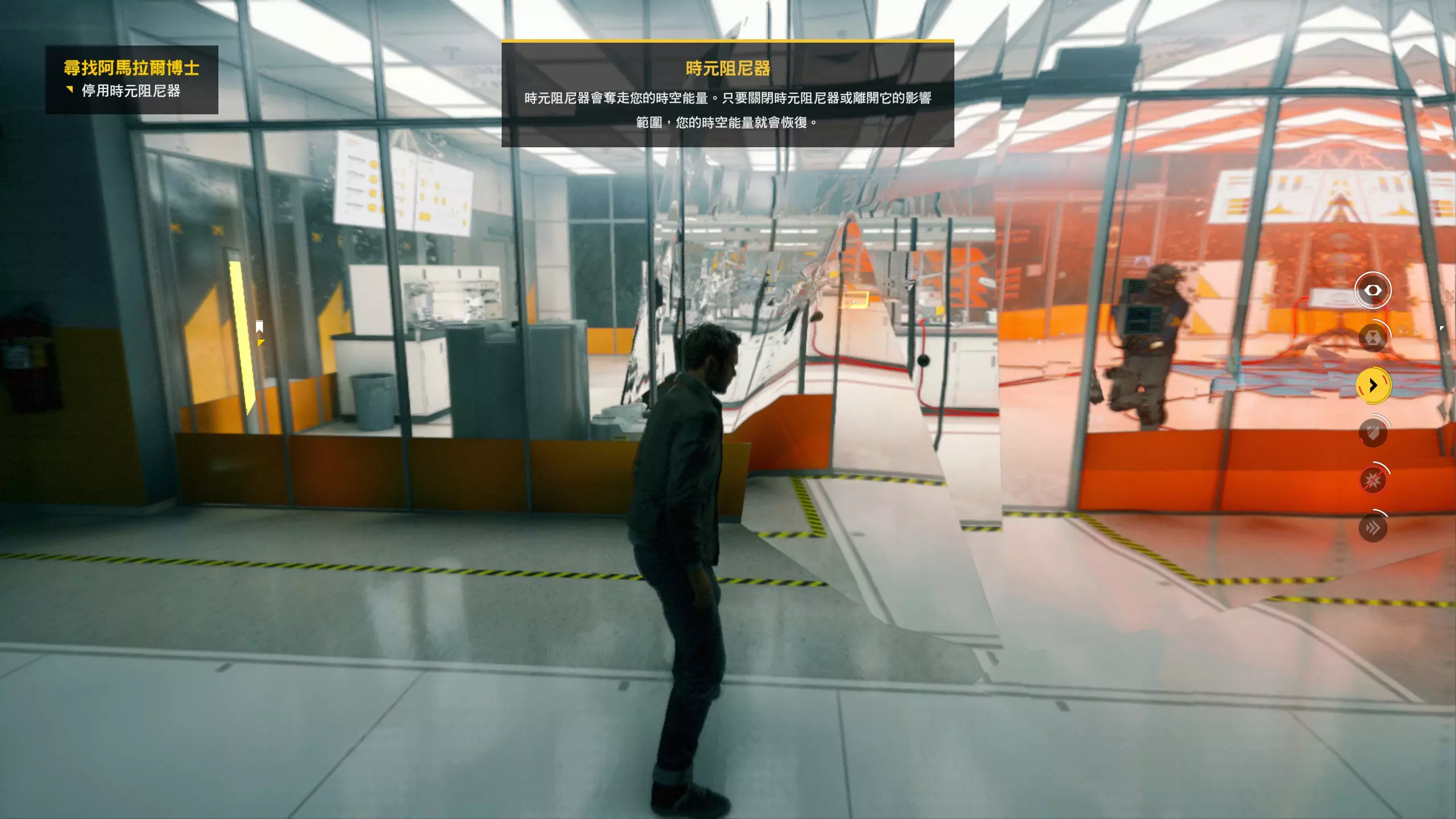 2.分歧点的选择,本指南选了左侧选项,即与杰克谈心(因为我更喜欢这个走向)。 第3幕-第1章:研究设施 本节一共有17个故事物品,分别是7个文件、8个电脑、2个媒体;还有8个时元之源、2个情报物品、1个量子涟漪。 1.本节最开始就会学习时空冲刺(长按时空闪避键以发动,也可以在技能效果结束时按下瞄准以触发焦点时间)。时空冲刺期间基本是无敌的,且靠近敌人时可以按下攻击键以实施近战击倒,平时还可以赶路用,是非常实用的技能。有一个成就是累计使用时空冲刺移动100米来获得,非常容易达成。 接着会遇到机枪台,可以利用时空冲刺抵达其后方以关闭它。然后,就在这个机枪台所在的位置,右边的楼梯高处是第1/8个【时元之源】。