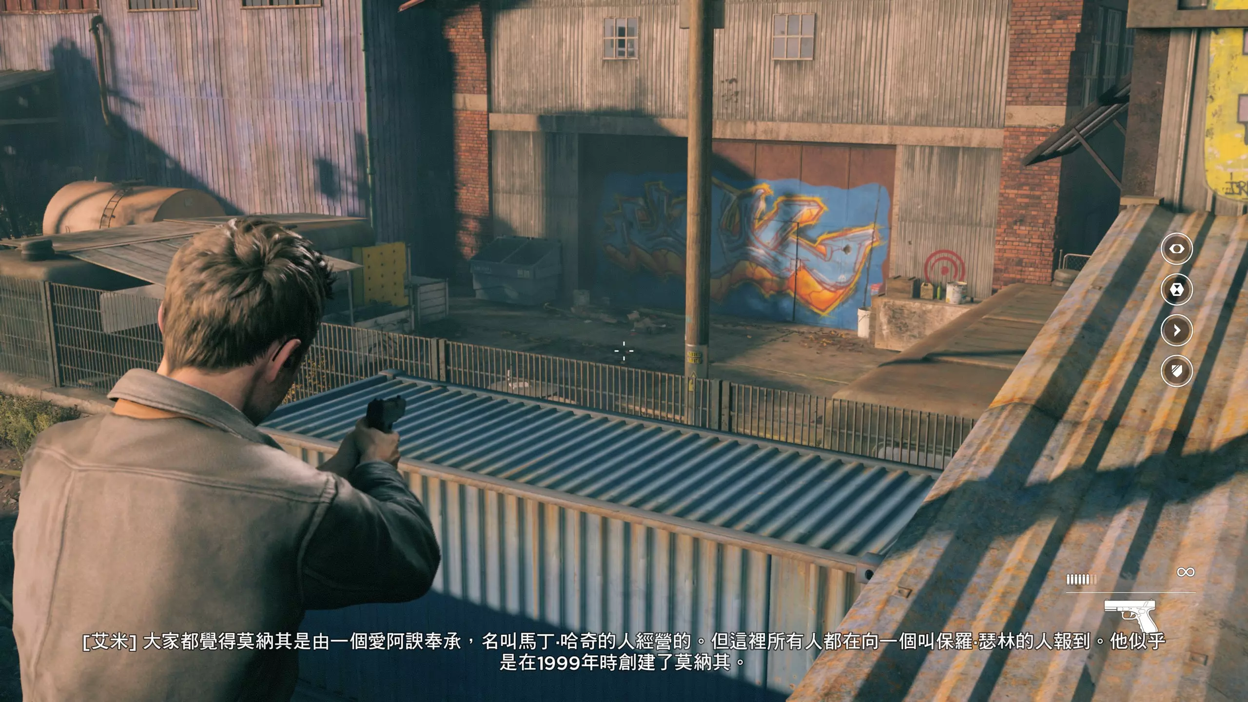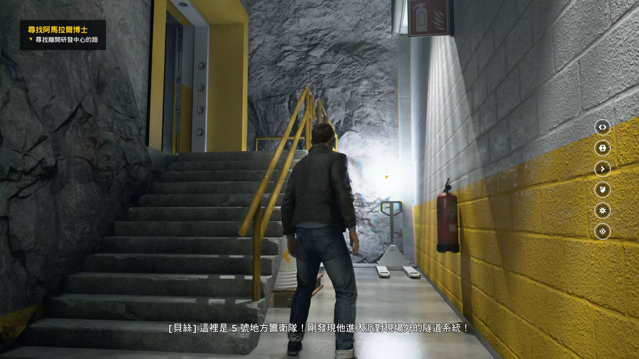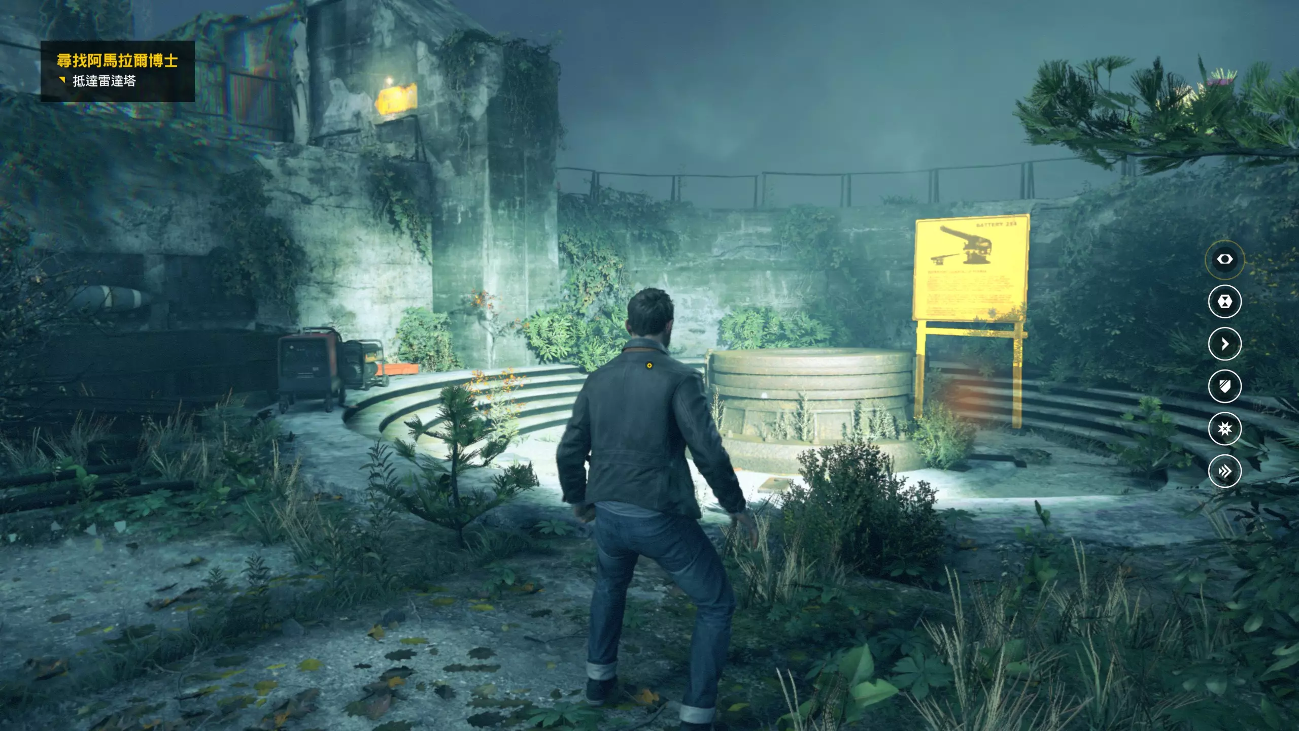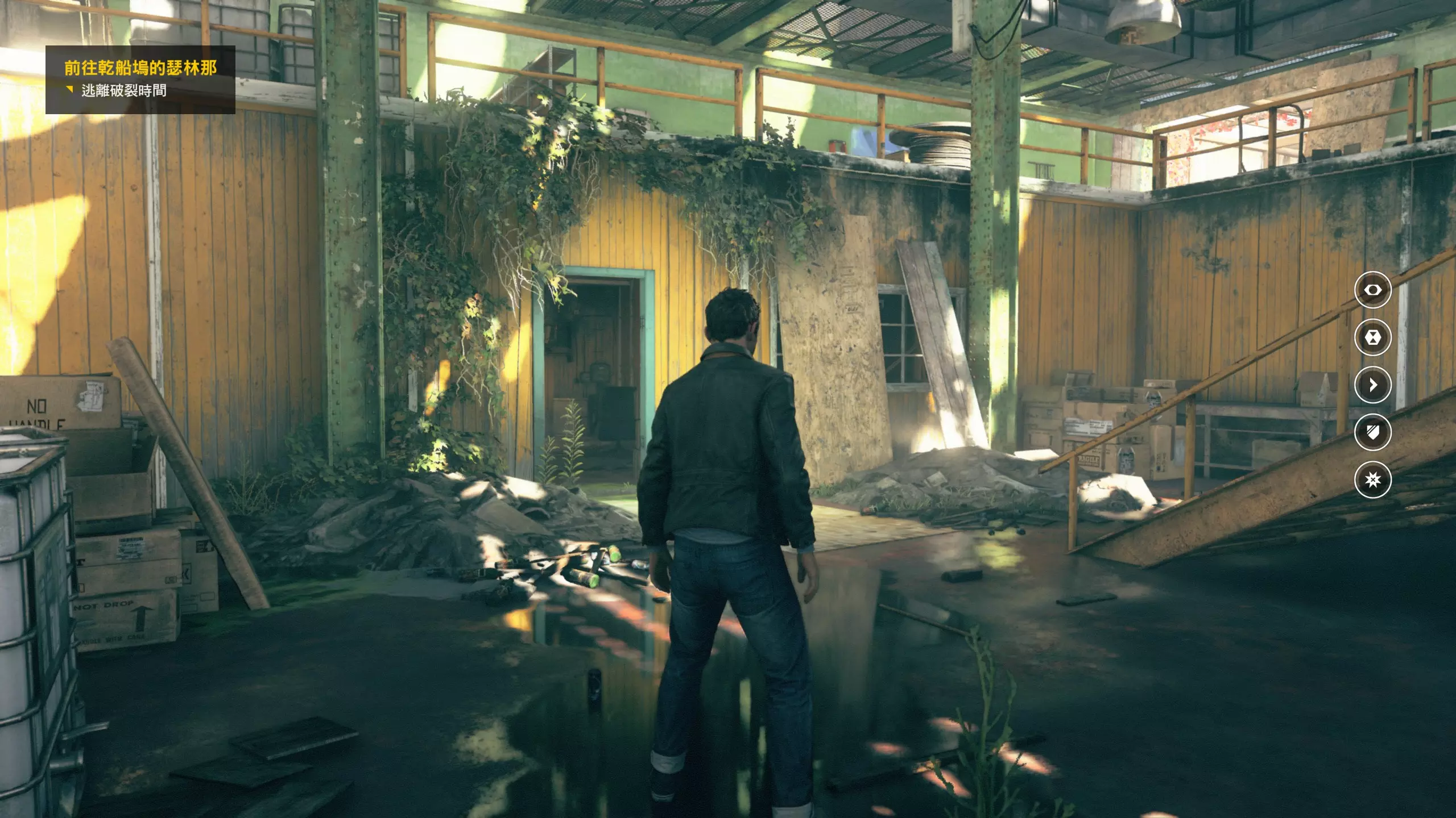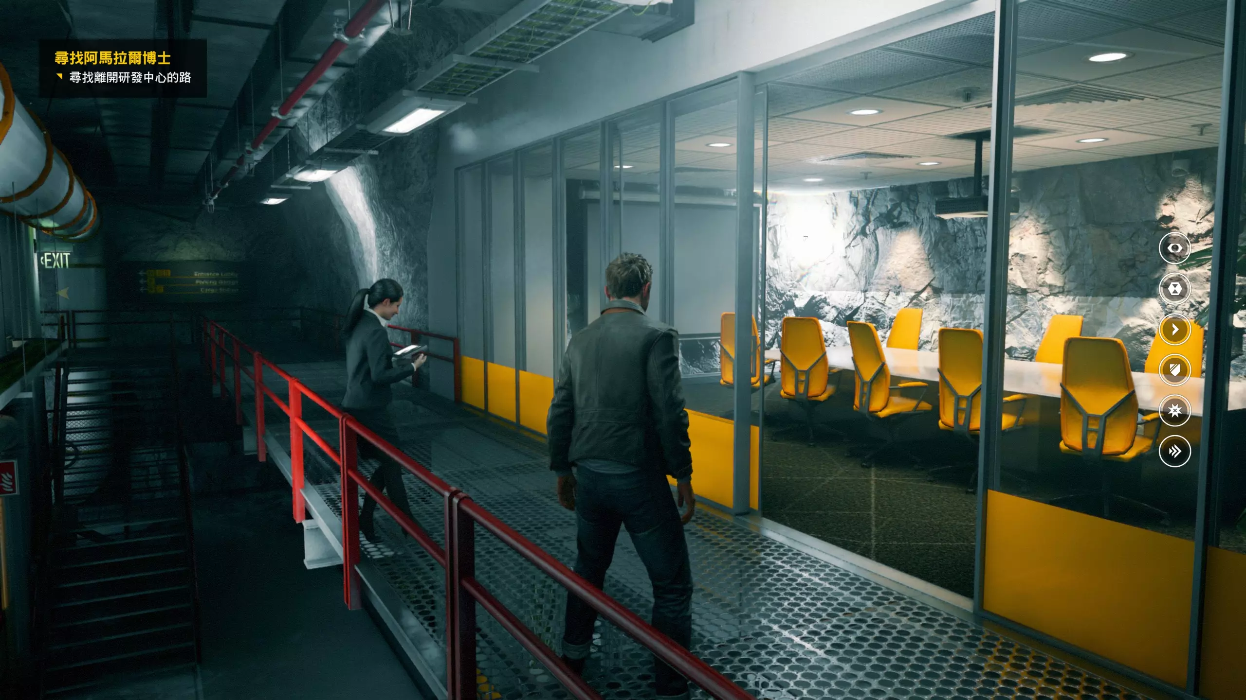 2.分歧点的选择,本指南选了左侧选项,即与杰克谈心(因为我更喜欢这个走向)。 第3幕-第1章:研究设施 本节一共有17个故事物品,分别是7个文件、8个电脑、2个媒体;还有8个时元之源、2个情报物品、1个量子涟漪。 1.本节最开始就会学习时空冲刺(长按时空闪避键以发动,也可以在技能效果结束时按下瞄准以触发焦点时间)。时空冲刺期间基本是无敌的,且靠近敌人时可以按下攻击键以实施近战击倒,平时还可以赶路用,是非常实用的技能。有一个成就是累计使用时空冲刺移动100米来获得,非常容易达成。 接着会遇到机枪台,可以利用时空冲刺抵达其后方以关闭它。然后,就在这个机枪台所在的位置,右边的楼梯高处是第1/8个【时元之源】。