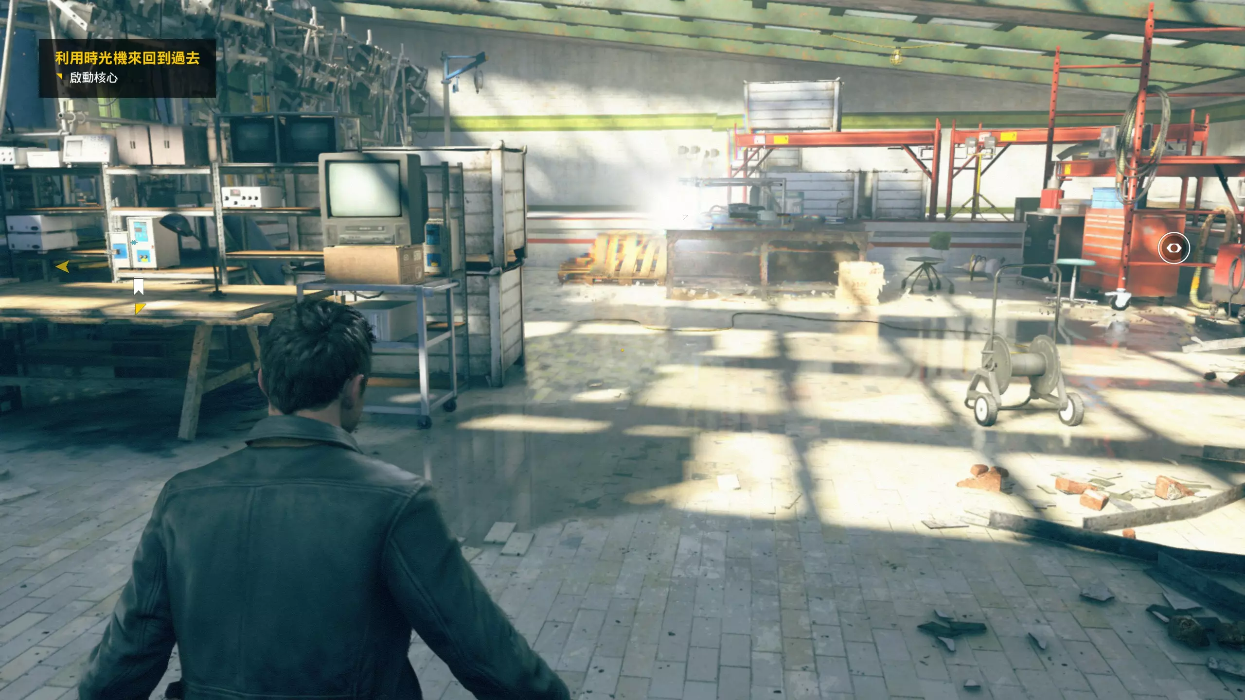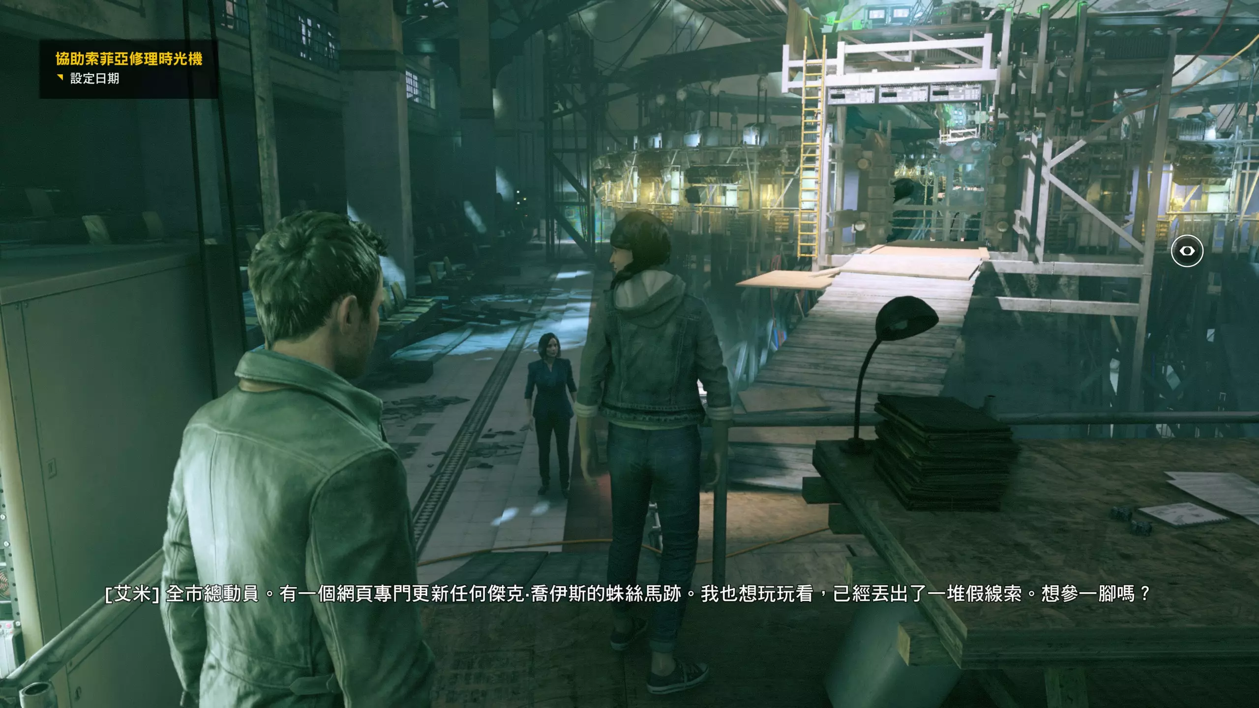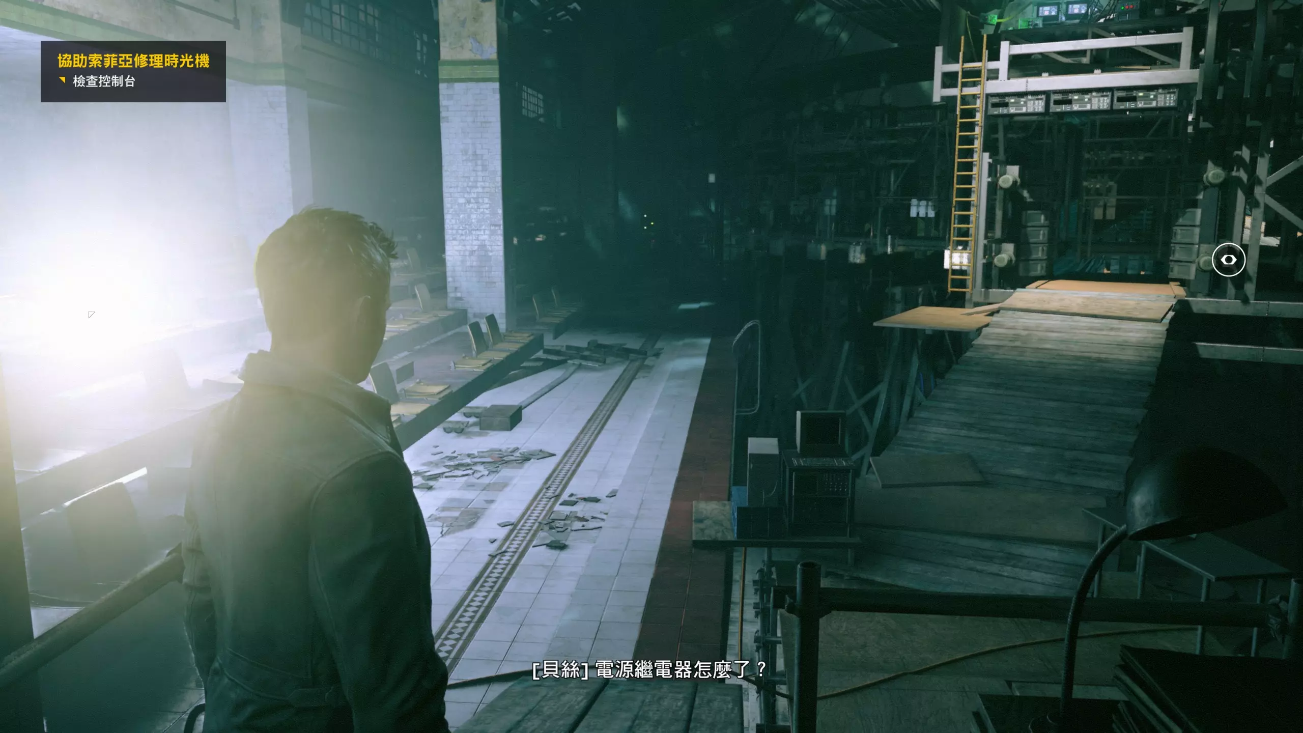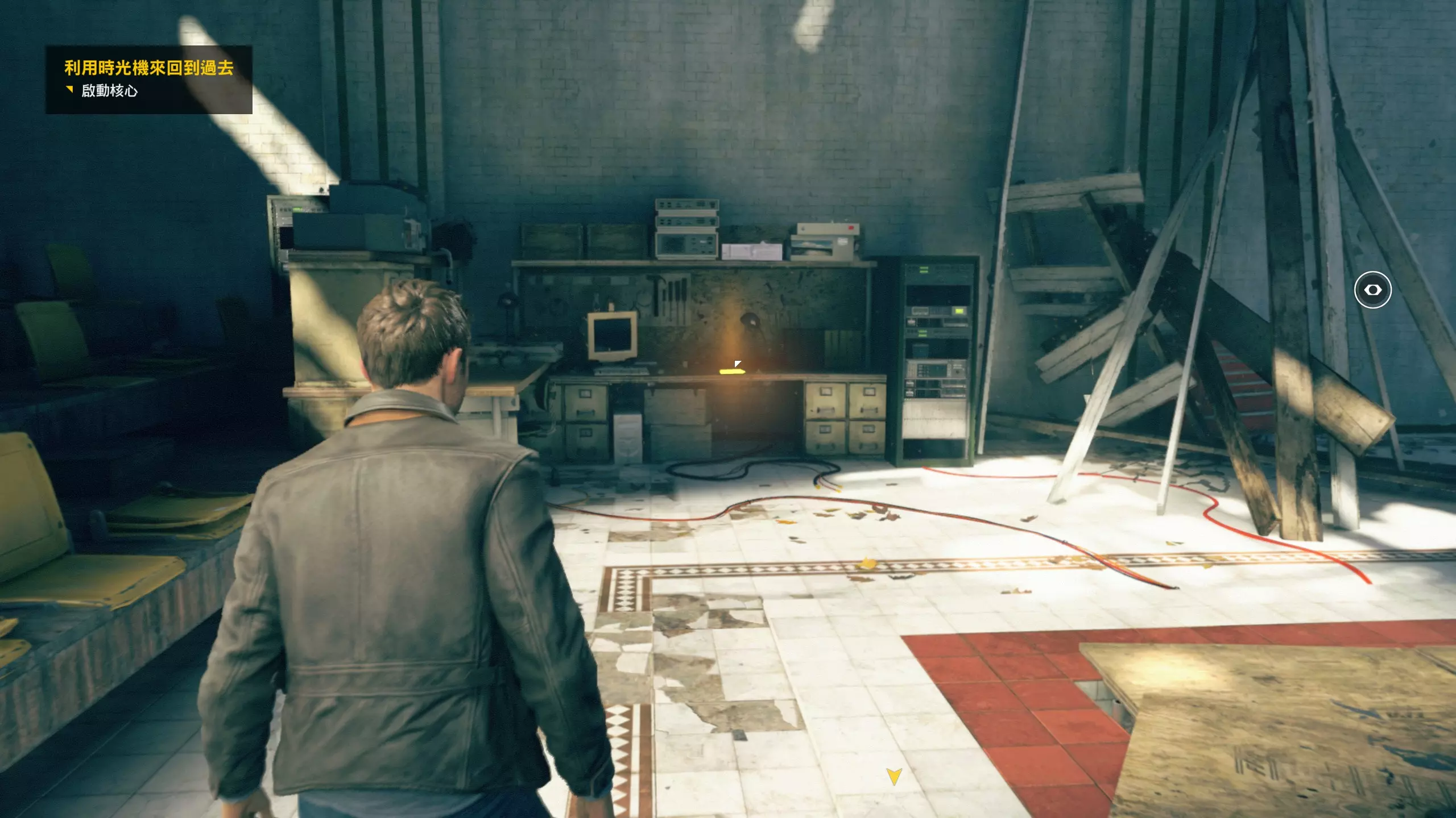 第4幕-第4章:威廉的工作室(2010年) 本节一共有5个故事物品,分别是4个文件、1个媒体;还有3个时元之源、1个量子涟漪。 1.跟随贝丝走到下图位置时,左侧灯下的配电箱可以互动,是量子涟漪1/1,容易错过。