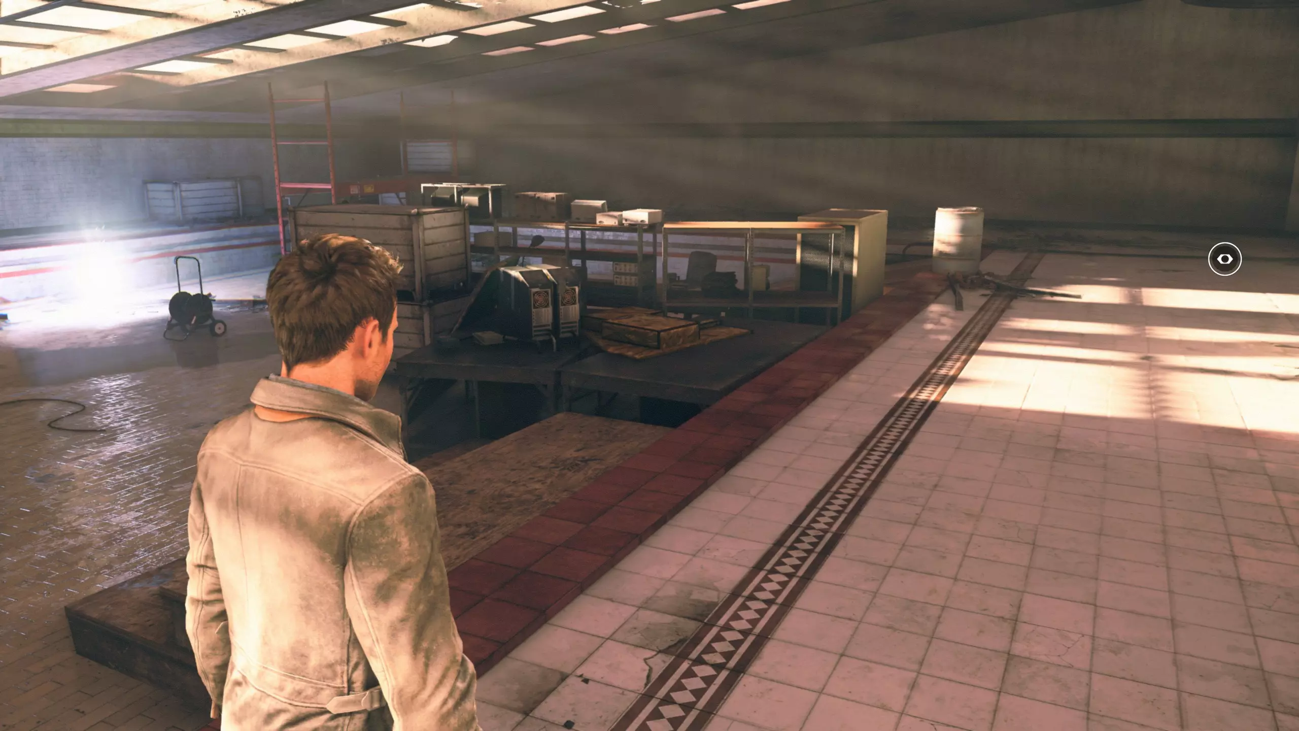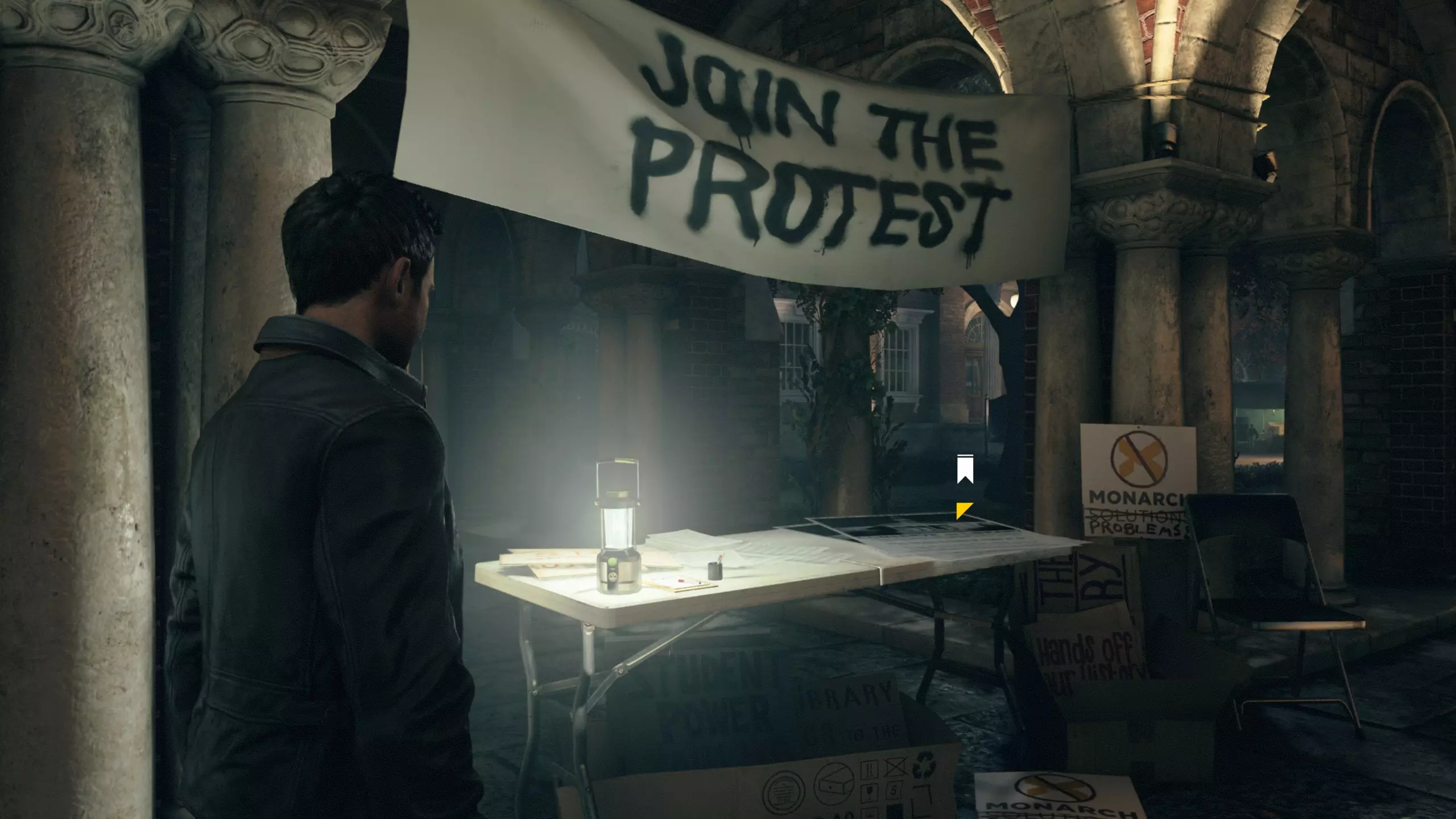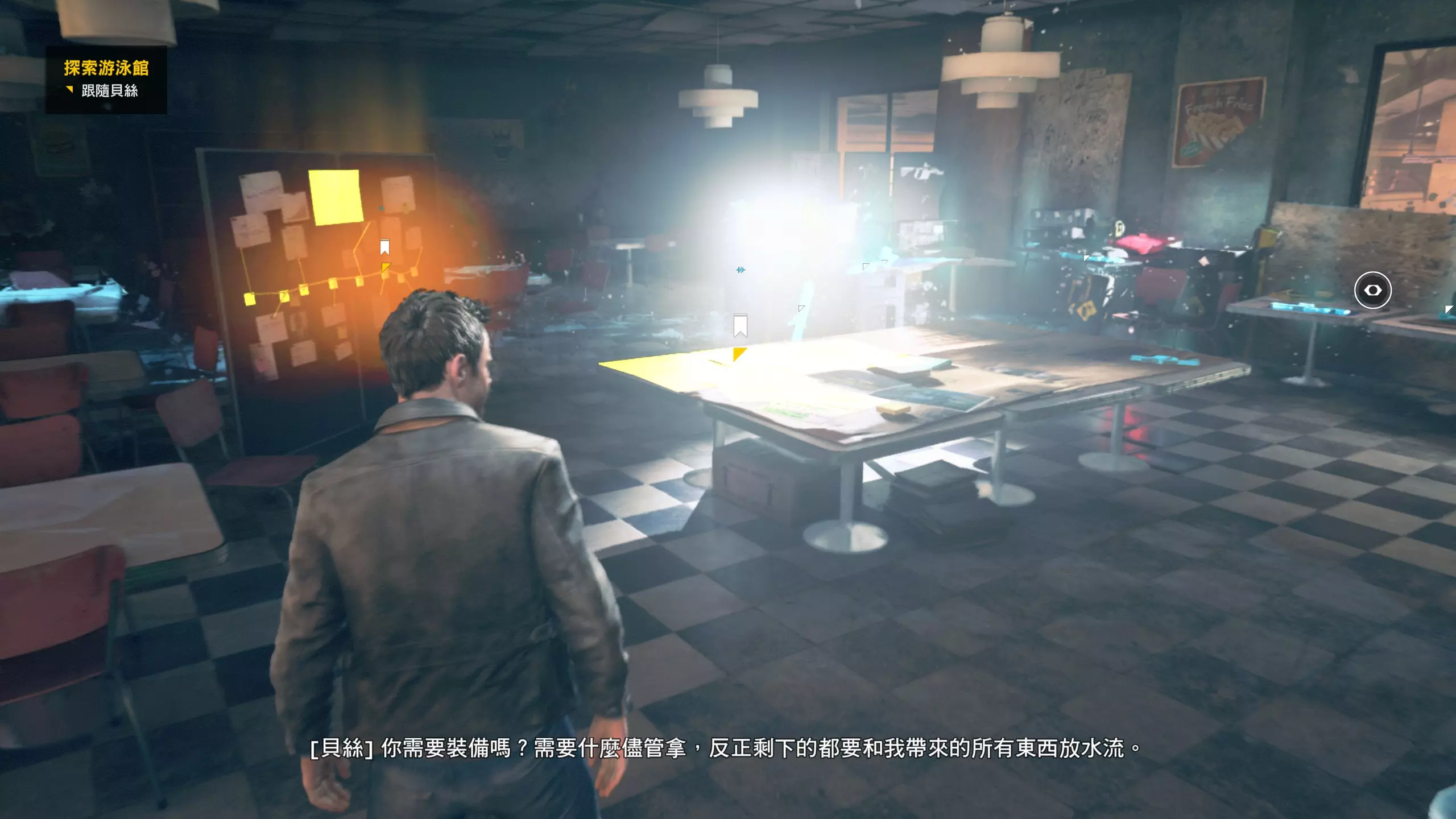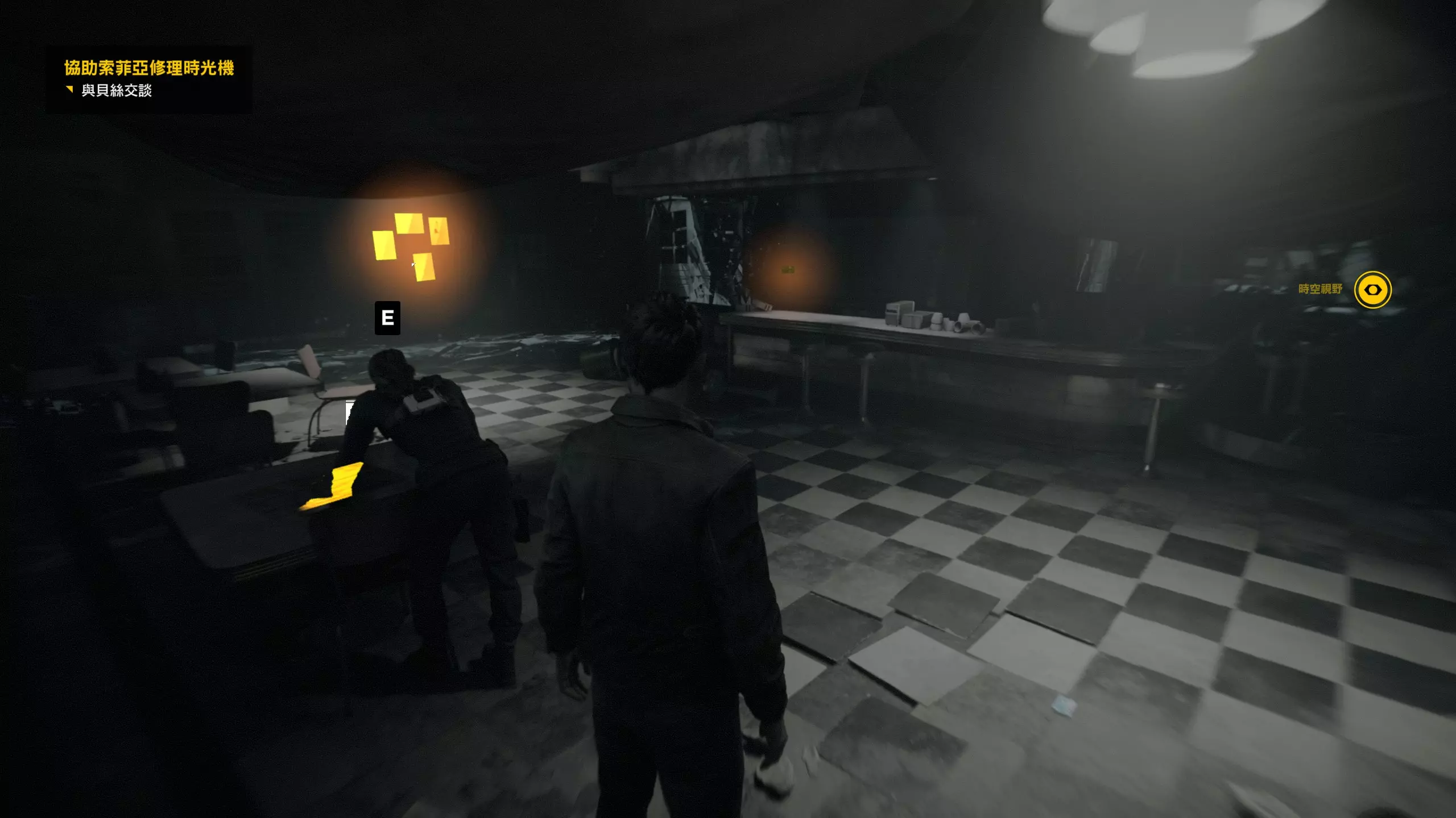 第4幕-第4章:威廉的工作室(2010年) 本节一共有5个故事物品,分别是4个文件、1个媒体;还有3个时元之源、1个量子涟漪。 1.跟随贝丝走到下图位置时,左侧灯下的配电箱可以互动,是量子涟漪1/1,容易错过。