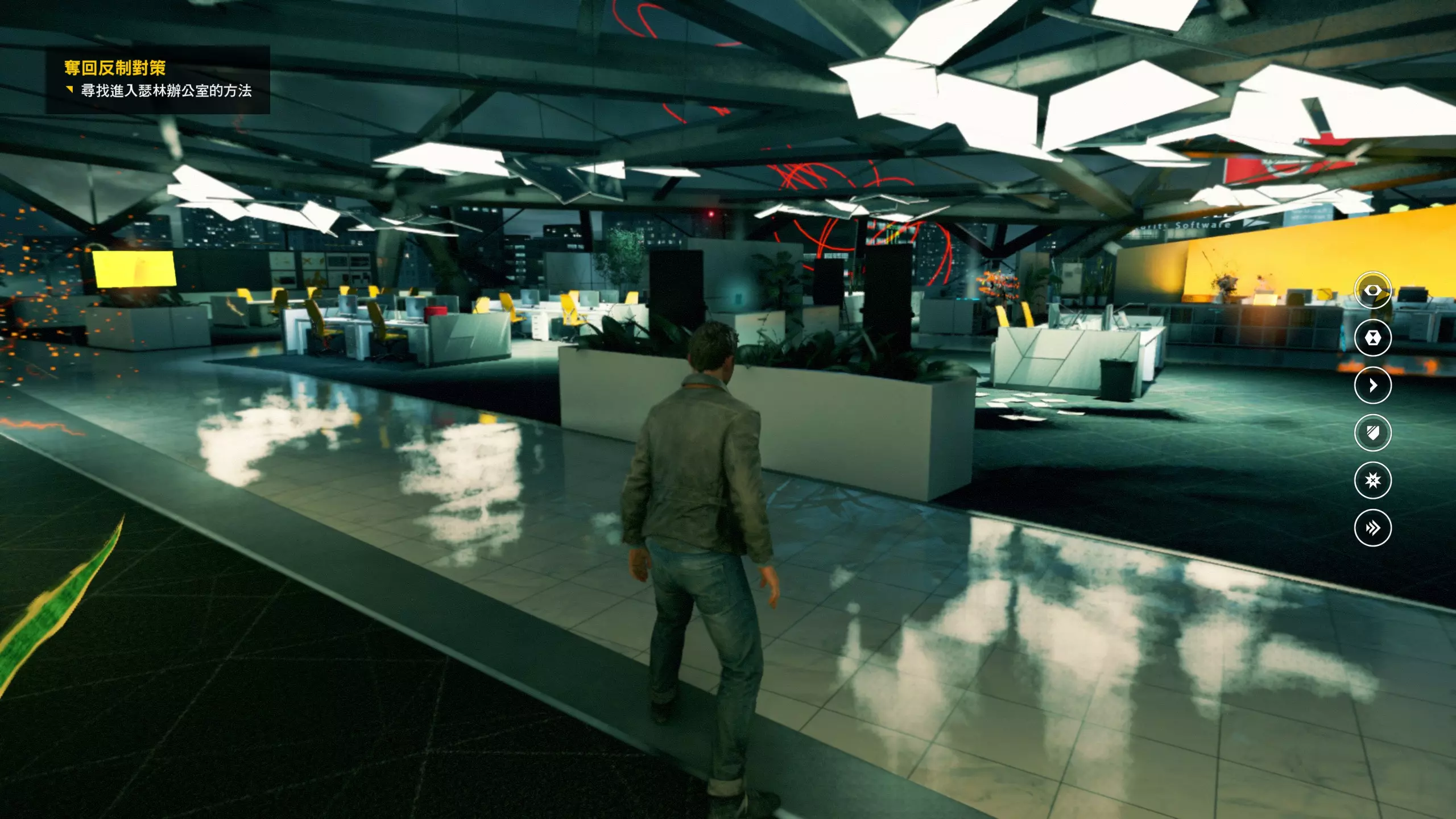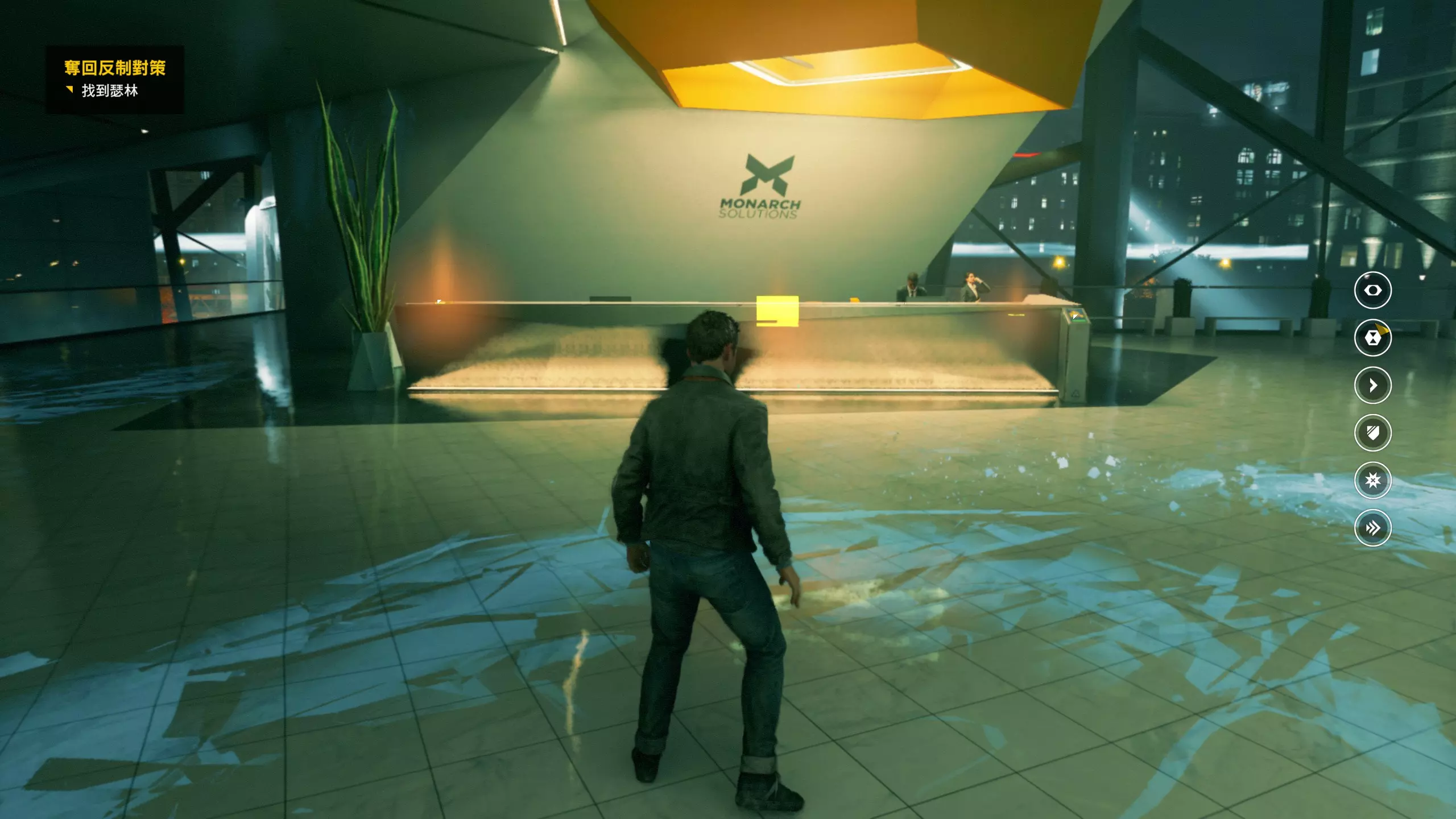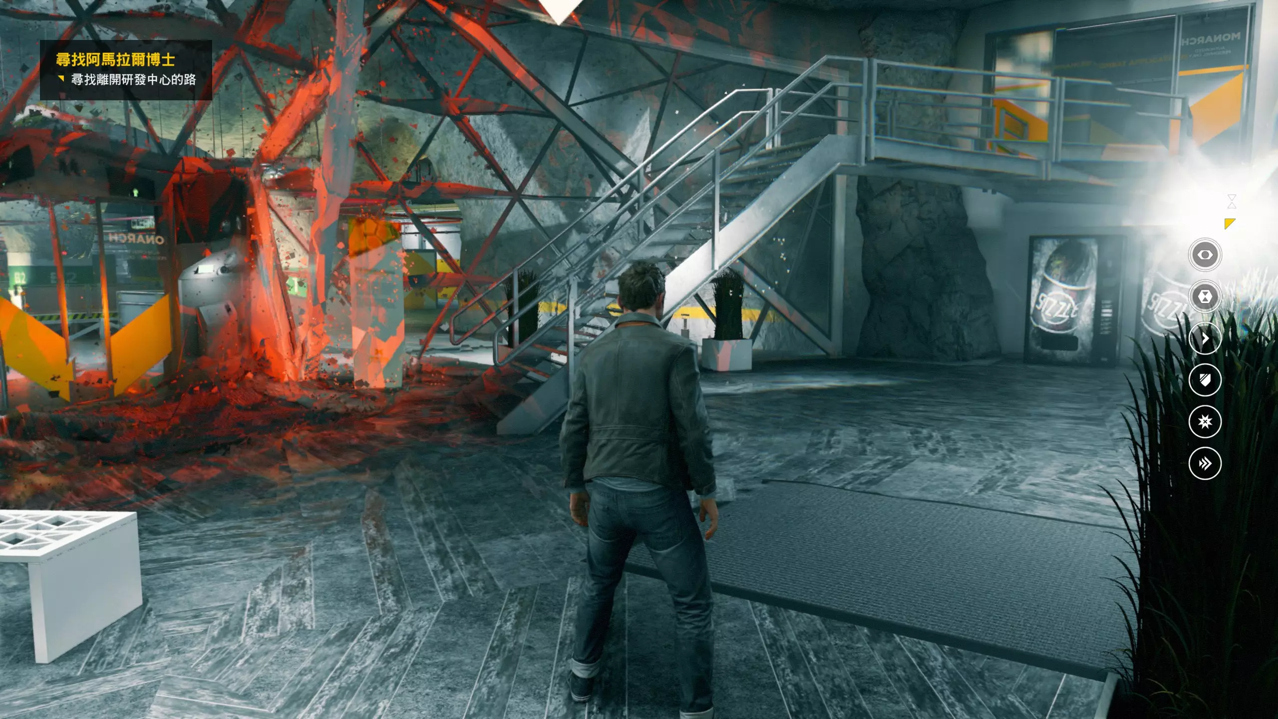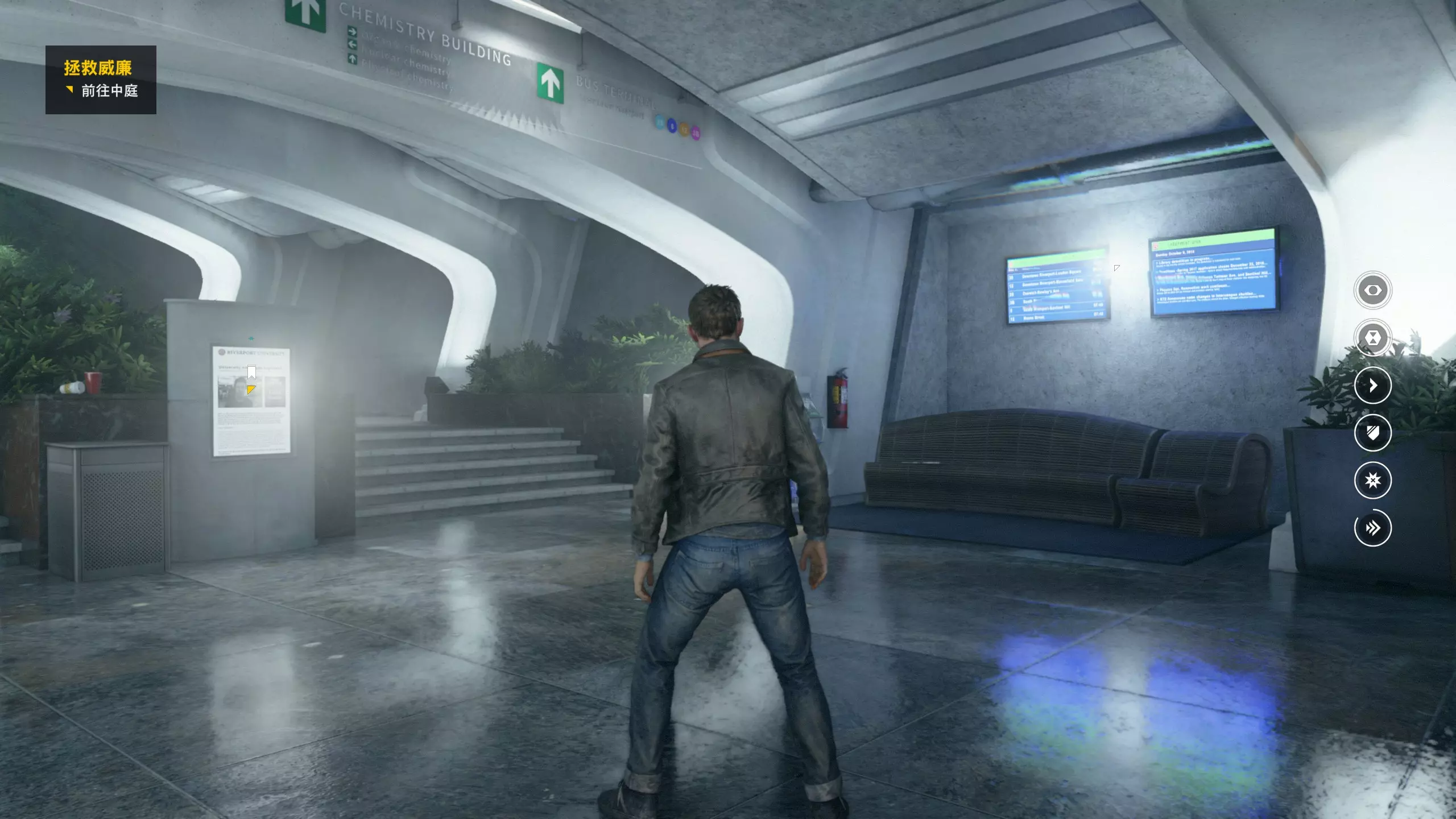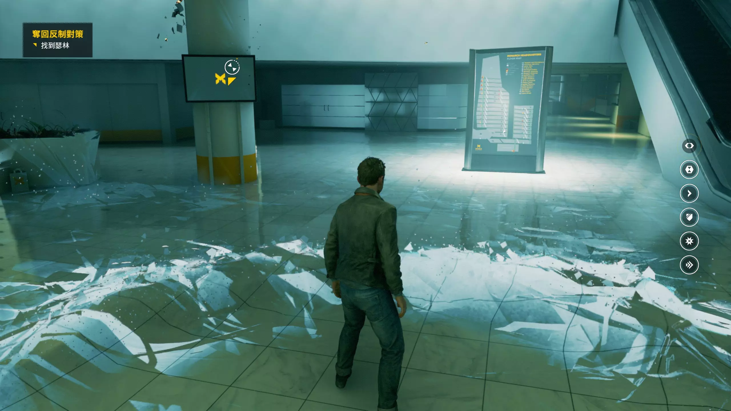3.在解救保罗的战斗环节中会学会时空护盾。在时空护盾范围内玩家的生命会加快回复,而如果离开时空护盾范围,时空护盾会立即失效;时空护盾生成的瞬间会造成击退和时缓效果。有一个成就是累计用时空护盾格挡200发子弹,多用就能很快达成(尤其是后面还会面对机枪,对于困难模式玩家来说护盾绝对是保命技能)。 第1幕-分歧点:强硬手段/公共关系 本节一共有2个故事物品,是2个文件;还有1个量子涟漪。 1.每一幕的最后都是分歧点(除了最后一幕),分歧点作为特殊的短暂章节,其流程内也有收集品。本节的收集品都在右侧,从近到远依次是【量子涟漪1/1】、【第1/2个文件(1/2)】、【第2个文件(2/2)】。建议先确保收集完所有能收集的物品后,再去与分歧点互动。