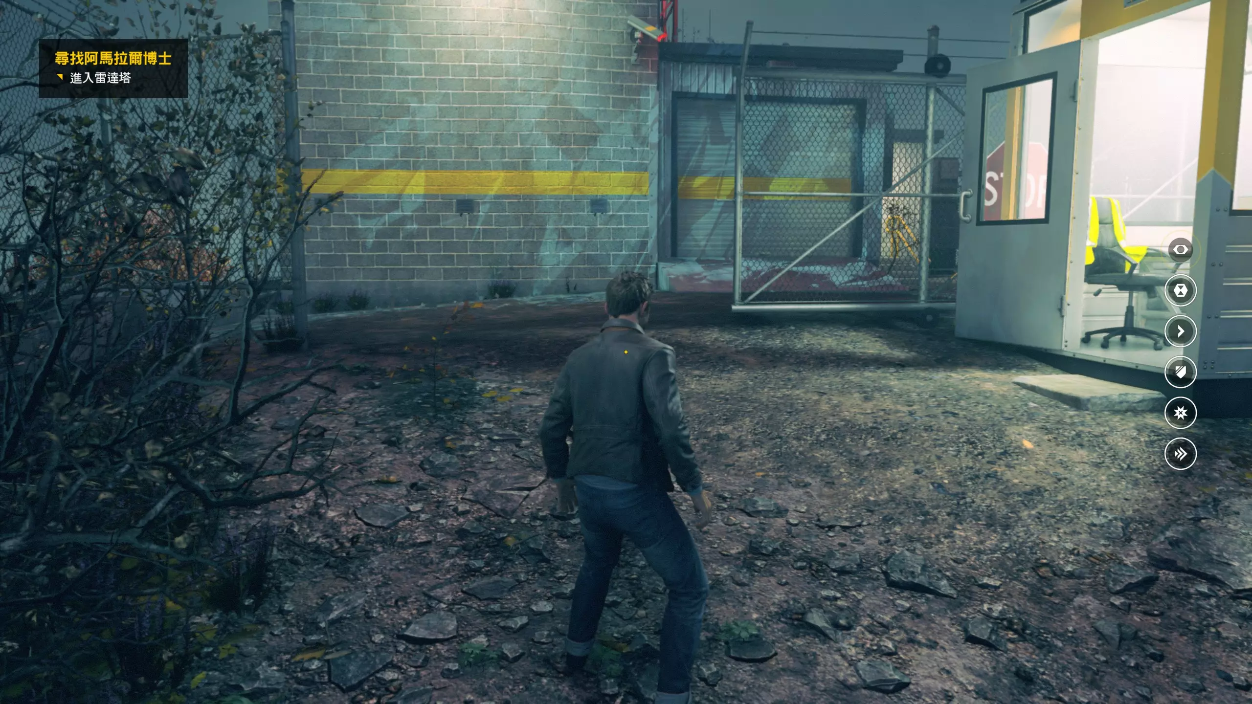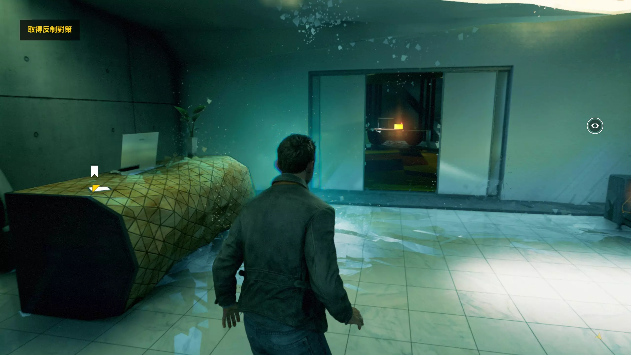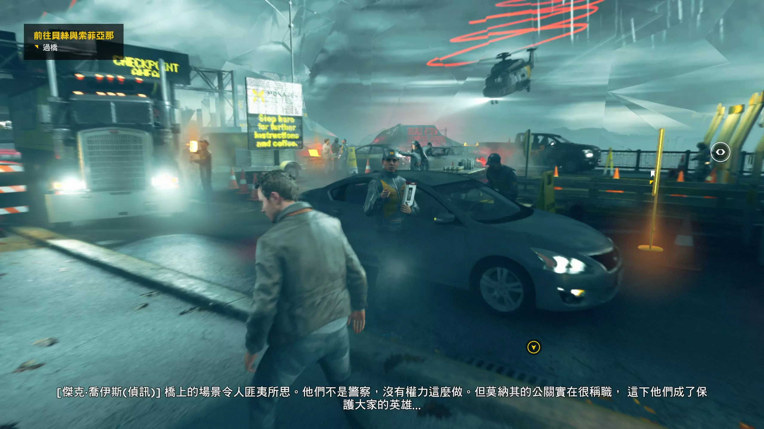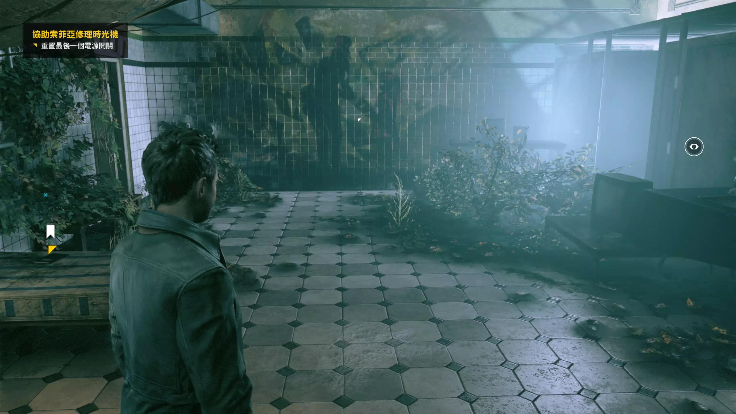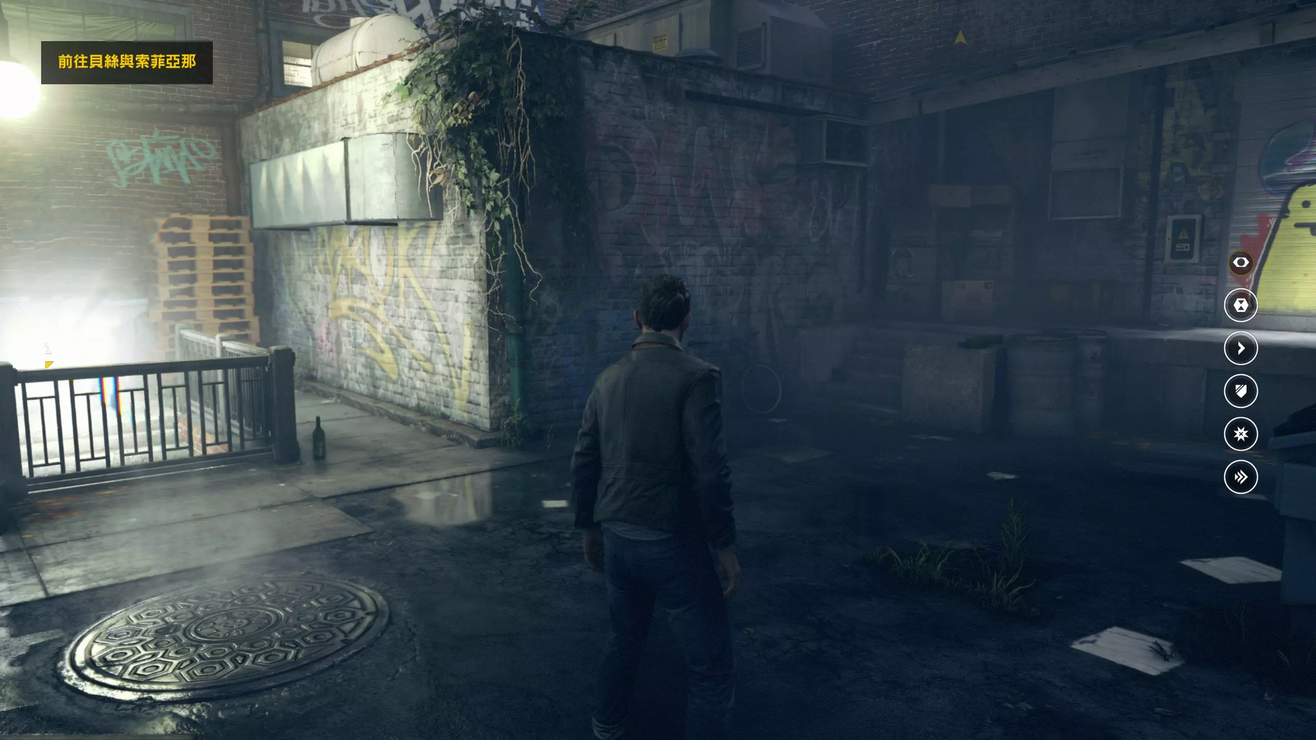 3.在解救保罗的战斗环节中会学会时空护盾。在时空护盾范围内玩家的生命会加快回复,而如果离开时空护盾范围,时空护盾会立即失效;时空护盾生成的瞬间会造成击退和时缓效果。有一个成就是累计用时空护盾格挡200发子弹,多用就能很快达成(尤其是后面还会面对机枪,对于困难模式玩家来说护盾绝对是保命技能)。 第1幕-分歧点:强硬手段/公共关系 本节一共有2个故事物品,是2个文件;还有1个量子涟漪。 1.每一幕的最后都是分歧点(除了最后一幕),分歧点作为特殊的短暂章节,其流程内也有收集品。本节的收集品都在右侧,从近到远依次是【量子涟漪1/1】、【第1/2个文件(1/2)】、【第2个文件(2/2)】。建议先确保收集完所有能收集的物品后,再去与分歧点互动。