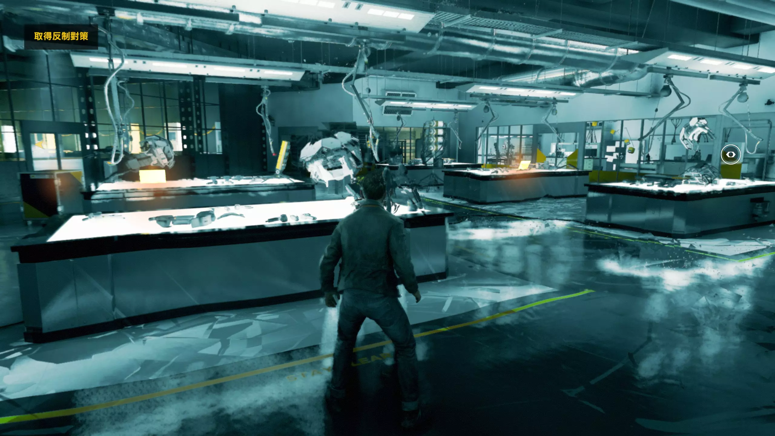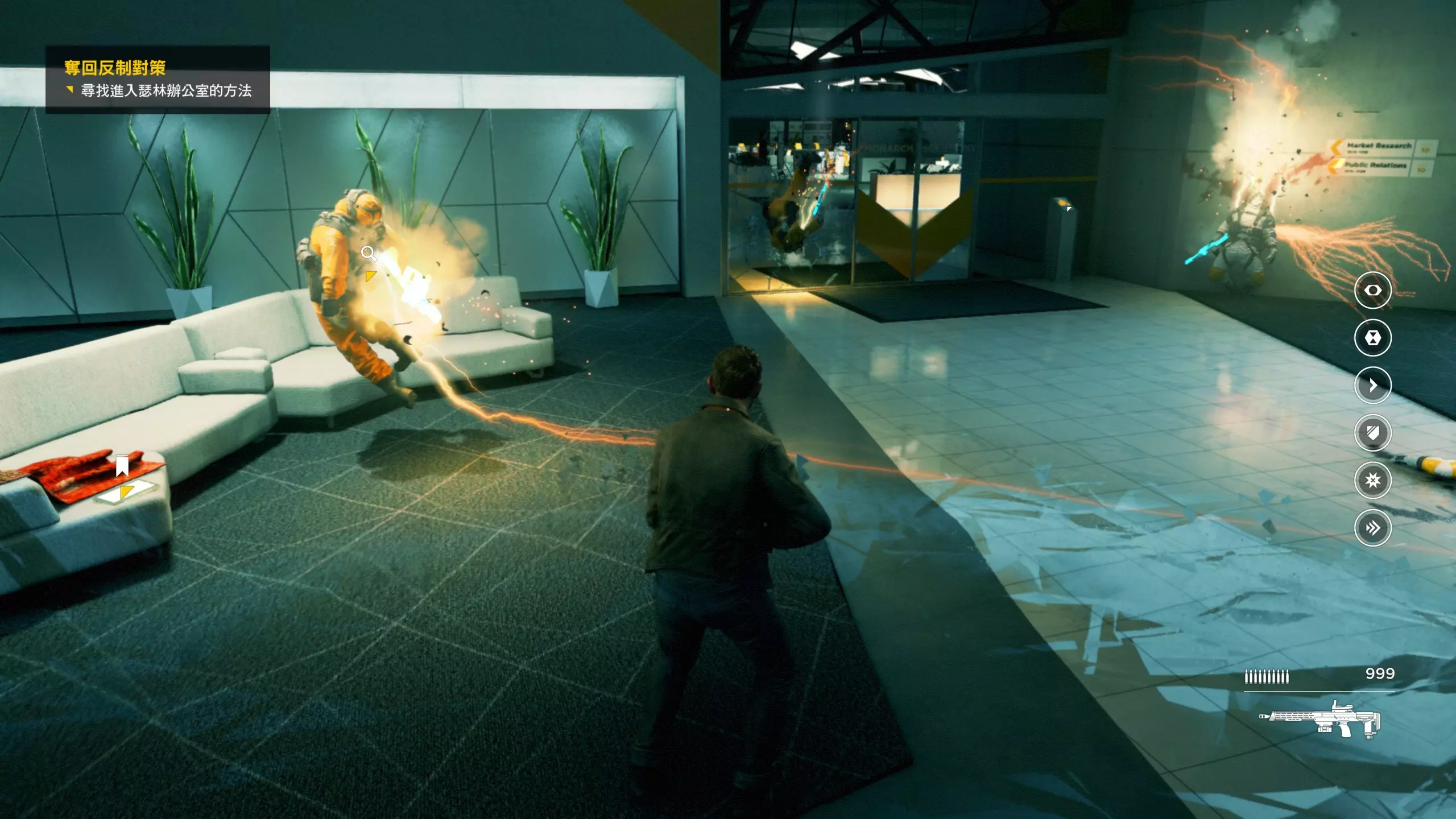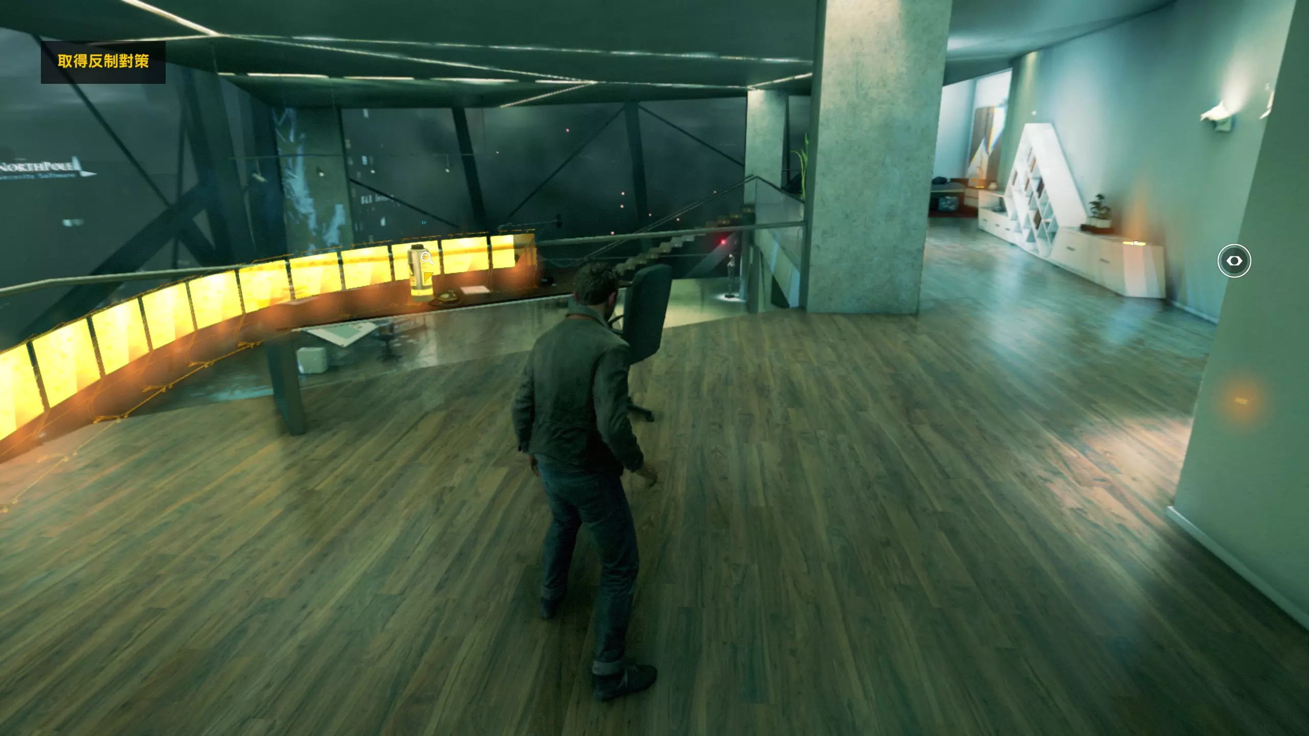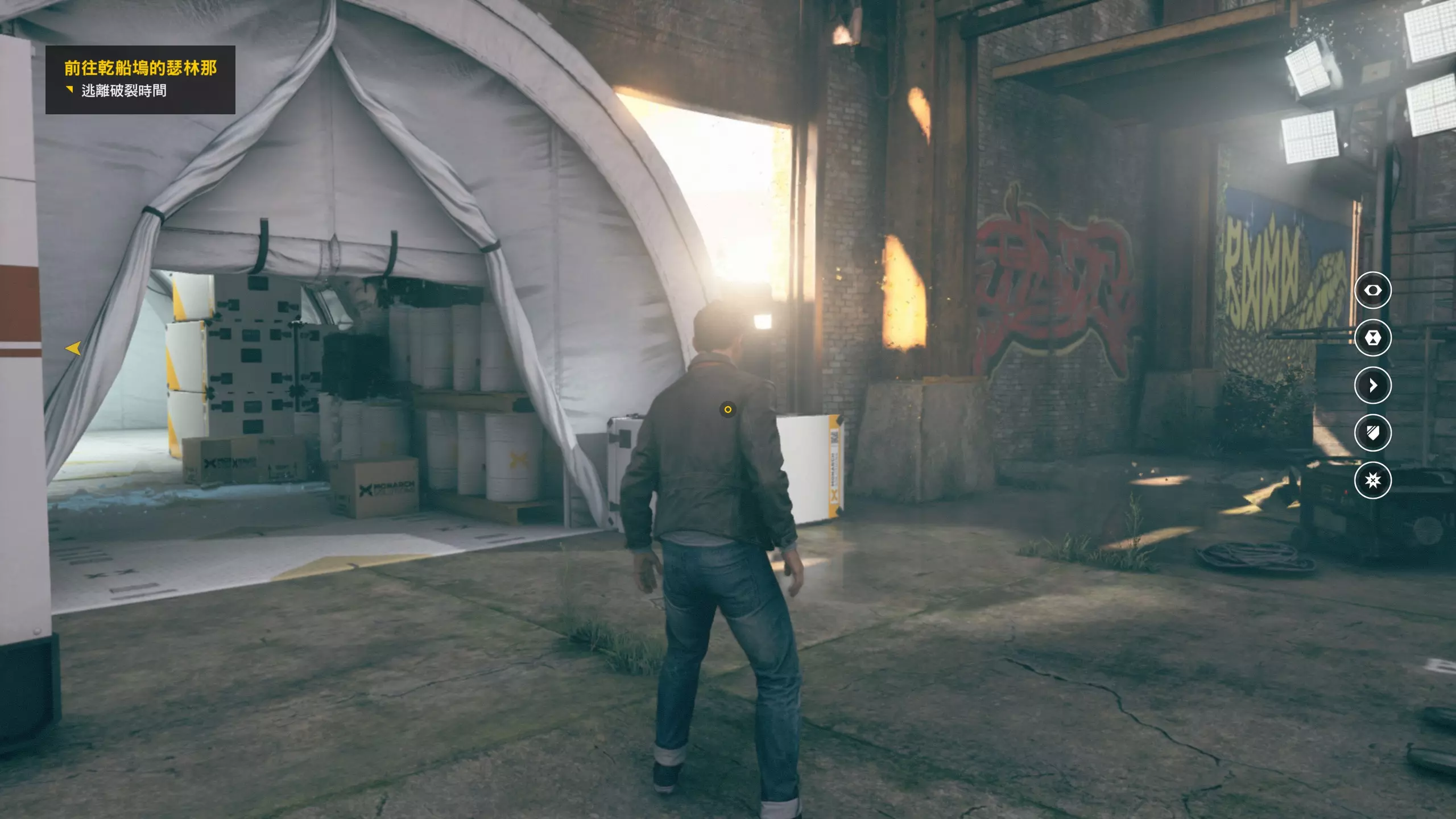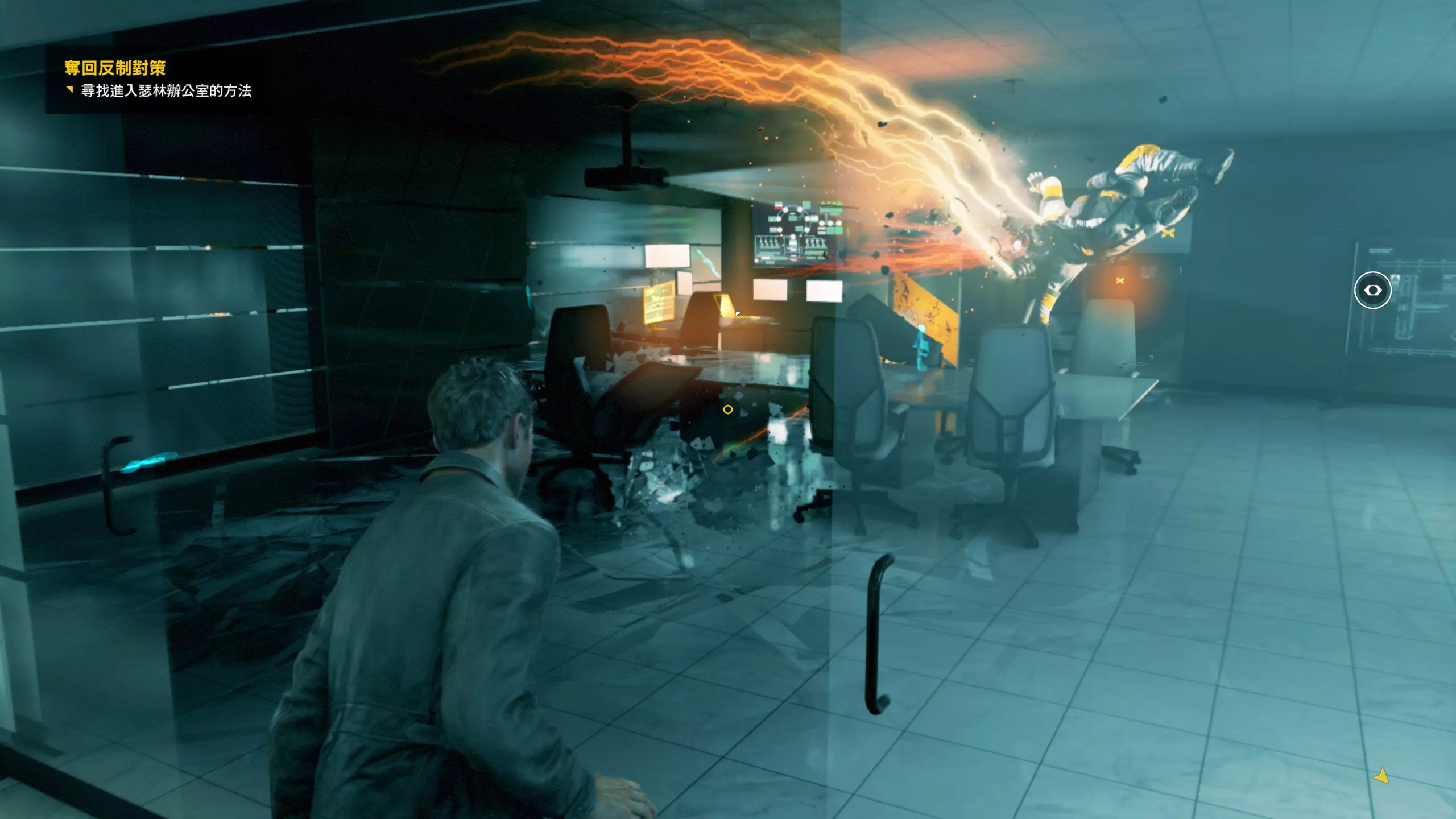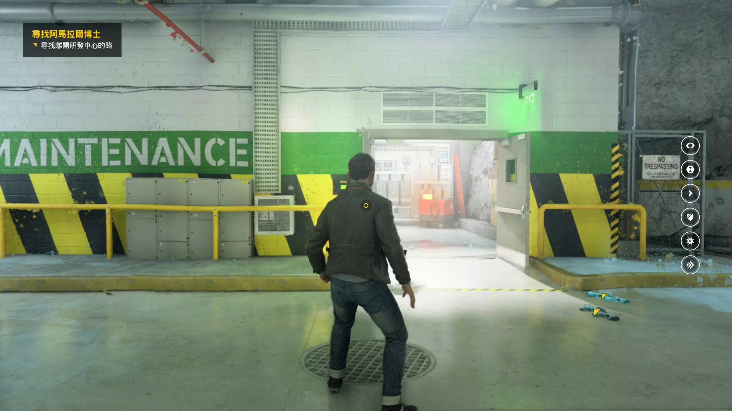 3.在解救保罗的战斗环节中会学会时空护盾。在时空护盾范围内玩家的生命会加快回复,而如果离开时空护盾范围,时空护盾会立即失效;时空护盾生成的瞬间会造成击退和时缓效果。有一个成就是累计用时空护盾格挡200发子弹,多用就能很快达成(尤其是后面还会面对机枪,对于困难模式玩家来说护盾绝对是保命技能)。 第1幕-分歧点:强硬手段/公共关系 本节一共有2个故事物品,是2个文件;还有1个量子涟漪。 1.每一幕的最后都是分歧点(除了最后一幕),分歧点作为特殊的短暂章节,其流程内也有收集品。本节的收集品都在右侧,从近到远依次是【量子涟漪1/1】、【第1/2个文件(1/2)】、【第2个文件(2/2)】。建议先确保收集完所有能收集的物品后,再去与分歧点互动。