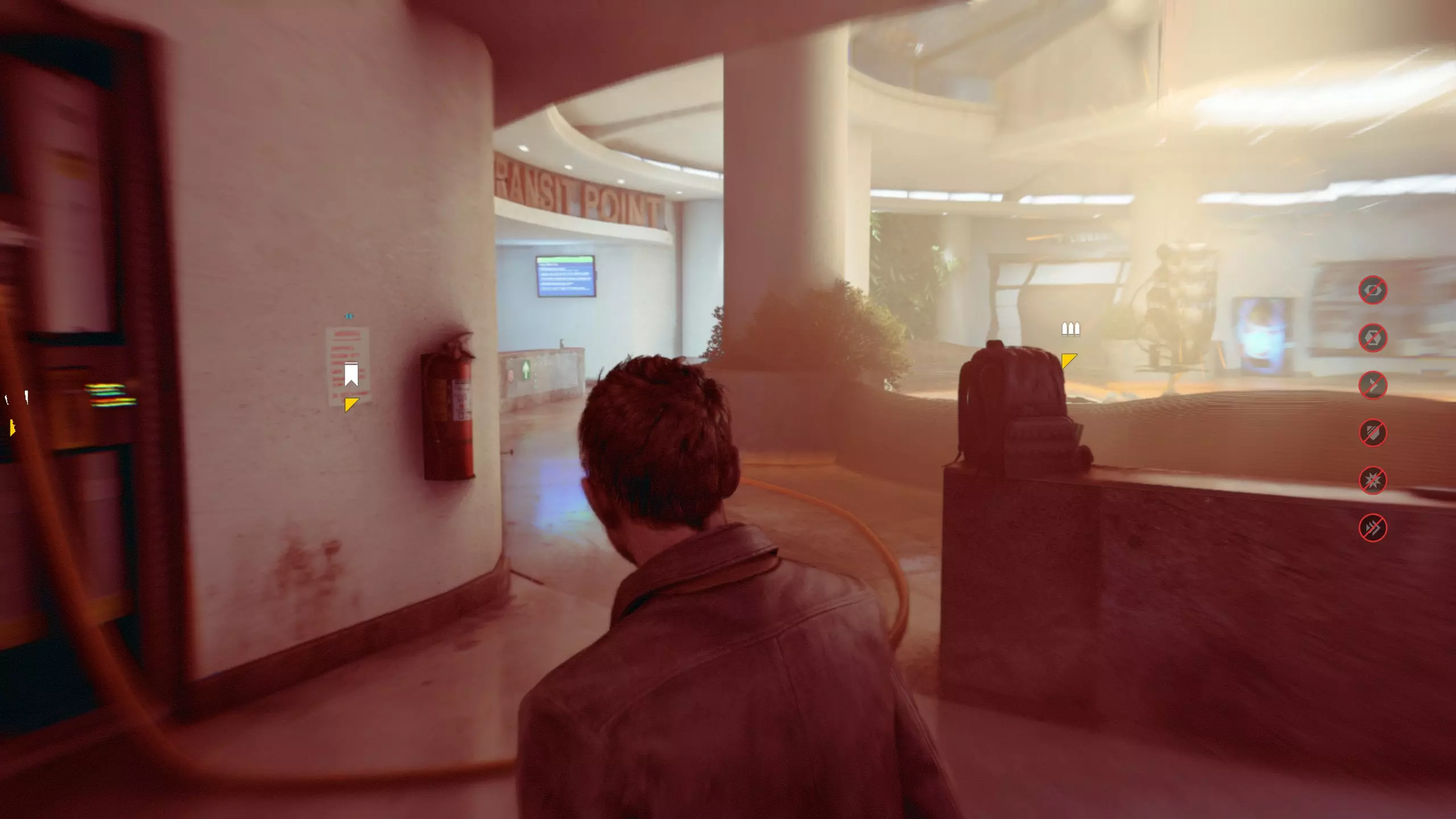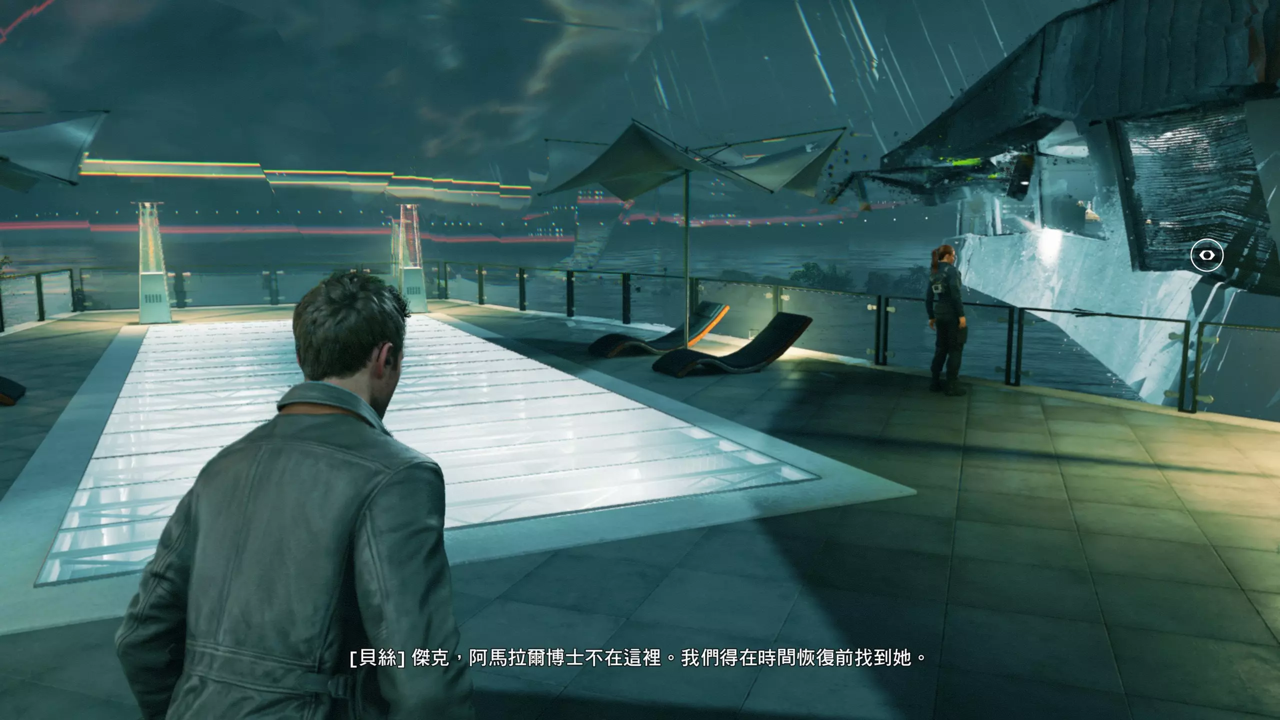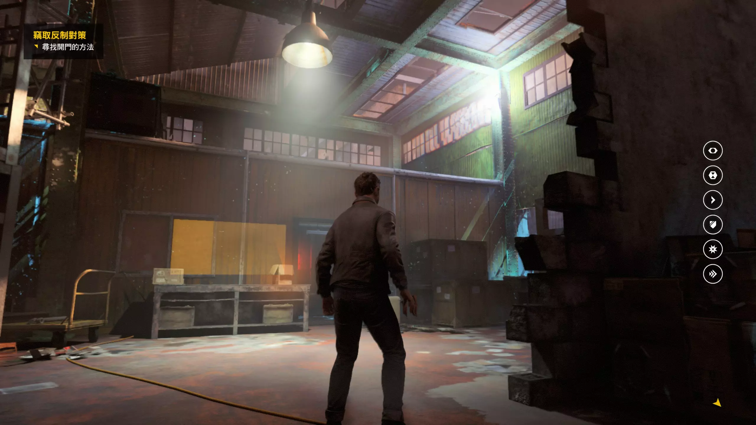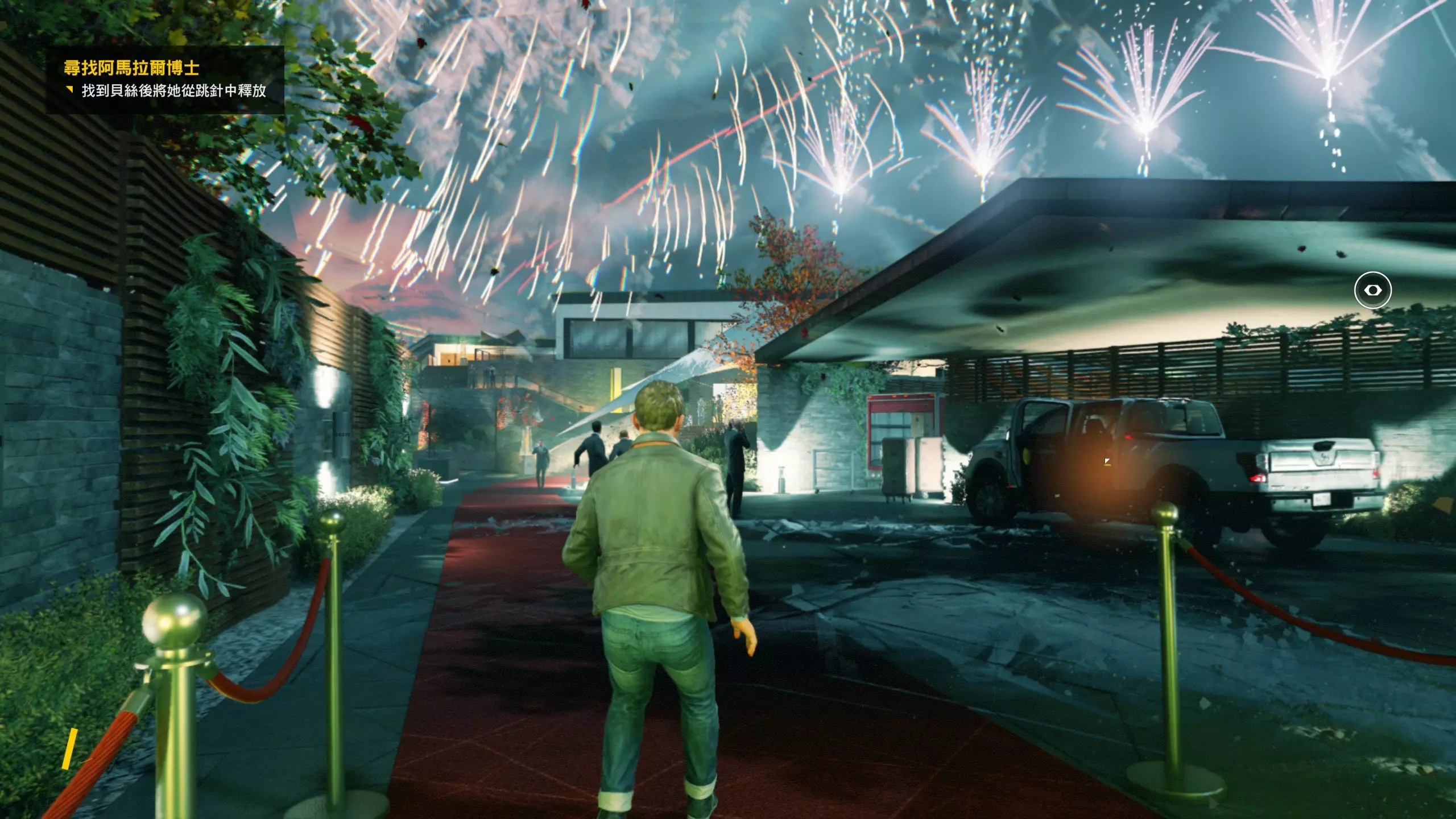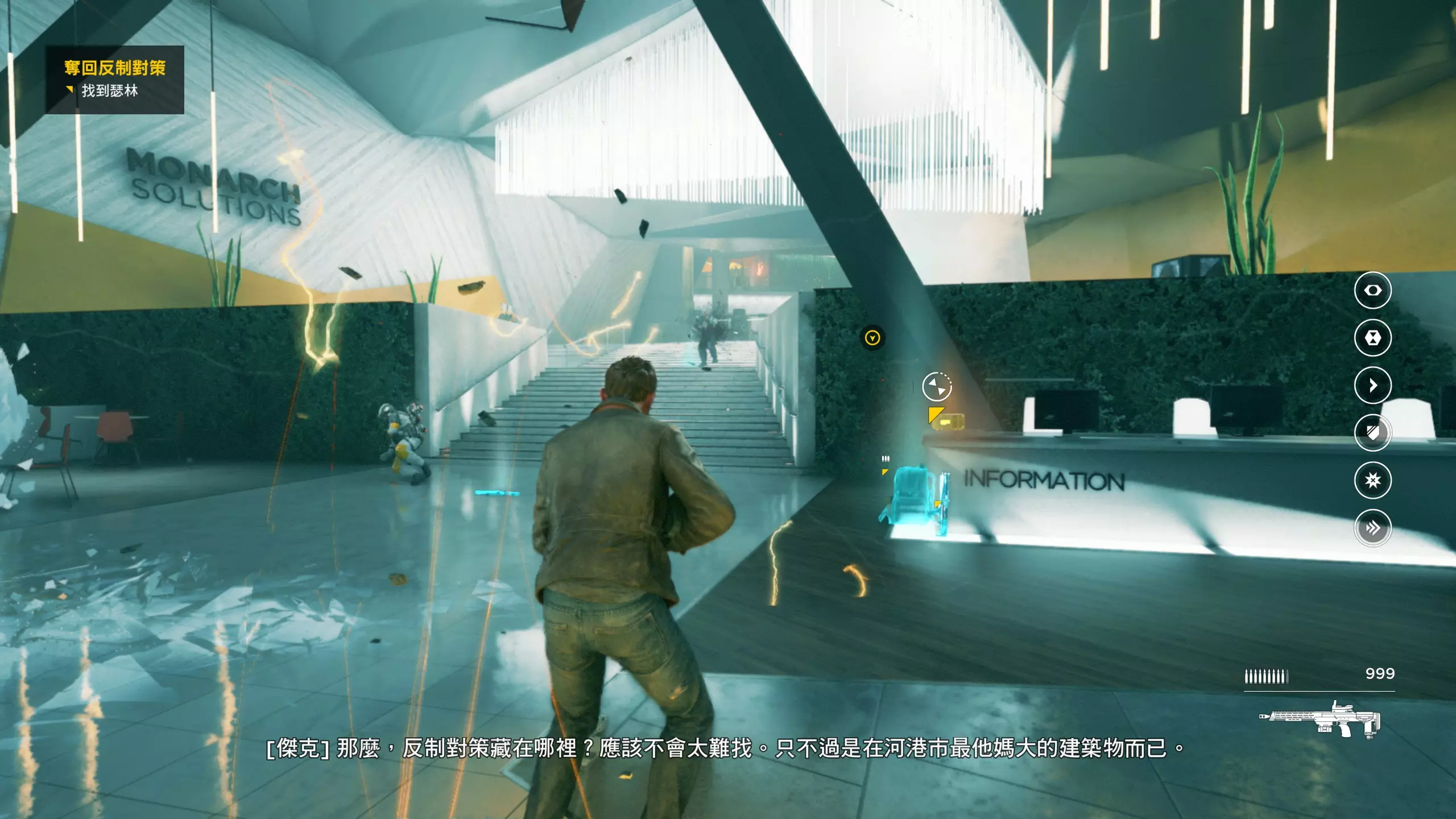 3.在解救保罗的战斗环节中会学会时空护盾。在时空护盾范围内玩家的生命会加快回复,而如果离开时空护盾范围,时空护盾会立即失效;时空护盾生成的瞬间会造成击退和时缓效果。有一个成就是累计用时空护盾格挡200发子弹,多用就能很快达成(尤其是后面还会面对机枪,对于困难模式玩家来说护盾绝对是保命技能)。 第1幕-分歧点:强硬手段/公共关系 本节一共有2个故事物品,是2个文件;还有1个量子涟漪。 1.每一幕的最后都是分歧点(除了最后一幕),分歧点作为特殊的短暂章节,其流程内也有收集品。本节的收集品都在右侧,从近到远依次是【量子涟漪1/1】、【第1/2个文件(1/2)】、【第2个文件(2/2)】。建议先确保收集完所有能收集的物品后,再去与分歧点互动。