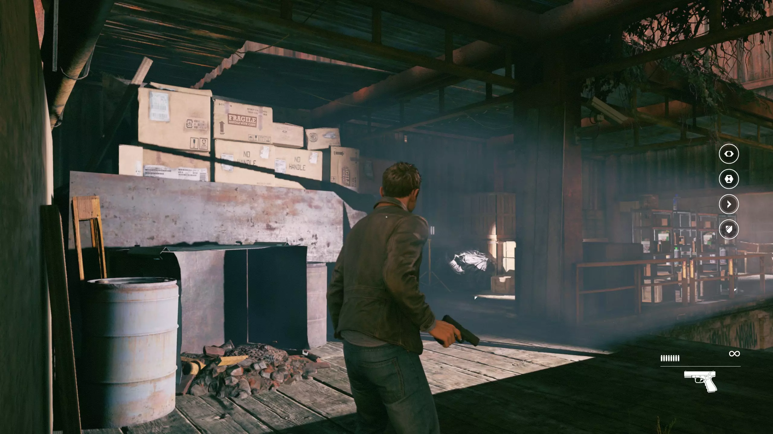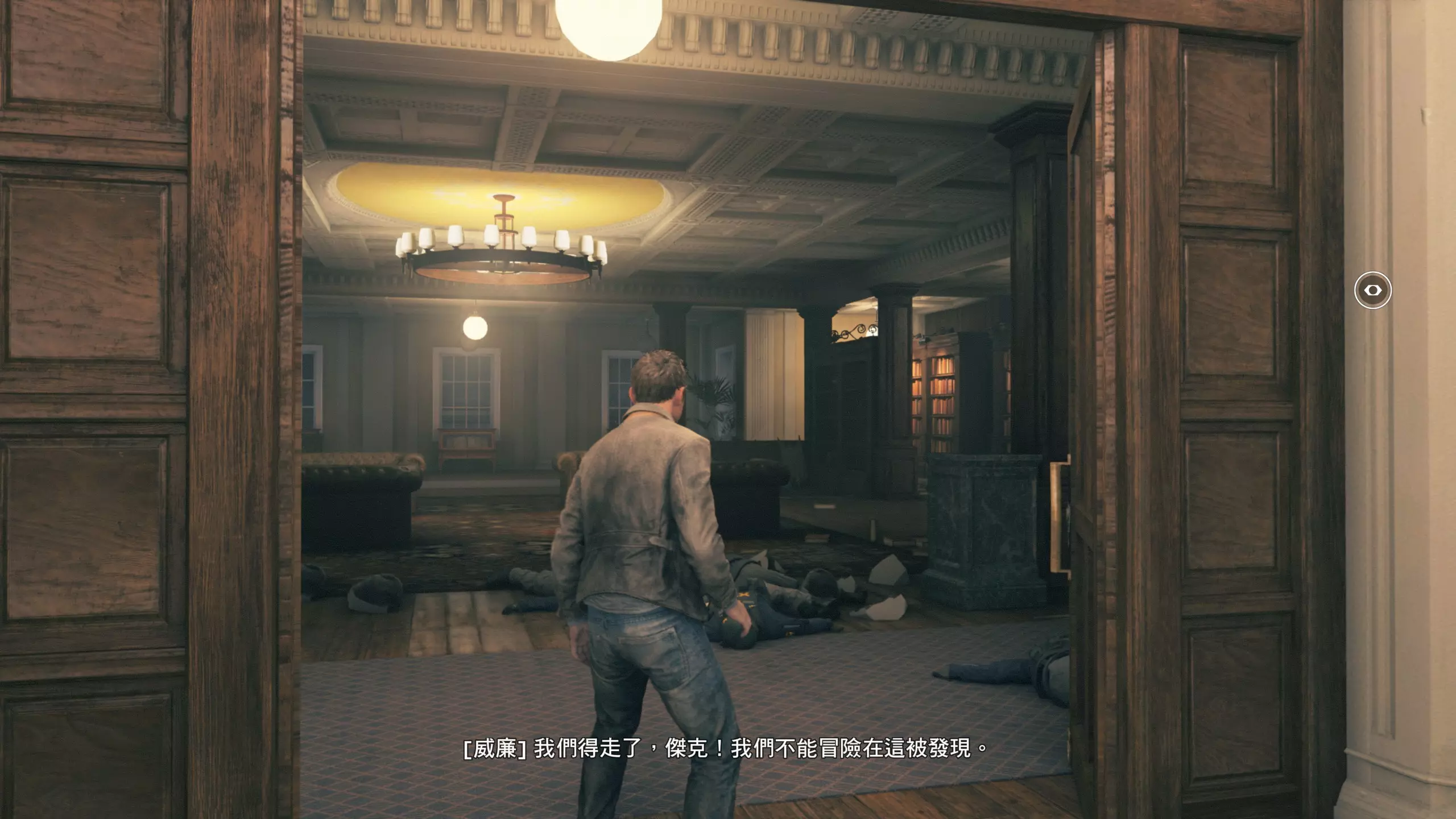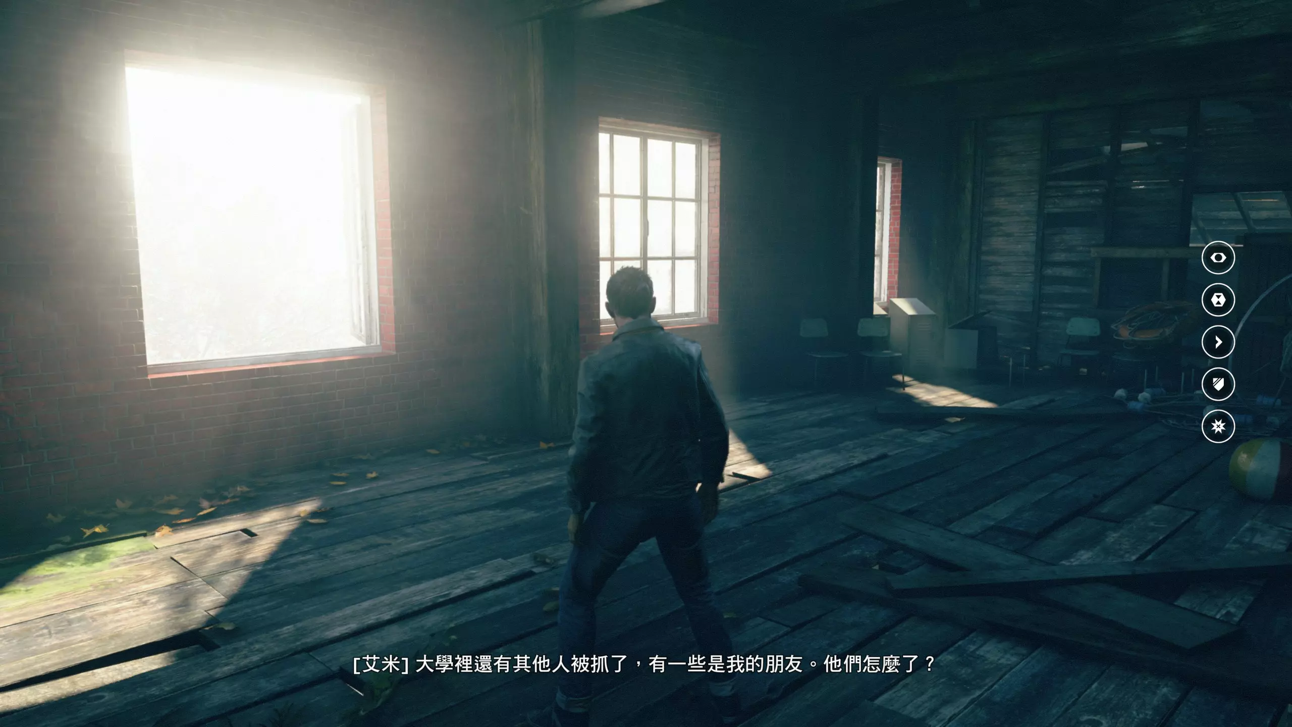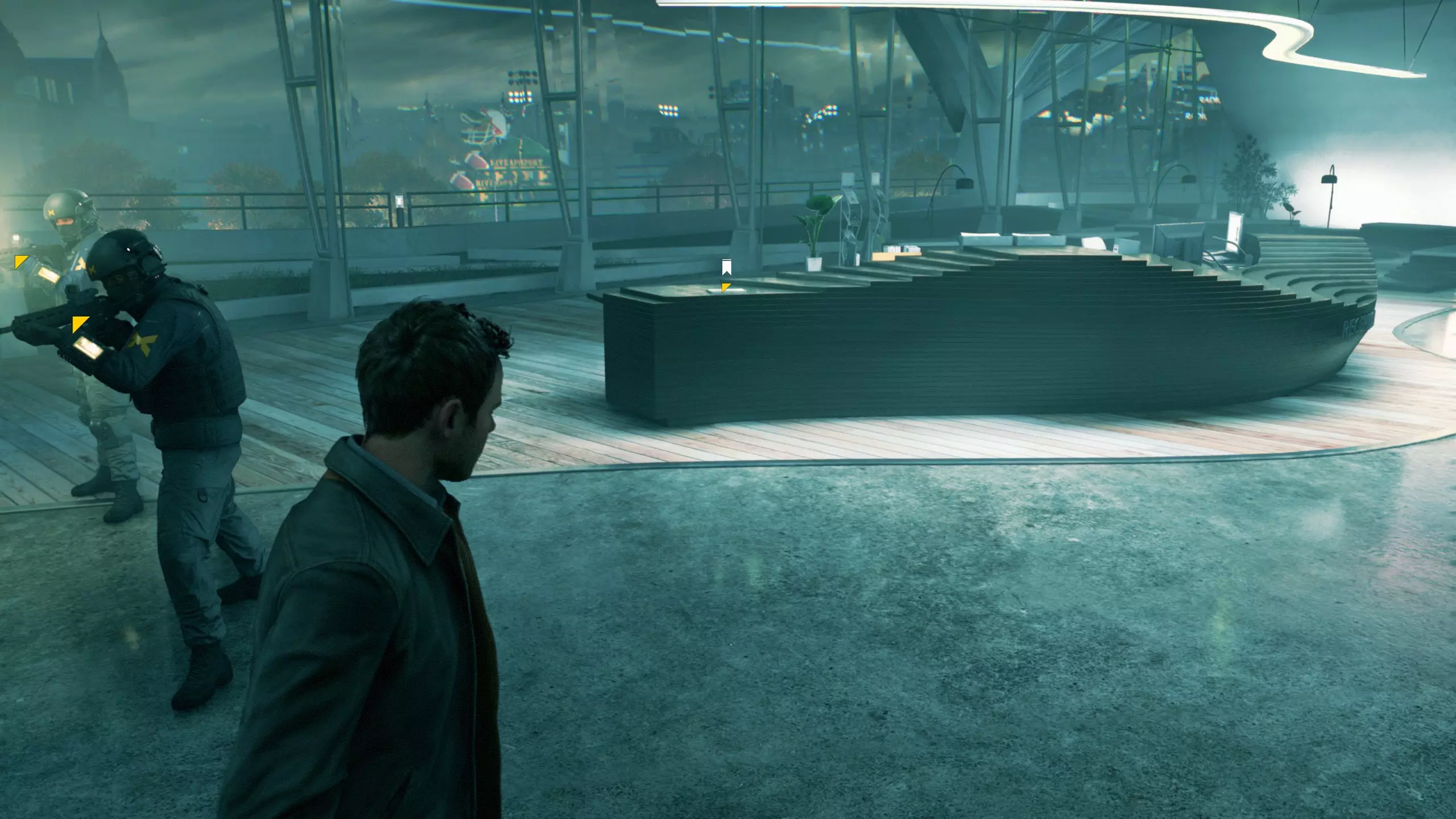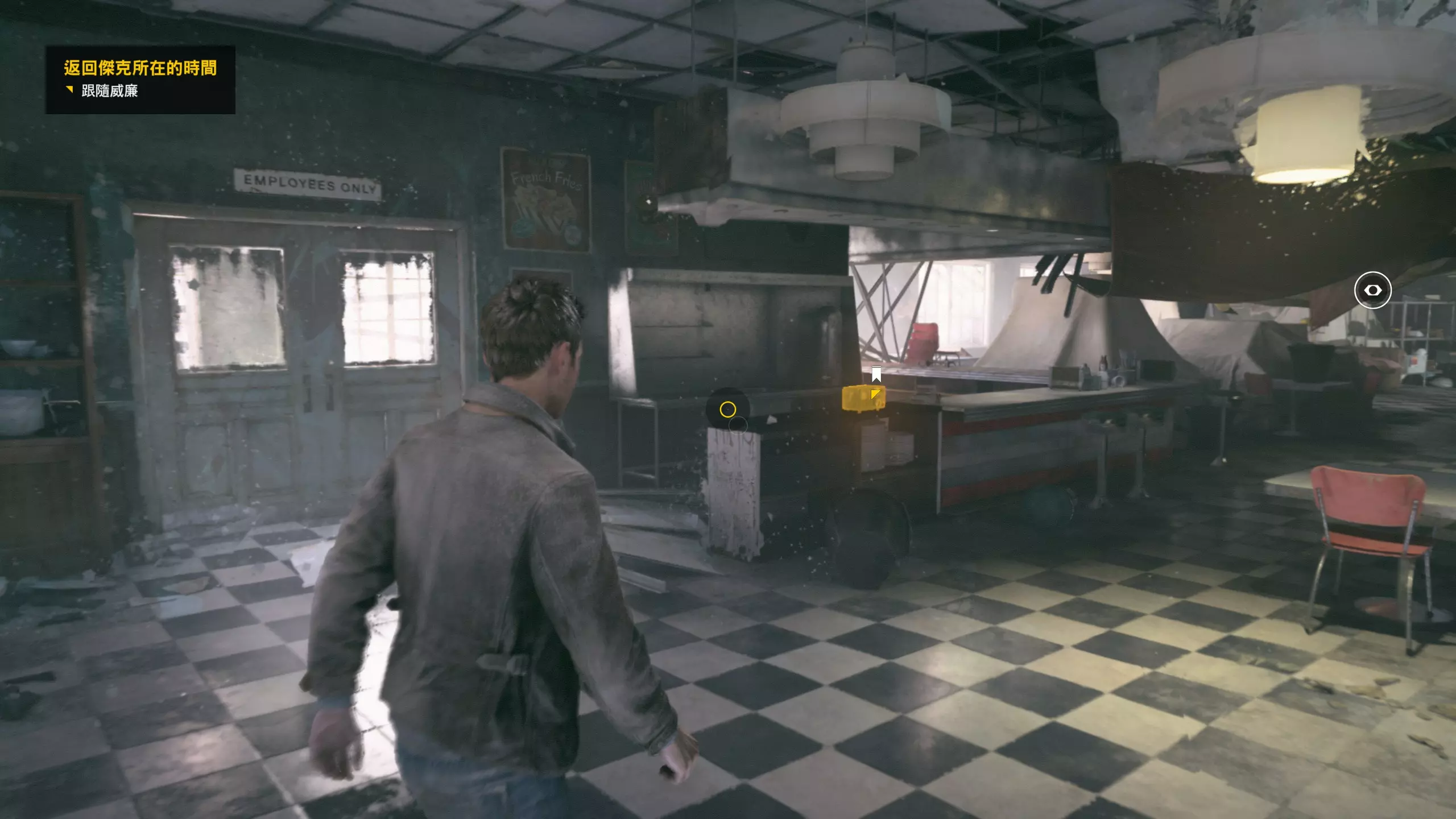 3.在解救保罗的战斗环节中会学会时空护盾。在时空护盾范围内玩家的生命会加快回复,而如果离开时空护盾范围,时空护盾会立即失效;时空护盾生成的瞬间会造成击退和时缓效果。有一个成就是累计用时空护盾格挡200发子弹,多用就能很快达成(尤其是后面还会面对机枪,对于困难模式玩家来说护盾绝对是保命技能)。 第1幕-分歧点:强硬手段/公共关系 本节一共有2个故事物品,是2个文件;还有1个量子涟漪。 1.每一幕的最后都是分歧点(除了最后一幕),分歧点作为特殊的短暂章节,其流程内也有收集品。本节的收集品都在右侧,从近到远依次是【量子涟漪1/1】、【第1/2个文件(1/2)】、【第2个文件(2/2)】。建议先确保收集完所有能收集的物品后,再去与分歧点互动。