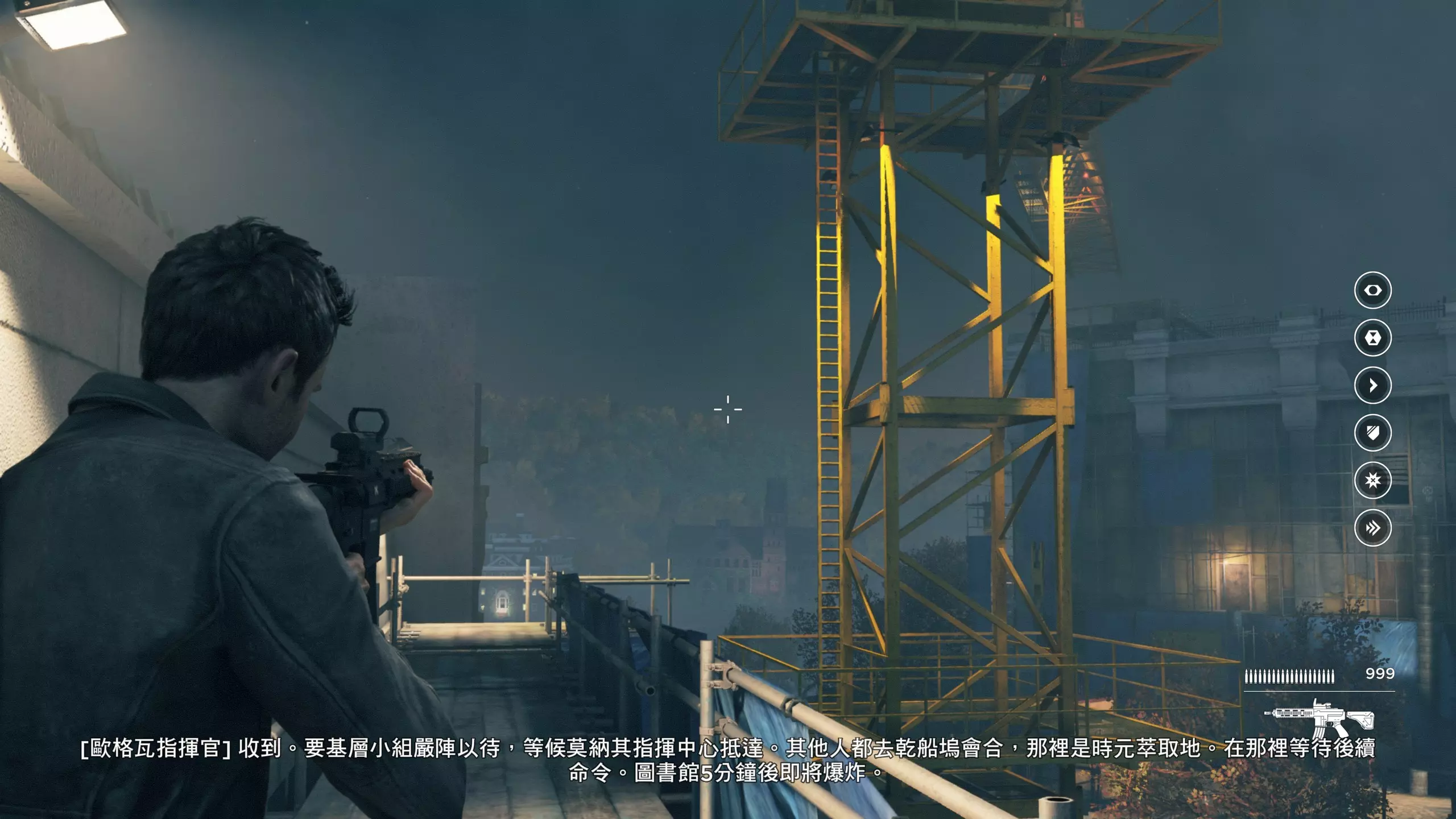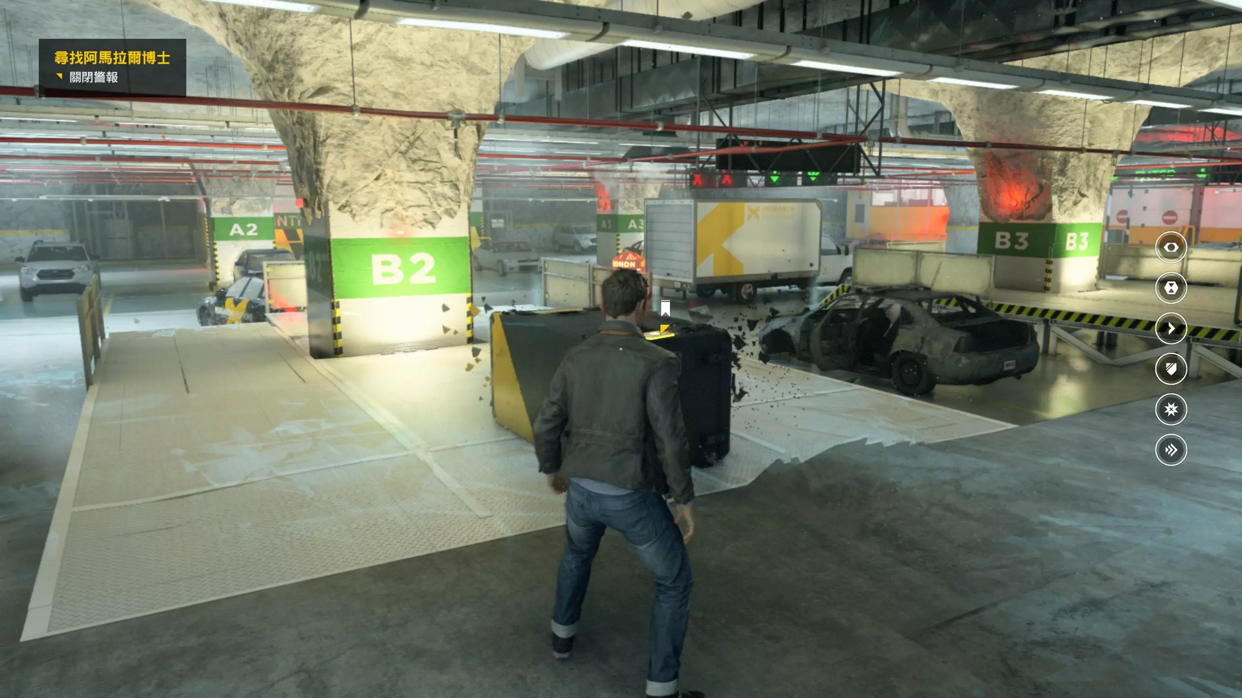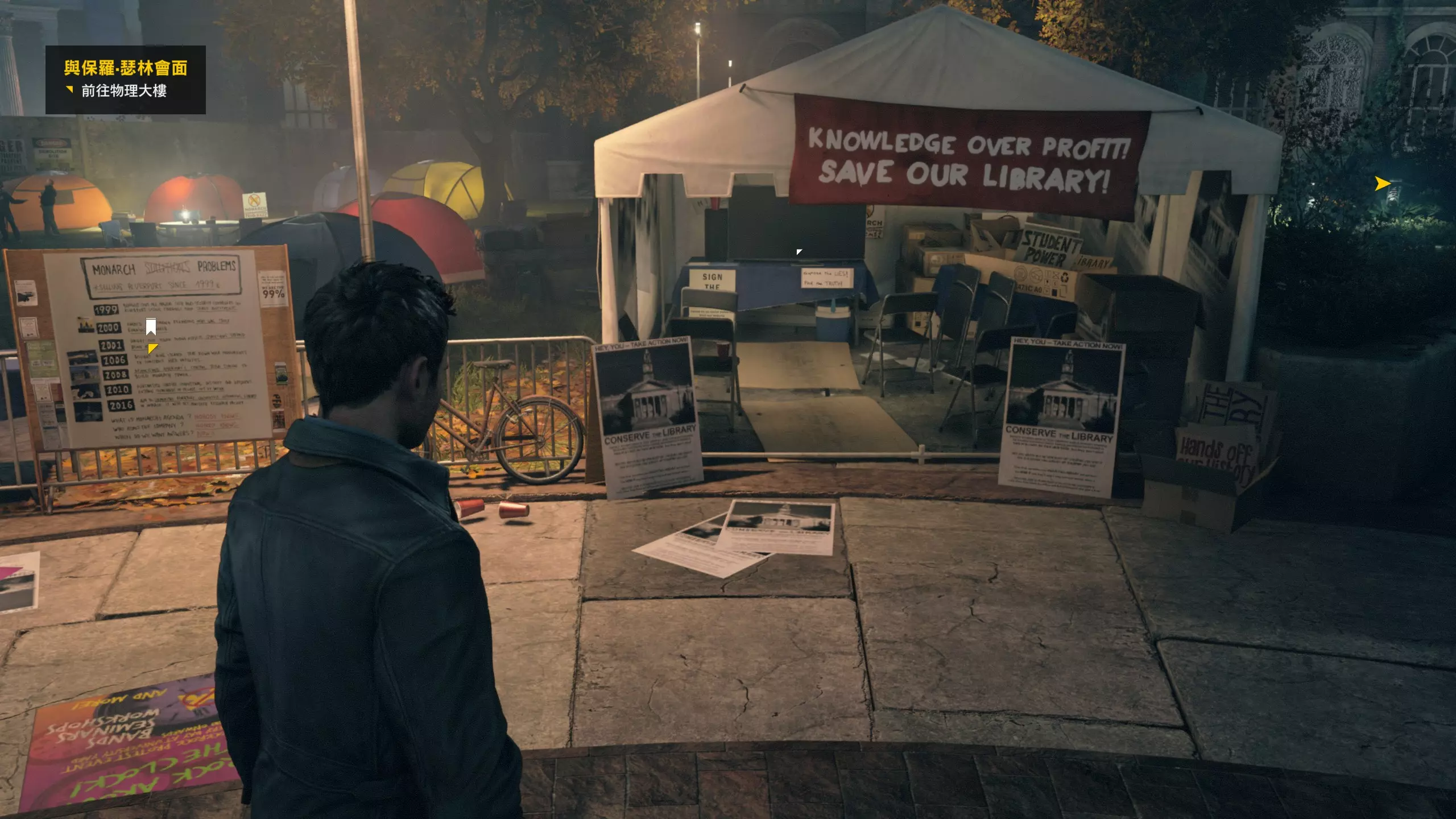5.最后一路跟随流程穿过大讲堂来到停车场,学会【时空视野】技能并触发战斗环节。 【时空视野】可以使附近一定范围内的弹药包/枪械(蓝色)、未获得的收集品(金色)、未被杀死的敌人(红色)、易爆炸/可破坏物品(橙色)以高亮显示,无论是否在肉眼视野内。 第1幕-第3章:图书馆追逐战 本节一共有1个故事物品,是1个媒体。 1.先是跟随流程度过几场战斗环节,期间学习【时空停止】、【时空闪避】两个技能。 在【时空停止】的技能效果持续期间,可以朝停止区域发射子弹,这些子弹也会被悬停在其上,进而可以在技能效果结束时,对被该技能困住的敌人打出可观的伤害。有一个成就是累计朝时空静止区域中发射1000发子弹,用冲锋枪或者步枪可以更快解锁此成就;还有一个成就是累计使用时空静止达到【1小时】的时长(成就描述是这样,但指的并不是现实时长而是“时空停止”代换出来的时长,亲测多用点时空静止没过多少章节就能达成)。 时空闪避期间无敌,闪避结束时按下瞄准可以触发焦点时间,可以理解为短暂的时缓效果;朝敌人使用时空闪避可以造成短暂的击晕效果。有一个成就是累计在焦点时间内打出10次爆头。 2.离开大讲堂来到室外,在左侧翻过铁丝网后,就来到下图场地,可以拿到第1/1个媒体(1/1)。随后爬到高处,对升降车使用时空停止技能以抵达对面,然后翻窗进入图书馆。