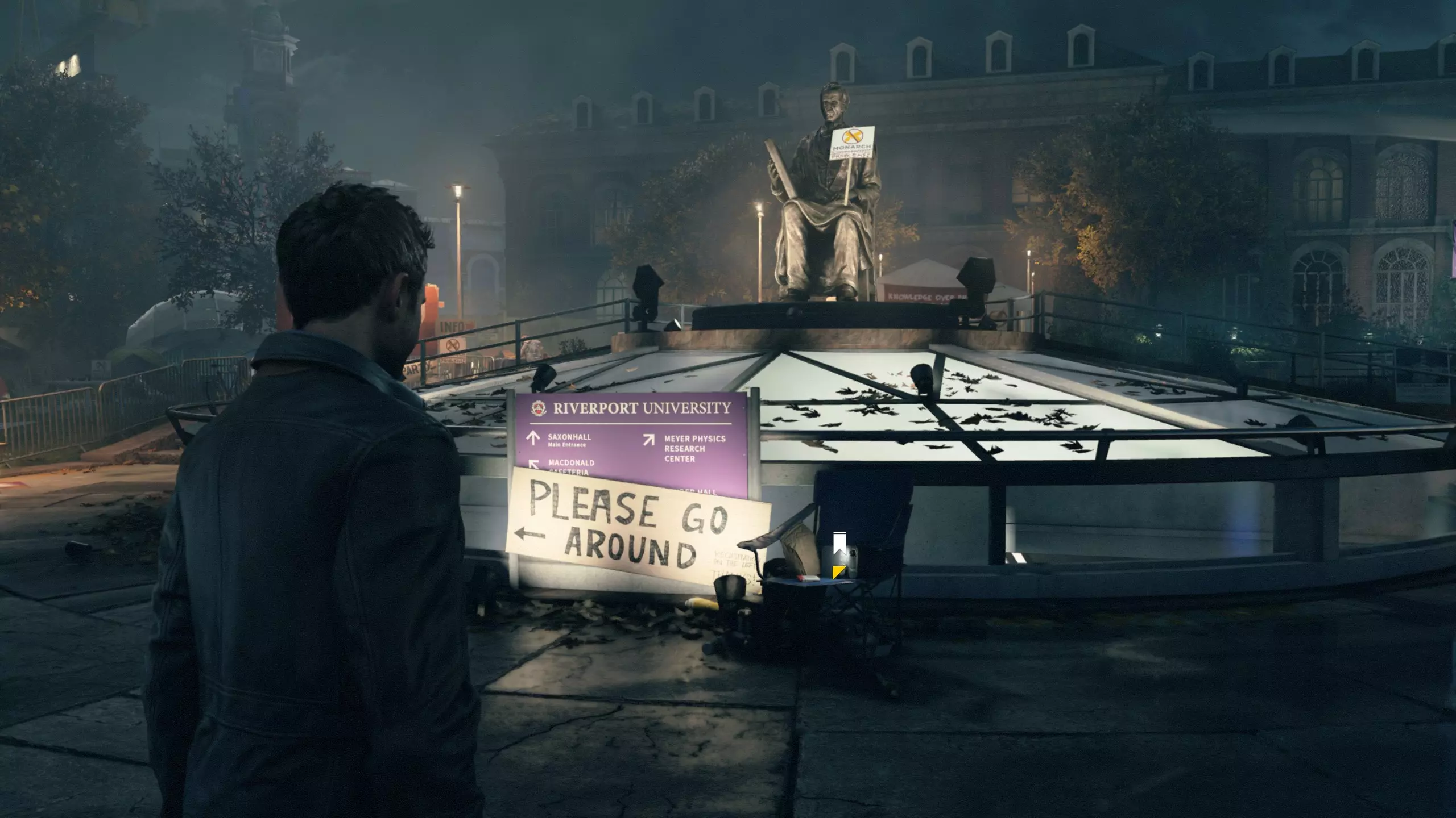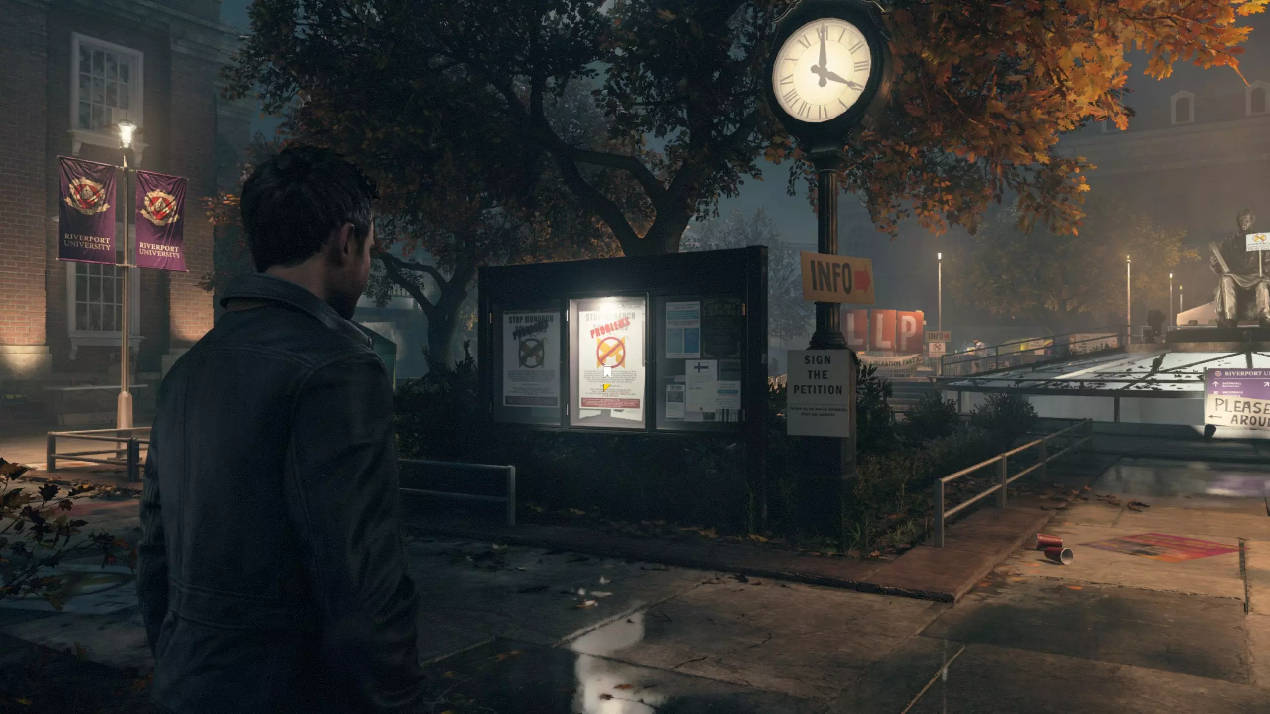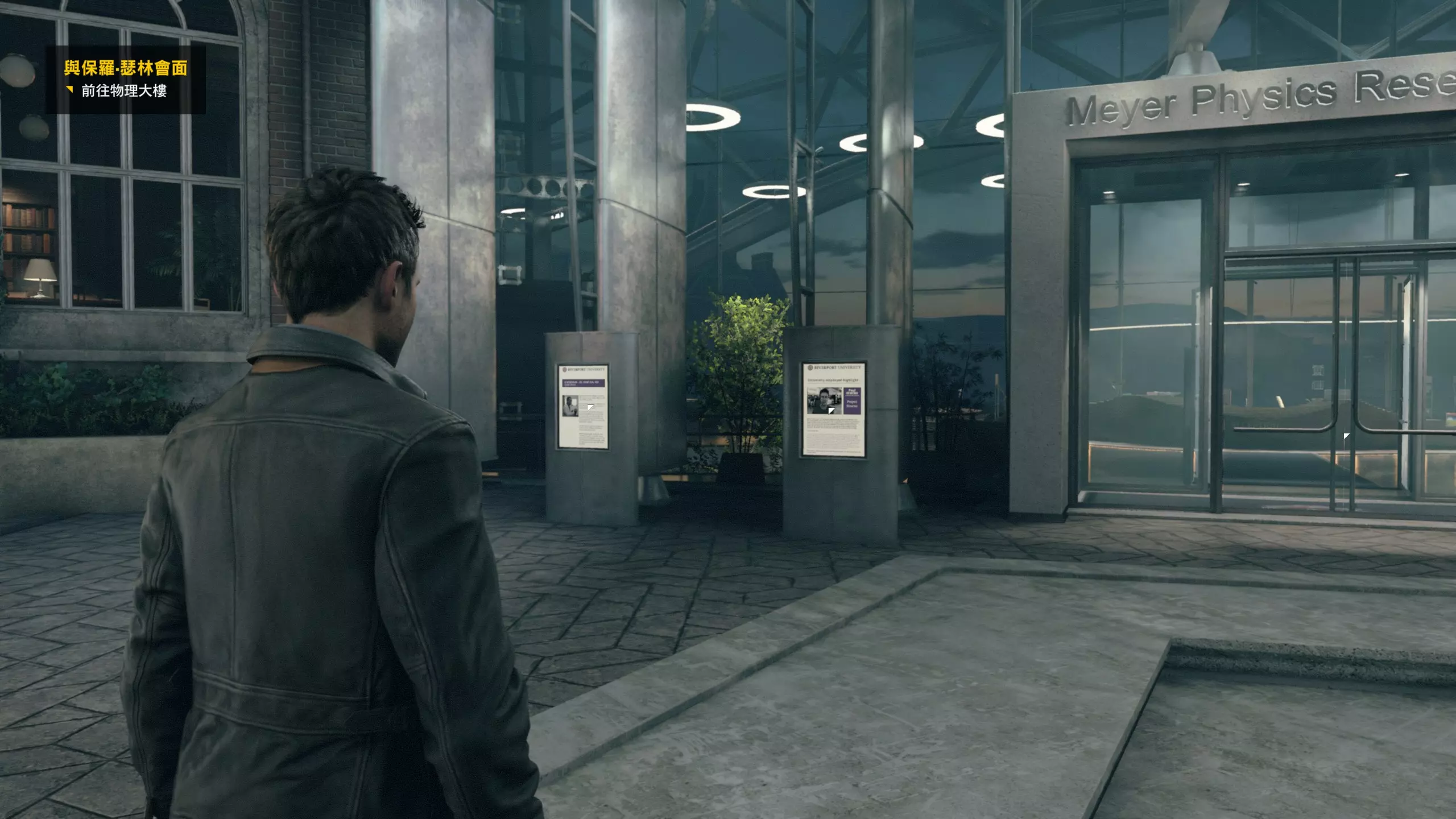 1.本指南涵盖了全流程、全收集、全成就的要点,不涉及剧透,读者大可放心按本指南照做。 2. 3.如发现指南内有描述不清楚或者错漏项请在留言区指出。 写在前面 1.想要全成就的玩家,请务必全程使用困难模式完成所有的流程。可以放心的是,游戏的困难模式并不是很难(不能无双割草罢了)! 2.初次游玩时,不建议跳过过场演出,因为这么做可能会错过一些本该必得的流程成就。除了流程成就以外,随着全收集就自然能拿到的成就本指南也不再特别写出了。 3.初次启动游戏时,游戏分辨率或许比较低,且最高只能调到1600:900,解决办法是:先选择无边框窗口模式下的1600:900分辨率,然后切换至全屏模式再切换回无边框窗口模式,会发现游戏窗口没办法再占据整个屏幕了,此时重启游戏就可以调整更高的分辨率了。 4.游戏拥有一些战斗类的累计型成就,本指南也会提及它们的解锁条件,并且这类成就是可以用存档读档大法去刷累计次数的。 5.全流程长度大概8-10小时。游戏中可以随时按下T暂停以检查当前章节的收集进度。 6.游戏内每一章节都可以随时切换难度重玩!但需要注意的是,游戏内重新载入任何章节(包括你只是想重玩你当前正在玩的章节这种情形)后,玩家的武器都会被清空,重置为只有手枪的状态。 游戏中的收集要素分为:文件、电脑、媒体、时元之源、情报物品和量子涟漪。需要留意的是,游戏内每收集一个物件而跳出的收集进度提示,显示的是“文件+电脑+媒体”的总收集进度(三个合称“故事物品”),而收集进度页面中会把每种收集品的进度拆开显示。游戏的各个章节都可以随时重玩,收集品只要收集到就会立即保存收集进度,即便当场读档或退出也不受影响(若不放心,可在游戏中按T键查看收集进度页面)。 不过,以下情况会导致收集进度丢失: 每一幕的最后都设有一个名为【分歧点】的特殊章节,玩家需在其中完成剧情走向的分歧选择。这些选择虽对后续游戏流程影响不大,但会改变部分章节内收集品的内容或数量(点位基本保持不变)。因此需要注意,若回头重玩之前的【分歧点】章节并做出不同选择,可能需要重新获取部分收集品。 总之,按照本指南操作,一定不会遗漏收集品!为了确保能准确按照本指南操作,每个分歧点建议与本指南选择保持一致! 第1幕-第1章:河港大学实验室 本节共有16个故事物品,包括10个文件、3个电脑和3个媒体。 1. 看完开场动画后,来到指定位置,左侧的告示牌就是第1/10个文件(1/16)。