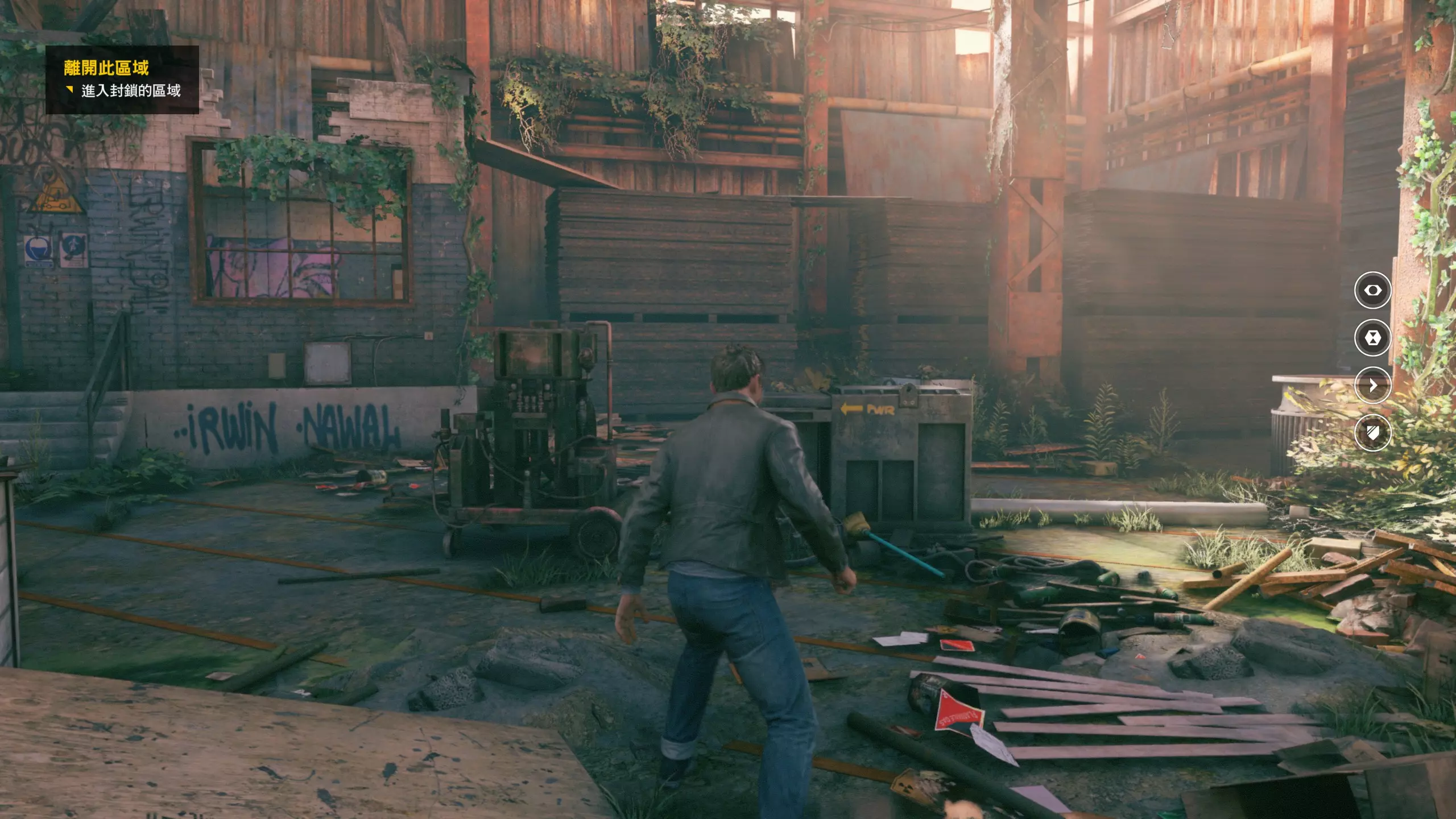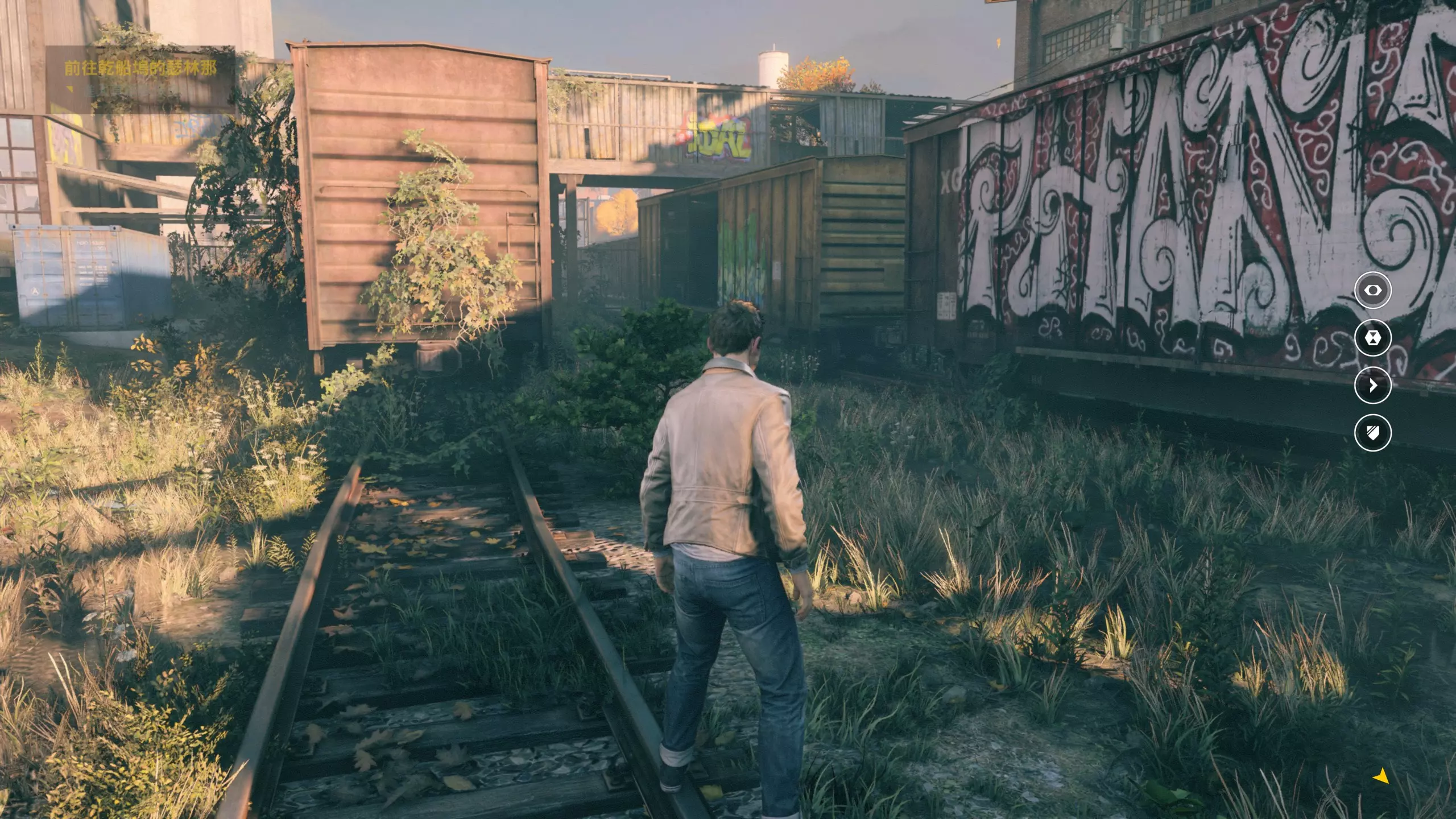 6.离开遇到艾米的房间。然后穿过铁丝网大门(大门开关所在的房间隔墙有一个【时元之源】,之后才能收集),来到下图位置后,朝着视角方向前进,在左侧爬上列车顶部。