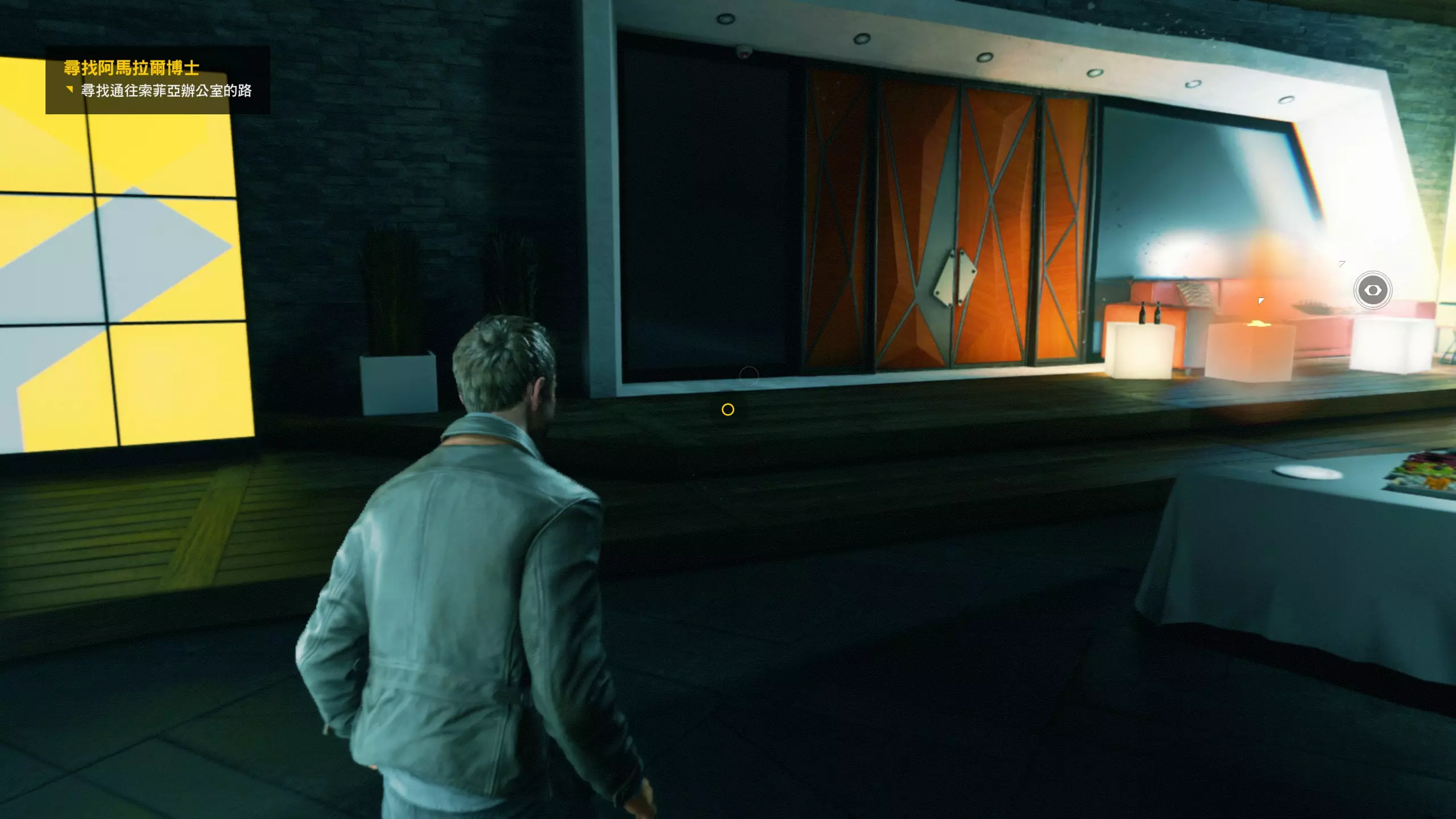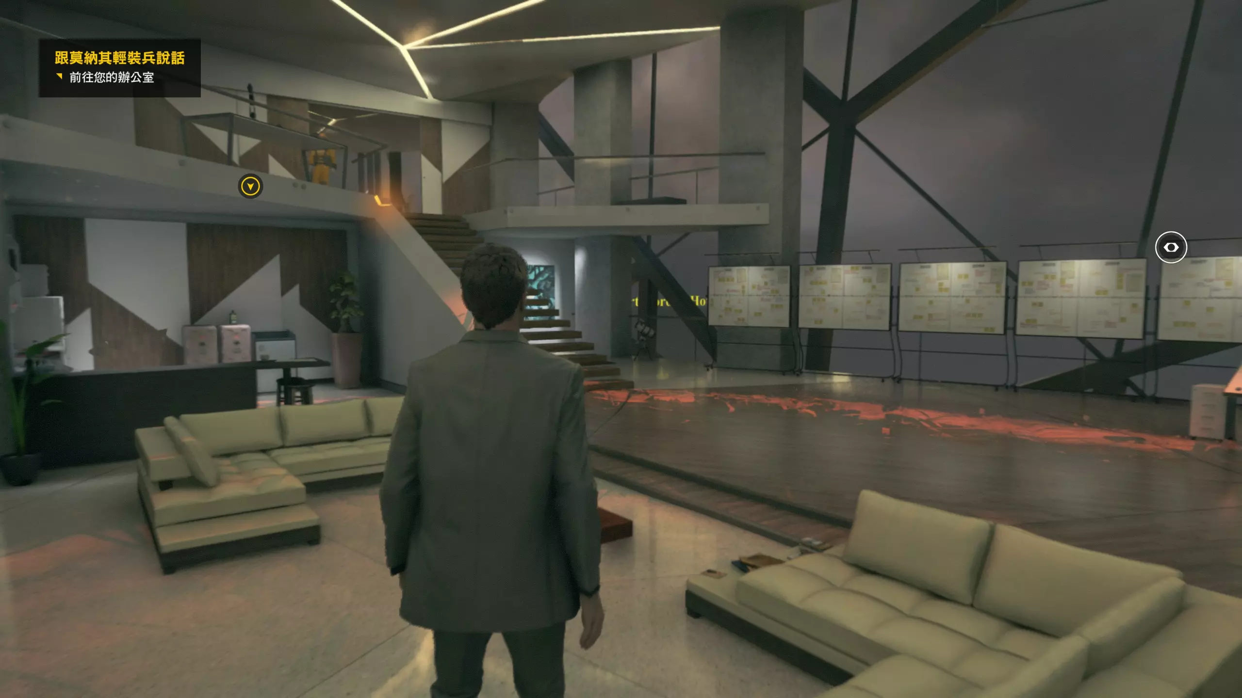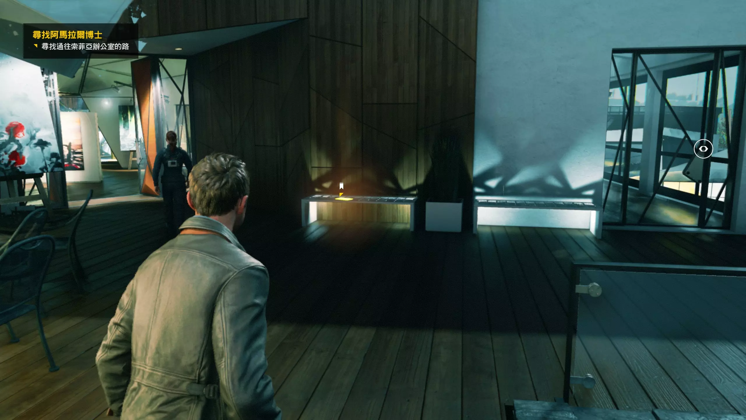 第3幕-第2章:莫纳其晚会 本节一共有7个故事物品,分别是3个文件、2个电脑、2个媒体;还有8个时元之源、1个情报物品、1个量子涟漪。 1. 小节一开始就在下图位置,一层两个会议室内都有可收集物,左边的会议室内是第1/3个文件(1/7)和第1/2个电脑(2/7),右边的会议室内是第2/3个文件(3/7)。