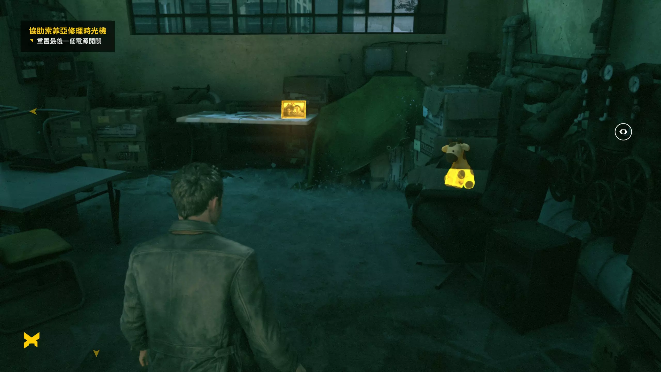 4.推进流程,需要操作两处开关。操作完第一处开关后,时光机房间右侧远处的区域即可进入,进入后能看到第9/10个文件(11/12)。此外,该区域还有一个玩偶,在时空视野下会散发出与未收集物品相同的金光,但不会计入收集进度,不过可以互动(可能是其他分歧点选择的专属收集品)。