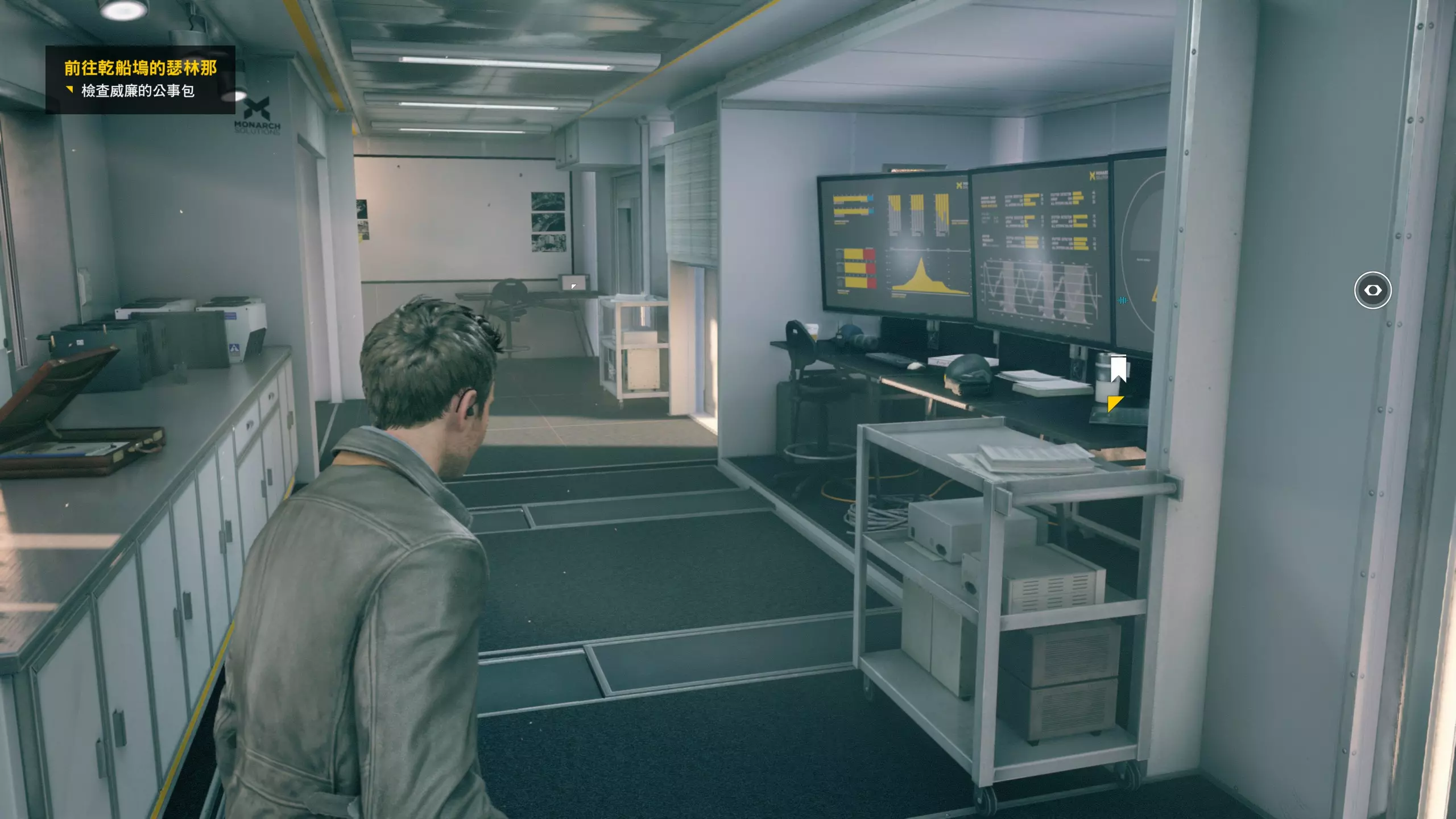 2.本章节的分歧点选择,本指南选择了控制病情即左侧选择,因为作者更喜欢这个走向。 第5幕-第1章:莫纳其总部 本节一共有18个故事物品,分别是5个文件、11个电脑、2个媒体;还有3个时元之源、4个情报物品。 1.本节一开始会触发战斗环节,战斗环节结束后,桌上有第1/2个媒体(1/18)。