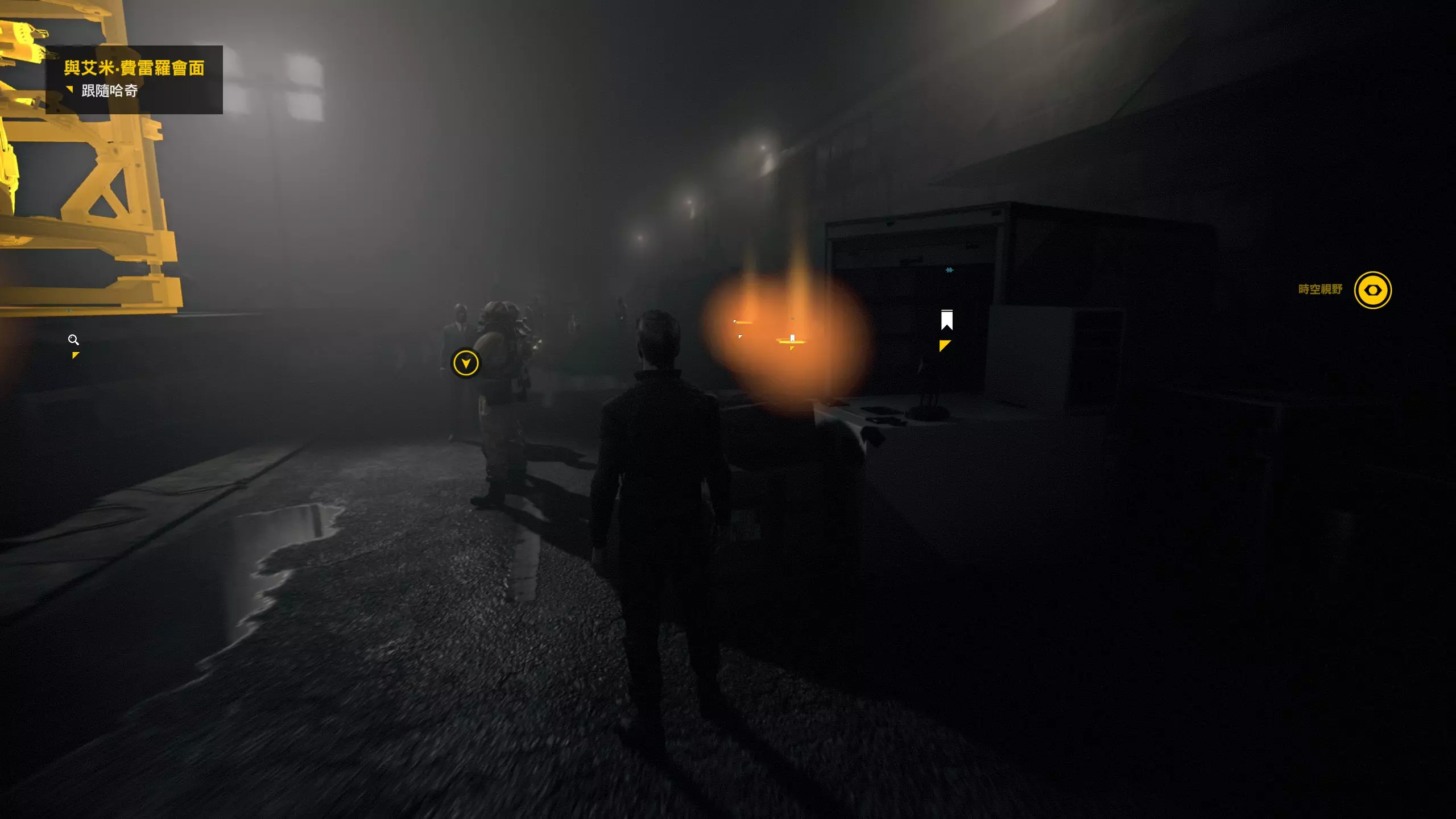 11.接着是一个战斗环节,初次遇到穿着重甲手持机枪的敌人,这种敌人只能通过多次绕后攻击其身后装置的弱点(可以看到一个黄色圆形的目标,就是其弱点)以击杀,所以对于玩家熟练使用各种时空技能是一场小考验。战斗结束后,借助时空倒流借助吊台抵达高处,一路跑酷继续前进,抵达下图场景。 这个地方有上下二层,有非常非常多的收集品,建议配合时空视野技能多检查四周,确保全部收集。上面一层有情报物品1/2,还有8个故事物品(3文件和5电脑)、可以让你收集进度到第7/7个文件和第6/8个电脑(15/17)。
