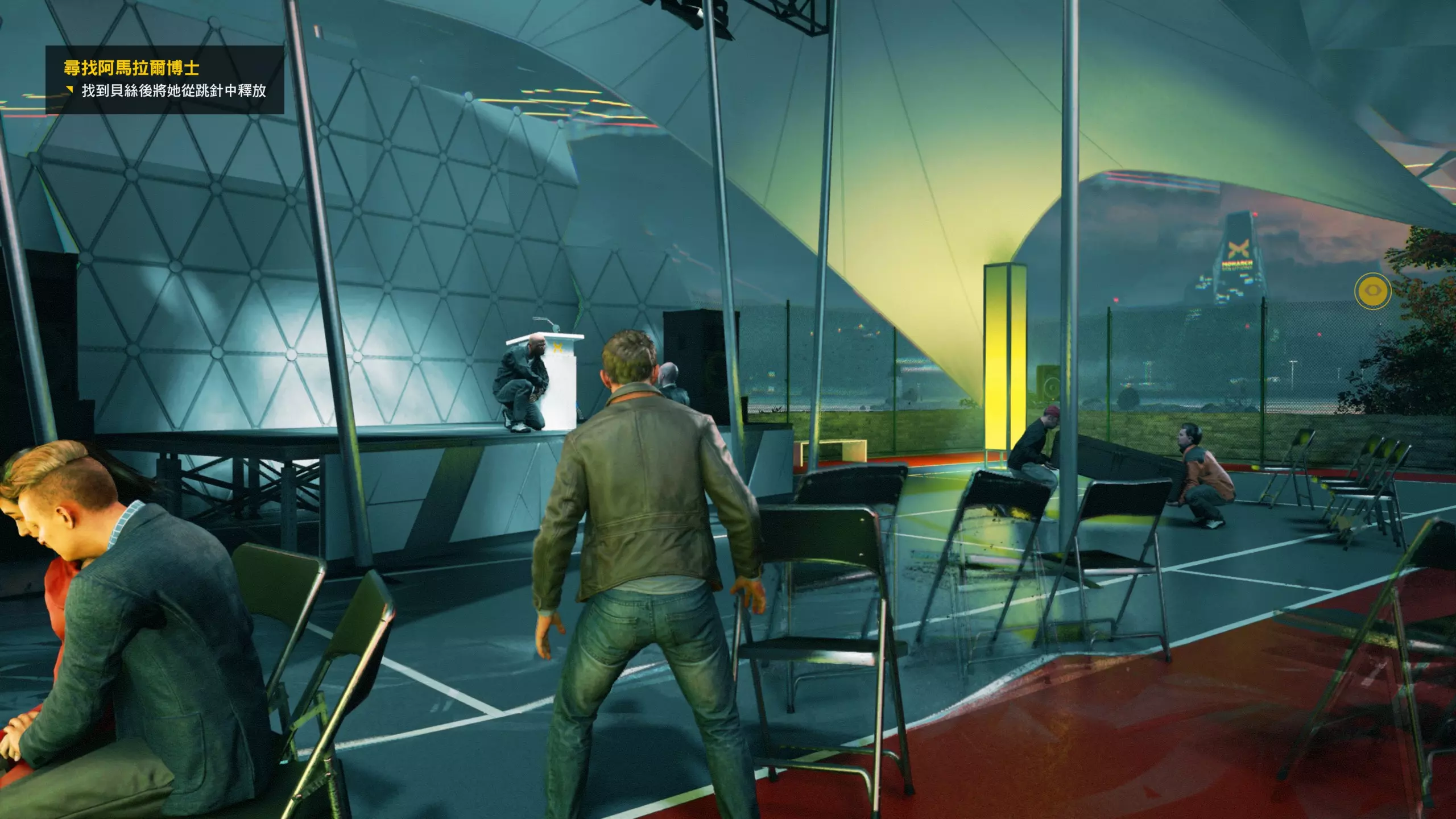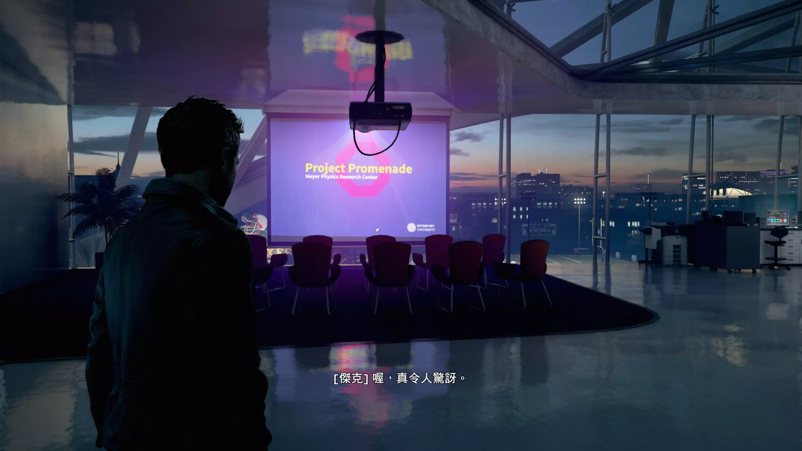 10.上电梯到设施二层,映入眼帘的是发着紫光的大屏幕,坐在最前排中间的座椅上听保罗的简报即可收集到第3/3个媒体(12/16)。