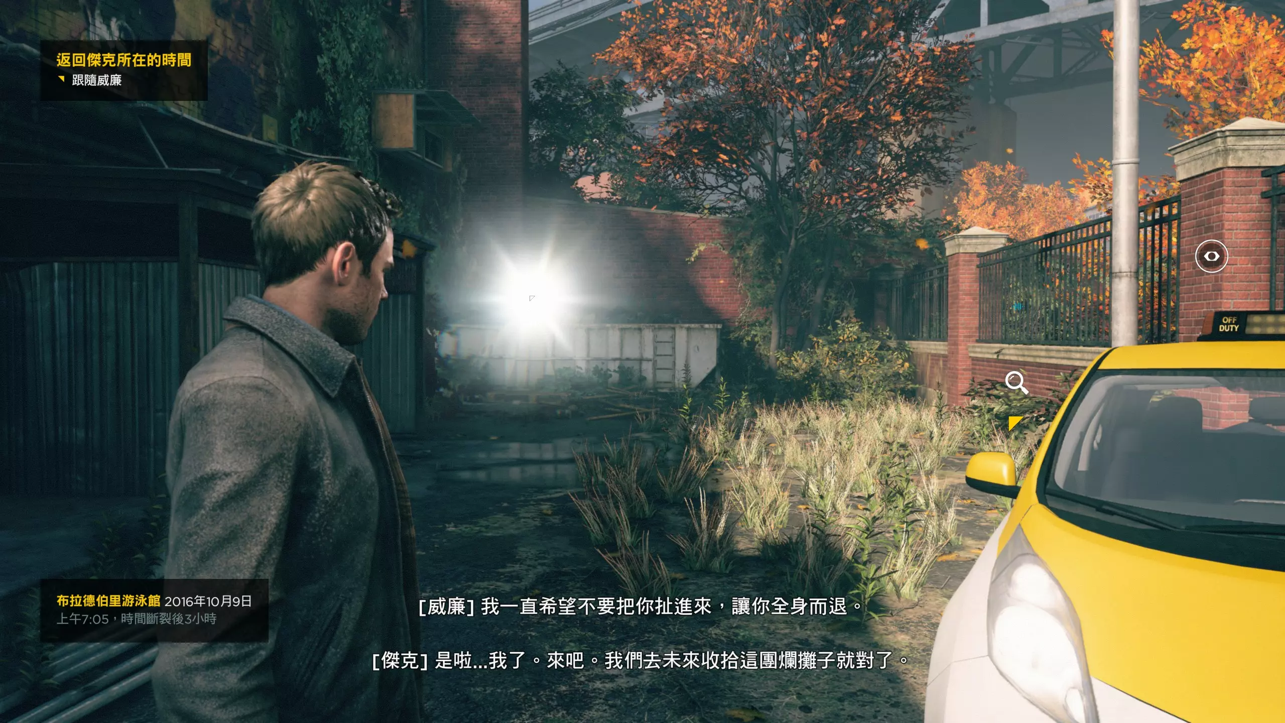 3.继续前进,跳到地面(无法回头),左侧车前盖上有第1/2个文件(3/13),与车内驾驶座互动可收集第2/2个媒体(4/13),右侧有第3/7个时元之源。