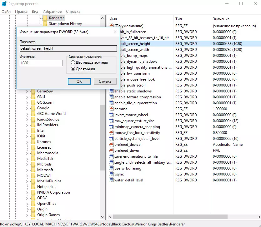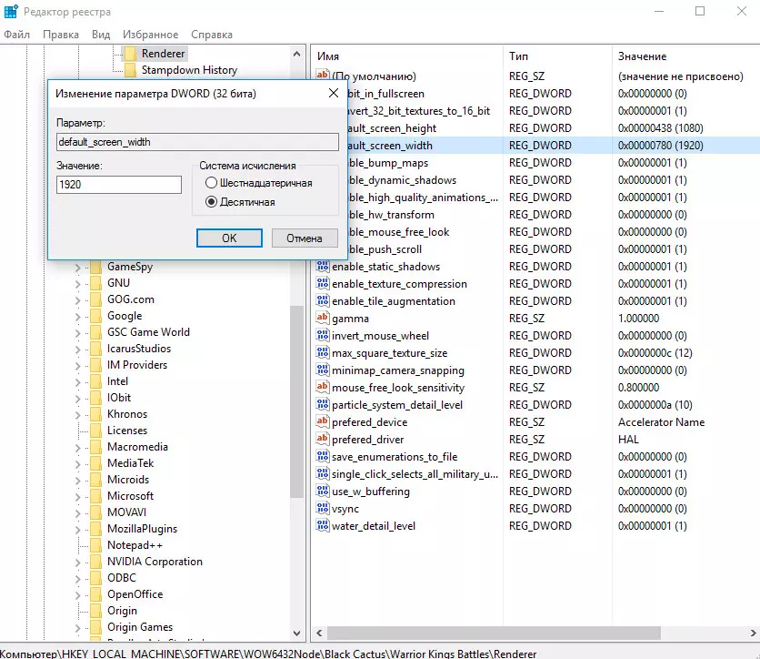 《Warrior Kings: Battles》1.1版本汉化及FullHD、QuadHD、UltraHD问题解决 汉化: 说明: -文本、语音汉化包,作者未知。 安装说明: 要求: Steam正版《Warrior Kings: Battles》1.1版本 请按照安装程序的指示操作。安装过程完全自动。该汉化包中已包含FullHD问题的解决方法,同时也提供QuadHD和UltraHD的设置选项。如果网站因某些原因被屏蔽,您可以使用免费VPN。游戏内提供了适用于全高清、2K和4K的配置文件,直接运行即可使用。您也可以自行操作 打开注册表 - Win+R 输入regedit.exe 路径:计算机 HKEY_LOCAL_MACHINE SOFTWARE WOW6432Node Black Cactus Warrior Kings Battles Renderer 将default_screen_width 修改为1920 将default_screen_height 修改为1080 进入游戏即可获得全屏高清效果 注意!需确保键值的数值基数为【十进制】(可参考下方图片)