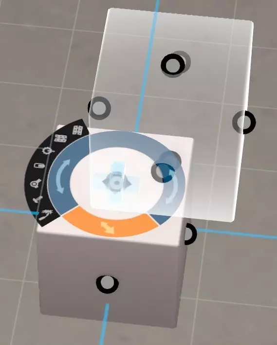 首先,我们需要进入零件编辑器。为此,请进入机器编辑器并点击目录中的加号。 在屏幕中央放置一个简单的箱子。尝试将另一个箱子放在其中一个高亮显示的点上。它们应该能完美地相互吸附。