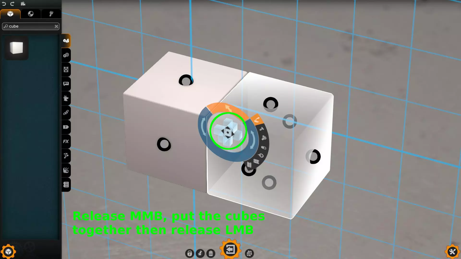 当你像这样将它们拼接在一起时,会形成一个【焊接点】。这会将两个部件合并为一个物体,并用小加号图标来表示。只有当你选中这些拼接在一起的物体时,才能看到这个加号。 现在,如果你按住Shift键的同时移动其中一个立方体,关节会保持不变。这两个立方体将始终保持相对位置关系进行移动。退出部件编辑器亲自尝试一下吧。如果你想重新进入立方体的编辑器,可以选中它并点击【螺丝刀图标】。